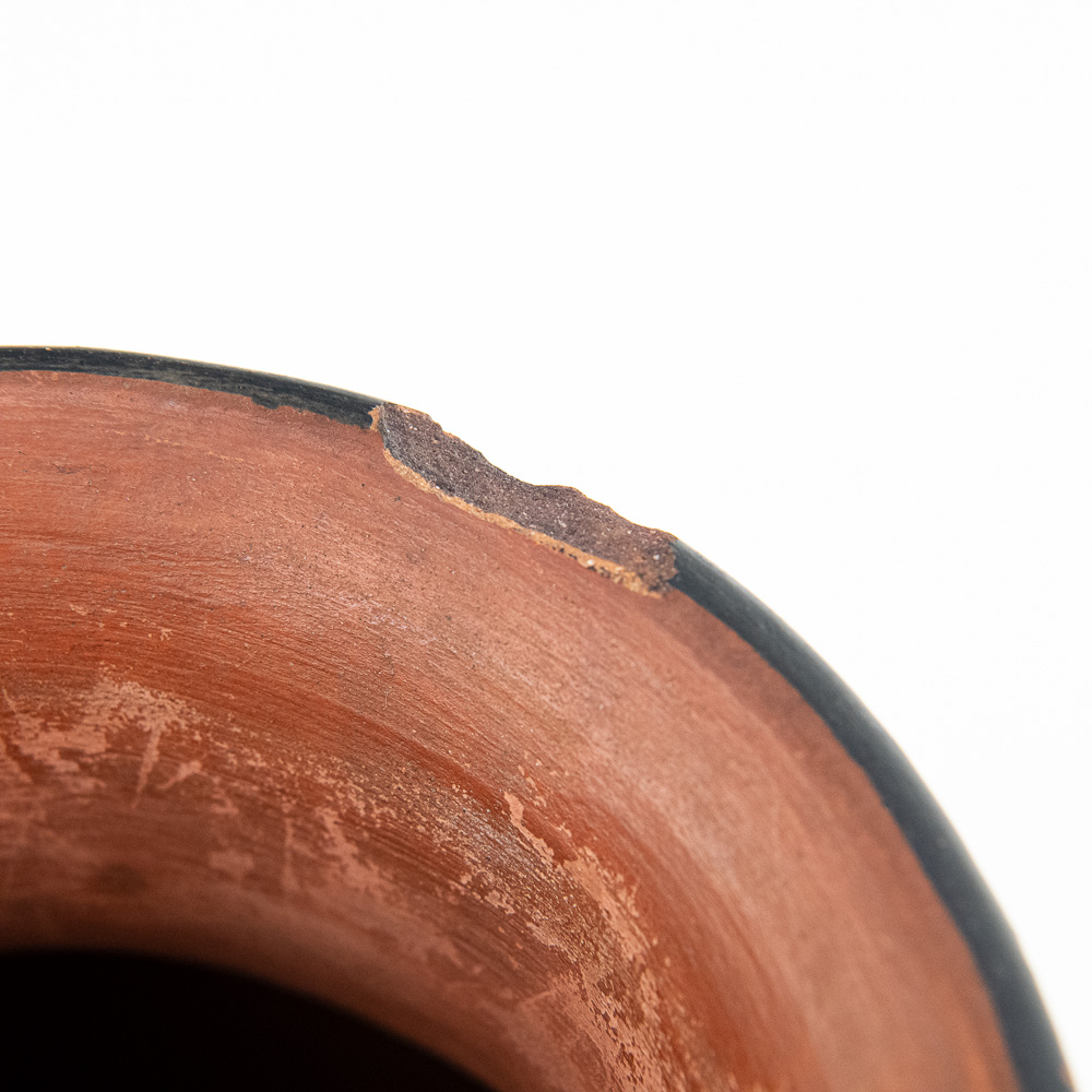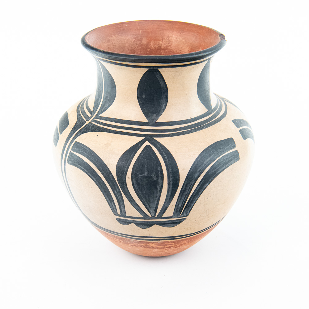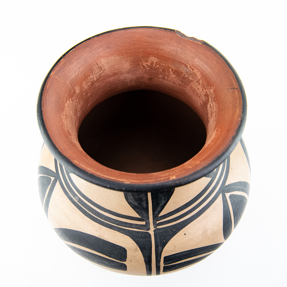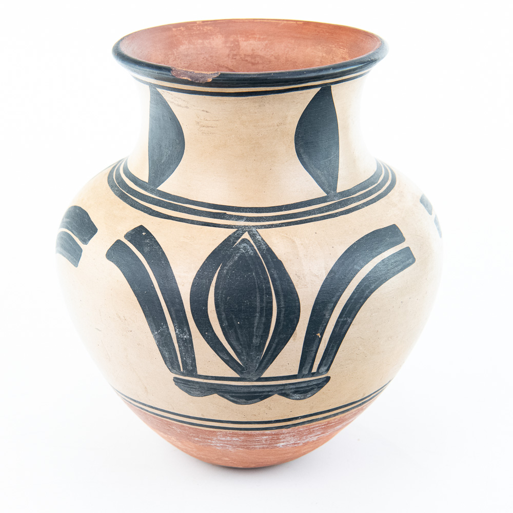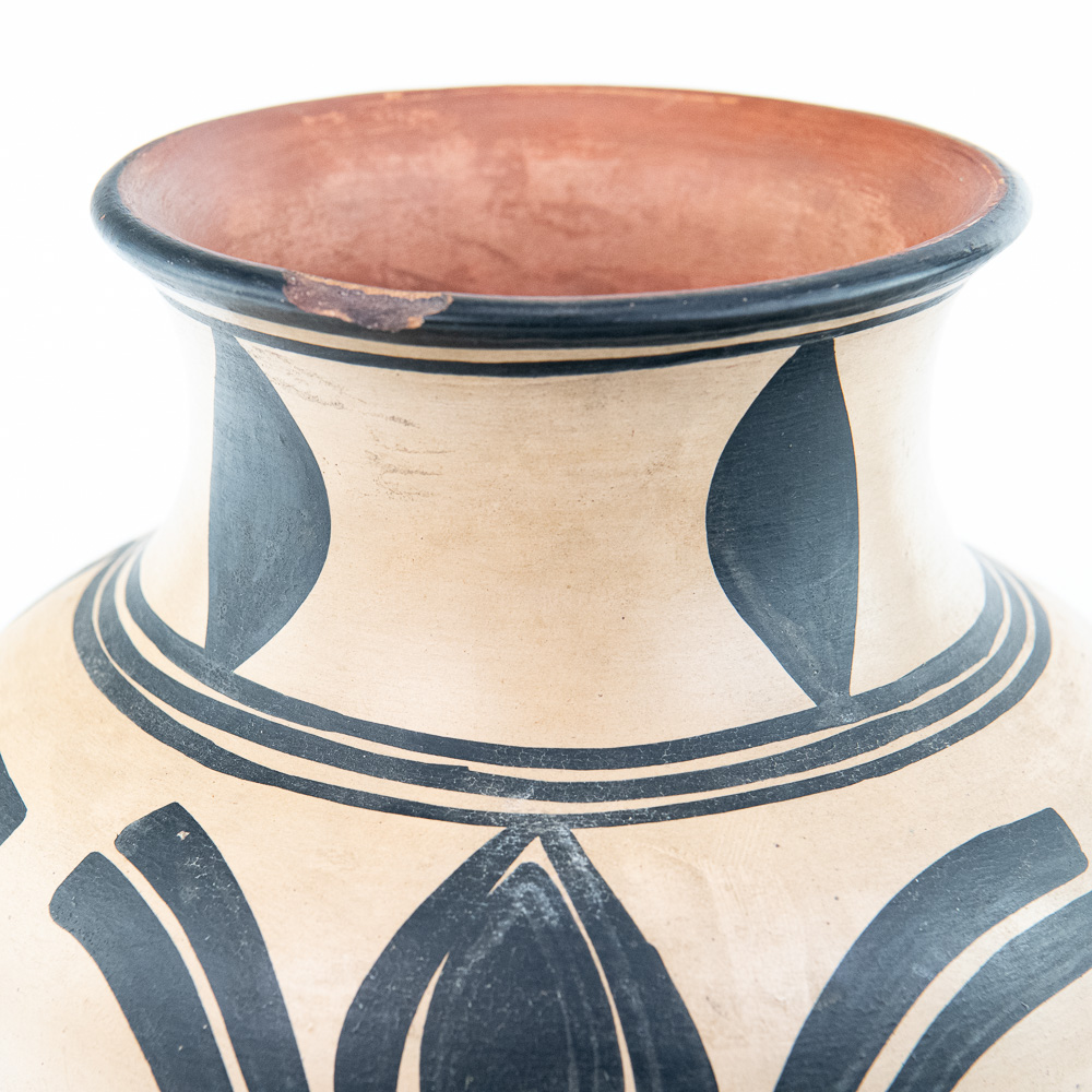 This is a beautiful piece of historic Hopi or Hopi-Tewa polychrome pottery, which showcases the enduring influence of the Sikyatki Revival style popularized by Nampeyo of Hano and her descendants starting in the late 19th and early 20th century. The classic olla form, with its globular body and restricted neck, is elegantly proportioned. The black-on-tan decoration features sophisticated, stylized Sikyatki bird or seed pod motifs and geometric banding, hand-painted over a light slip on the naturally fired terracotta clay body. Likely dated 1931 (written on base) aligns perfectly with the aesthetic of this period, a time when the daughters of Nampeyo, like Fannie and Annie, were actively potting and signing pieces was not yet standardized. The signature on the base, appearing to be “T. Kida” or “T. Kela” (which is not an immediately recognized 1930s master potter in my database), may represent a lesser-documented but equally talented artist from First Mesa, or possibly a collector’s identification mark. The item is in good vintage condition, showing considerable age-appropriate wear including multiple areas of paint abrasion and scuffing on the polychrome designs, which has softened the sharpness of the pattern. Most notably, there is a small, shallow chip visible on the exterior rim. The handwritten inscription on the base is heavily faded and only partially legible. This is a genuinely compelling piece of early 20th-century Pueblo art. H 9.5″, W 8.5″, D 8.5″ From the Native American display in Donley’s Wild West Town.