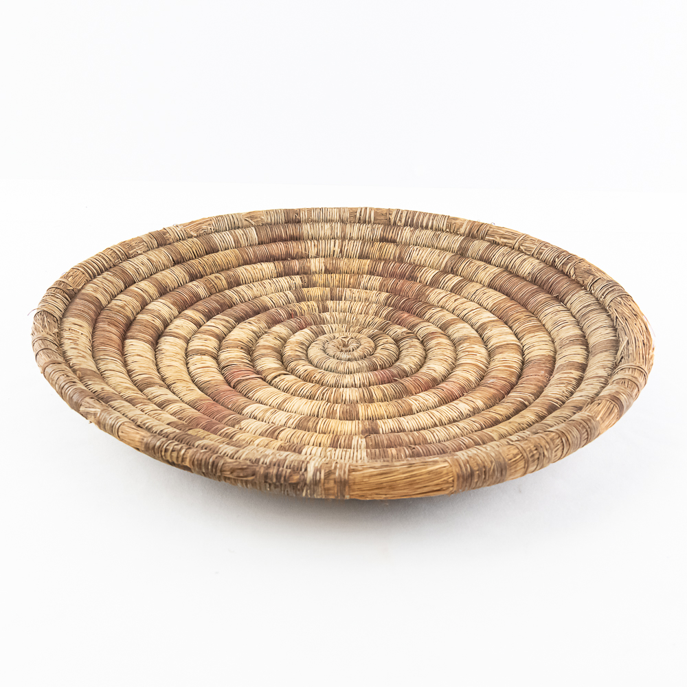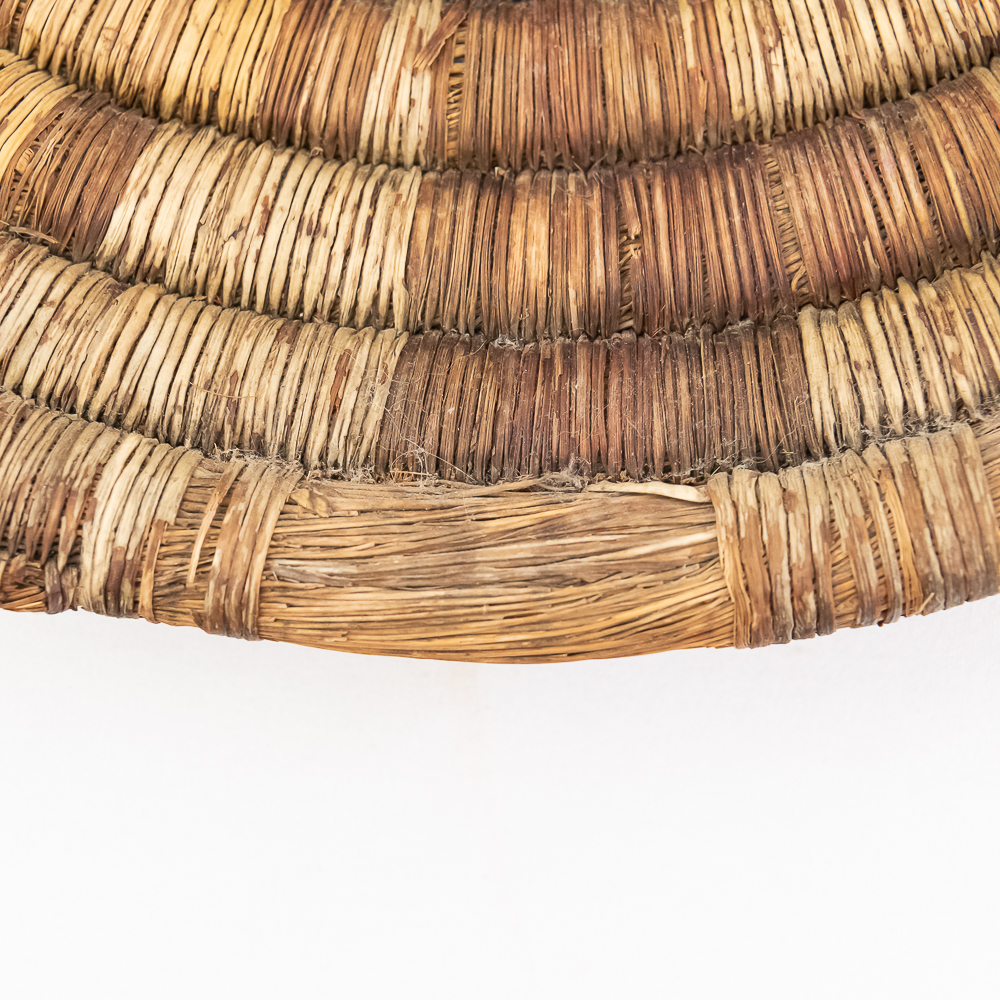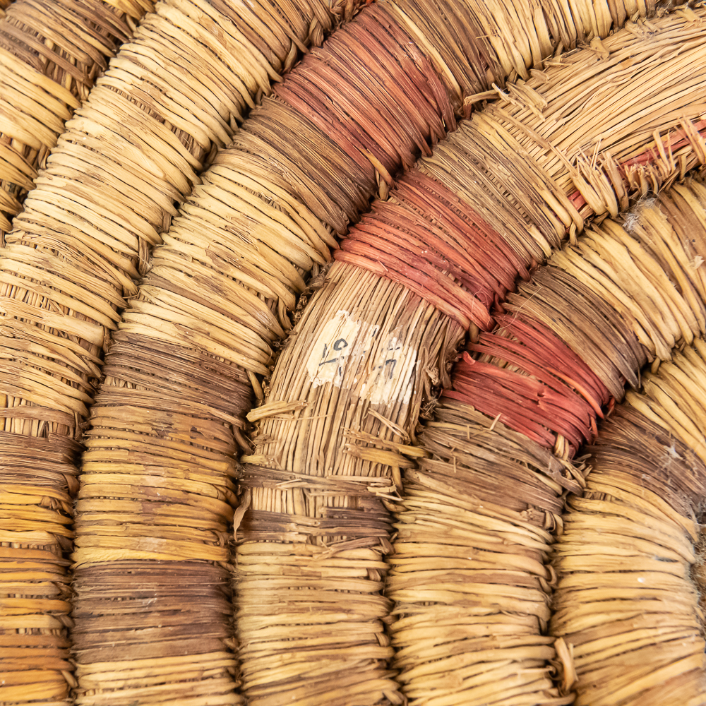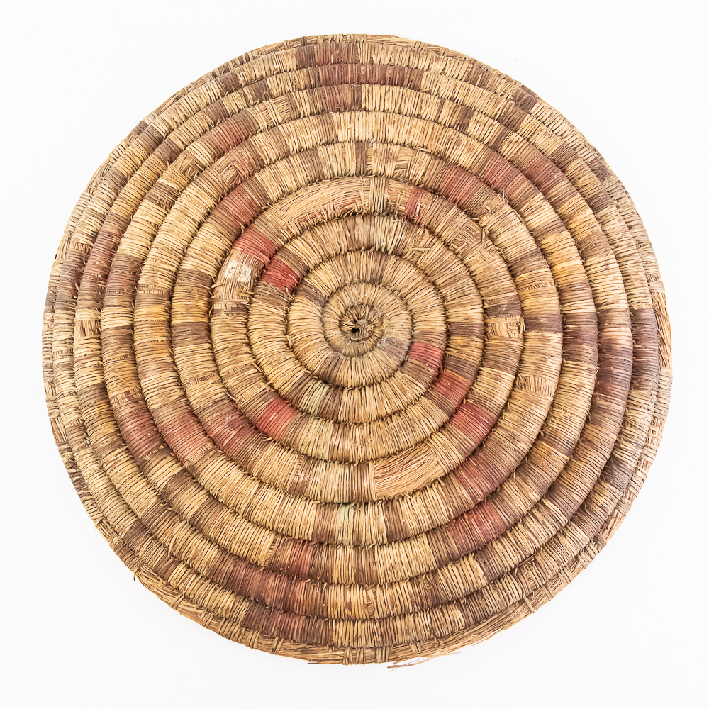 1890’s Hopi hand woven coiled plaque. Consisting of 12 tightly woven spiraling coils, with this particular piece featuring a geometric pattern. The coil wraps remain intact with nearly all present. The outer coil, which constitutes the the rim of the basket has some loss of material however, this does not affect the look of the piece, but does reflect its age and fragile nature. Trays were especially significant in Hopi culture for wedding ceremonies as gifts. A wonderful example manufactured before the rise of tourist trade art of the 1930’s. Dimensions: Diameter 15.75 depth 2.5″.