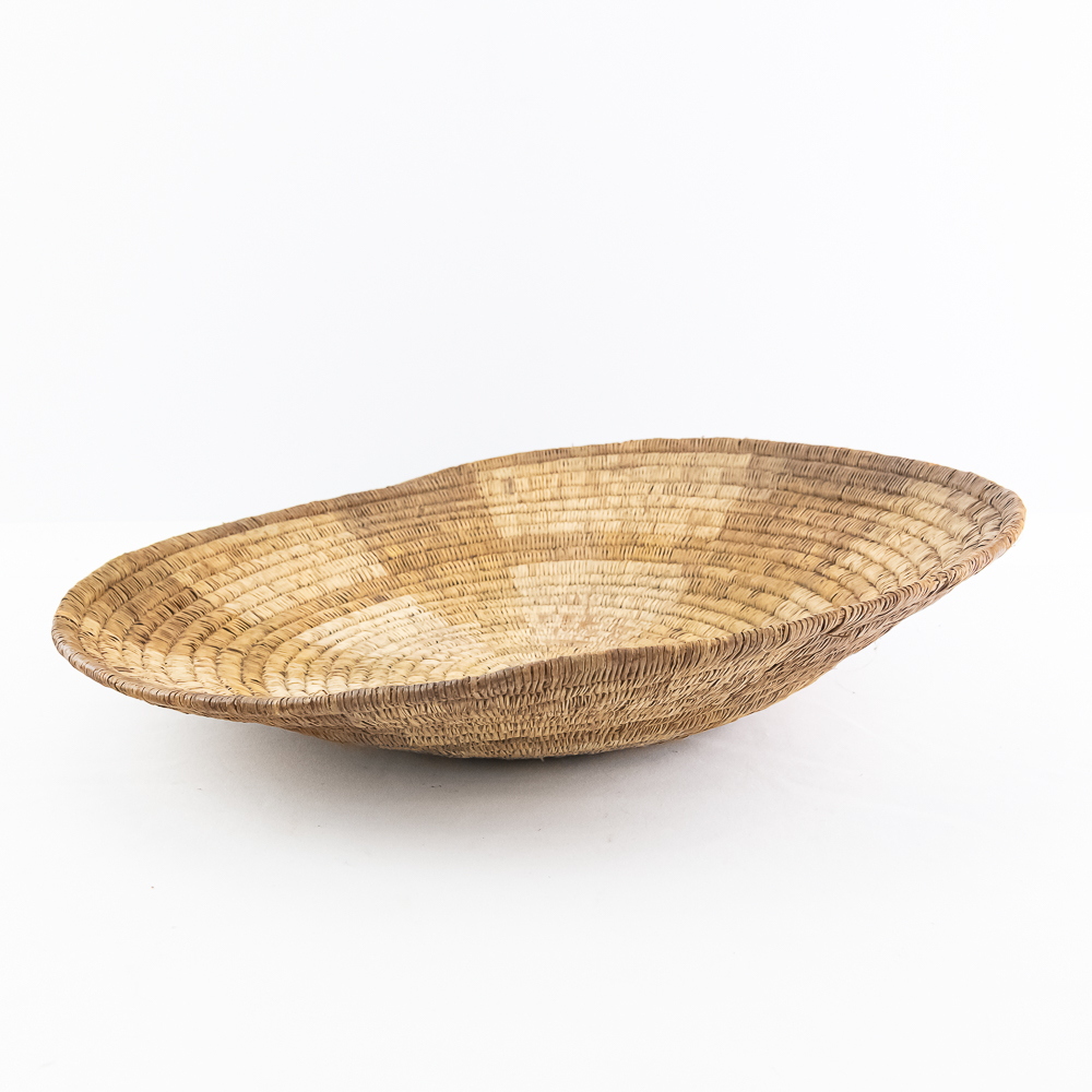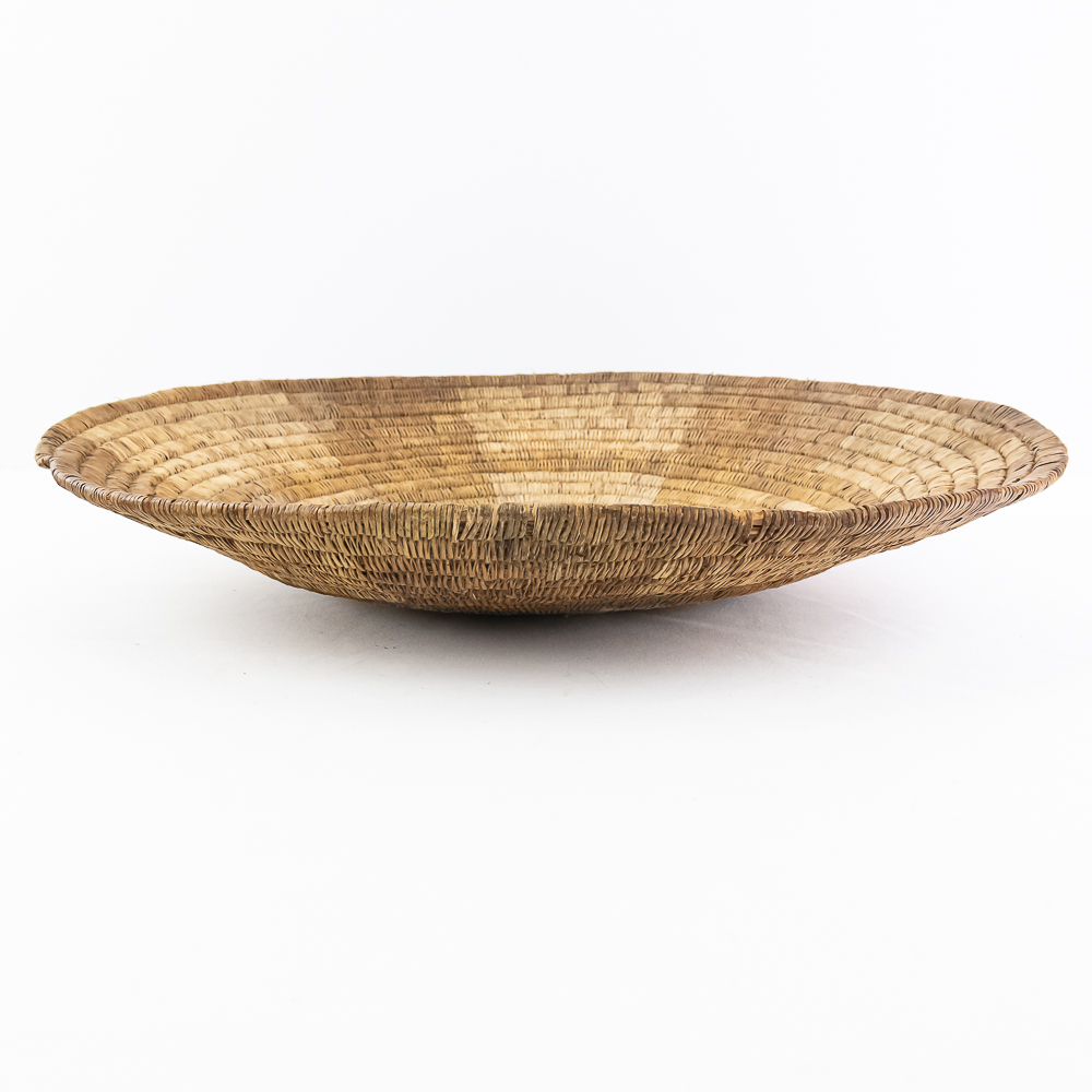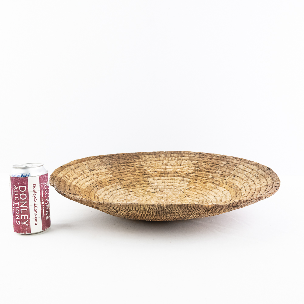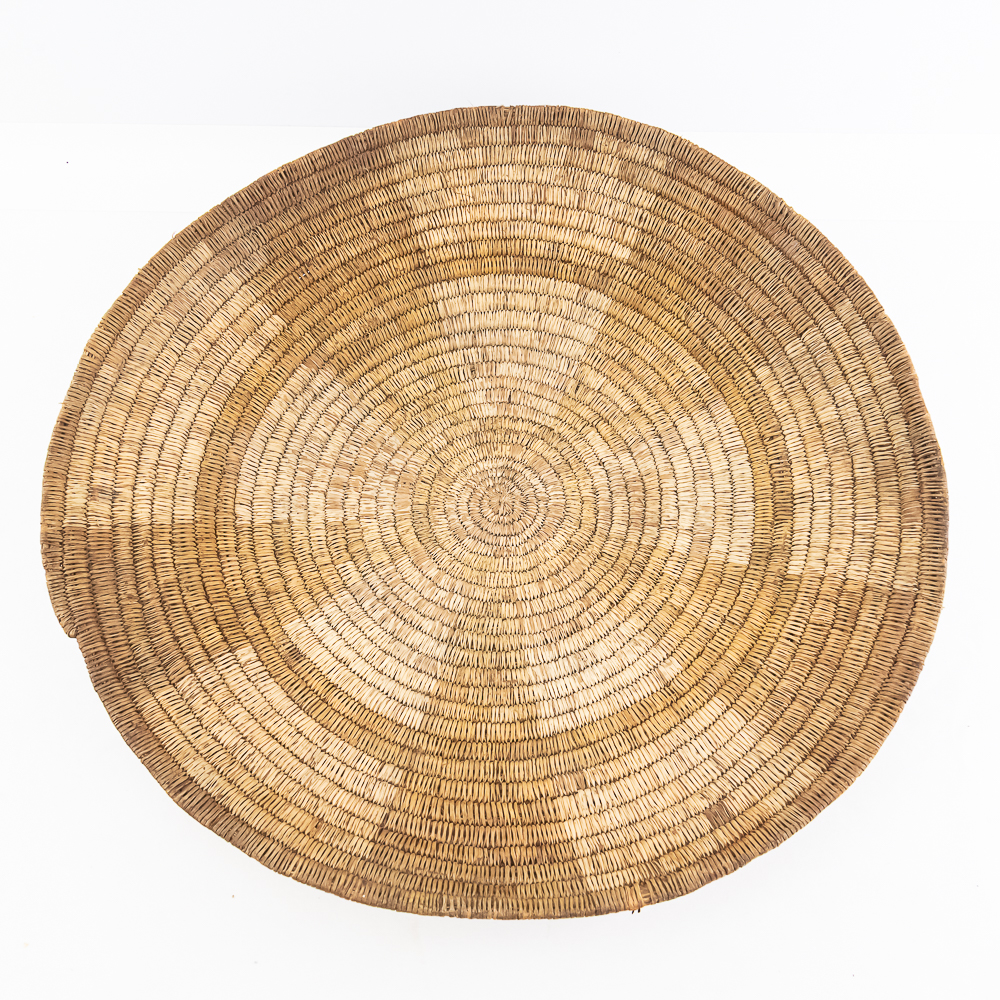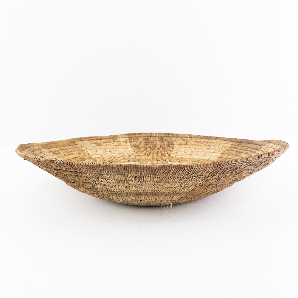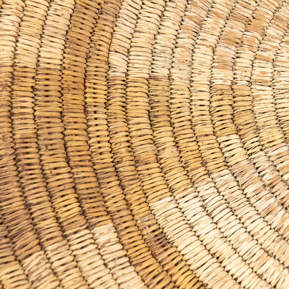 Coiled hand woven basket from Southern California, circa 1920. Often referred to as a “Mission” basket. This basket when viewed from the bottom coils clockwise, which means that it was likely Luiseno manufacture. The Luiseno or Payomkawichum peoples at the time of the first contacts with the Spanish in the 16th century, inhabited the coastal area of southern California, from the present-day southern part of Los Angeles County to the northern part of San Diego County, and inland about 30 miles. The basket displays a geometric pattern of 5 light and 5 dark rays emanating from the center, with a faint circle ring mid- way through the basket coils. There are approximately 25 coils from center to rim. The basket was displayed for many years, and has a slight lean to it. Dimensions: Diameter:19.75” and depth 3” to 4.25”.