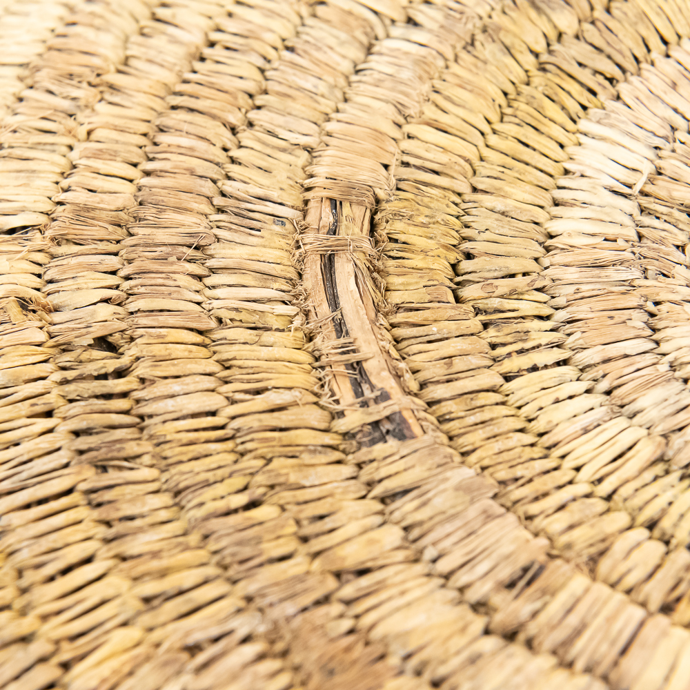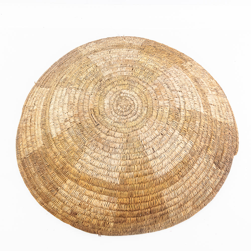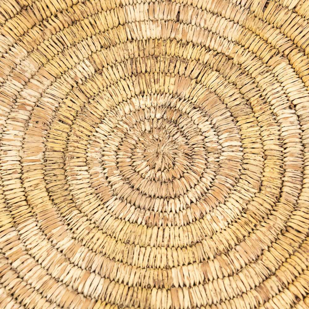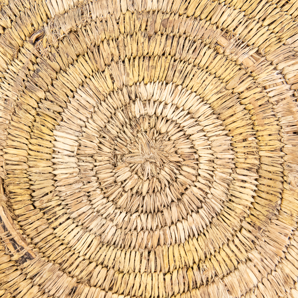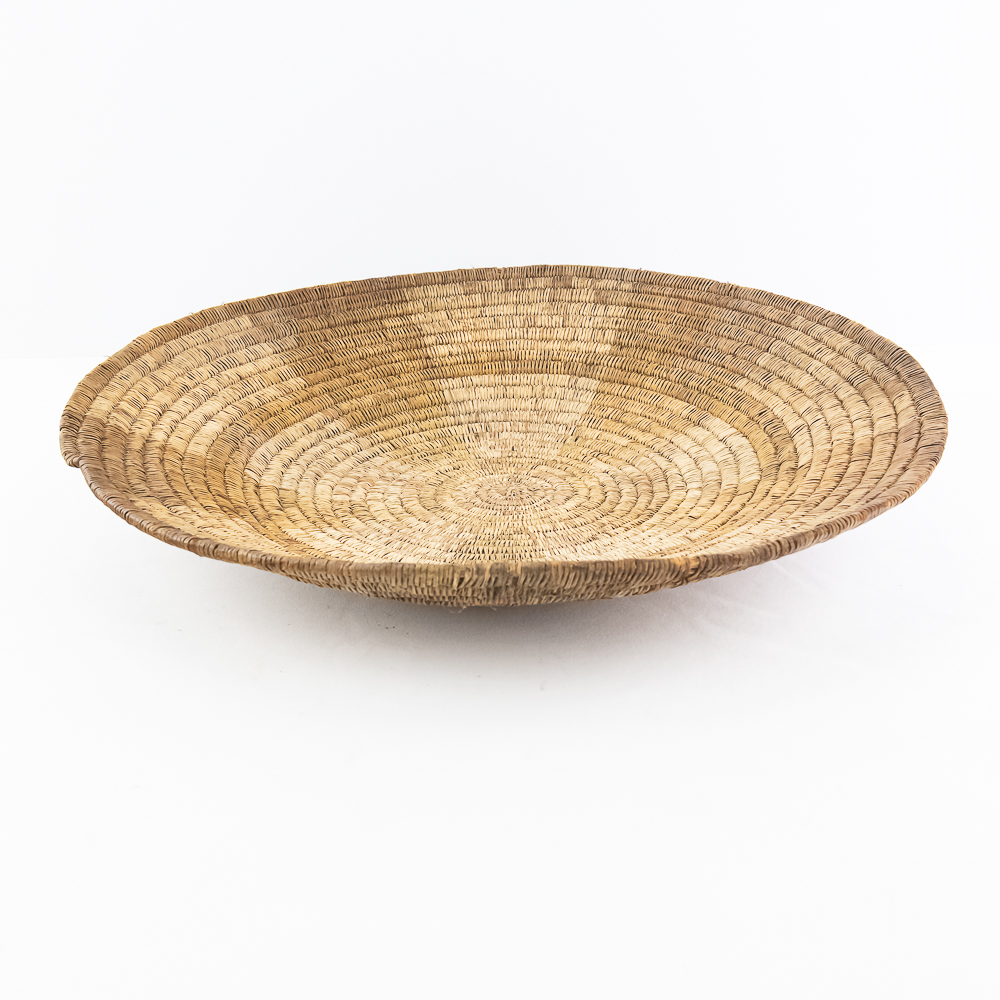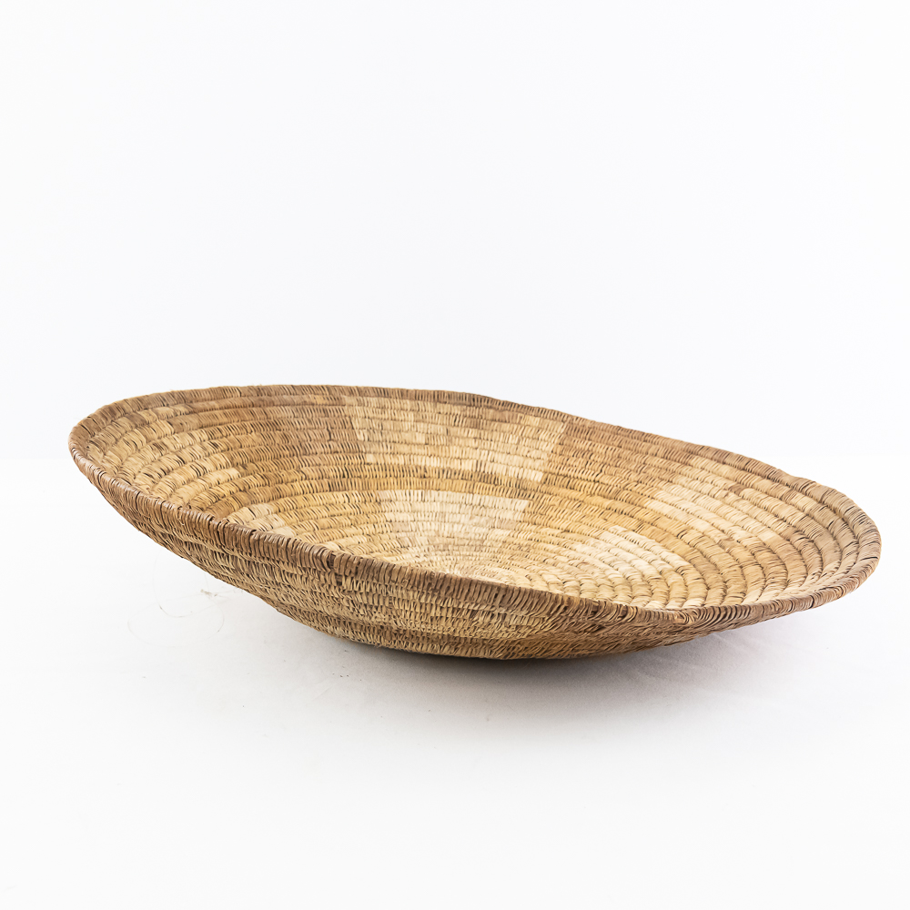 Coiled hand woven basket from Southern California, circa 1920. Often referred to as a “Mission” basket. This basket when viewed from the bottom coils clockwise, which means that it was likely Luiseno manufacture. The Luiseno or Payomkawichum peoples at the time of the first contacts with the Spanish in the 16th century, inhabited the coastal area of southern California, from the present-day southern part of Los Angeles County to the northern part of San Diego County, and inland about 30 miles. The basket displays a geometric pattern of 5 light and 5 dark rays emanating from the center, with a faint circle ring mid- way through the basket coils. There are approximately 25 coils from center to rim. The basket was displayed for many years, and has a slight lean to it. Dimensions: Diameter:19.75” and depth 3” to 4.25”.