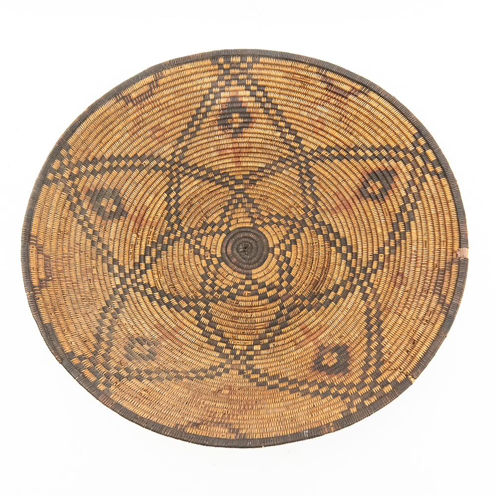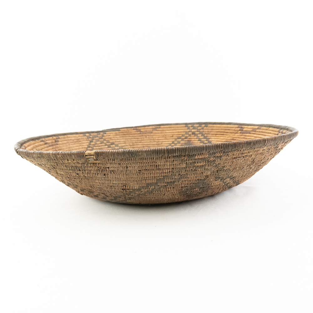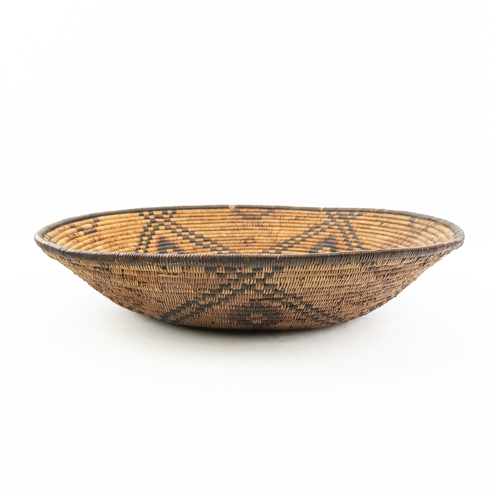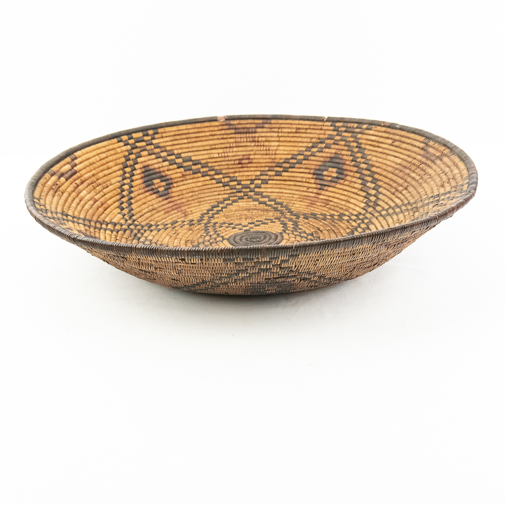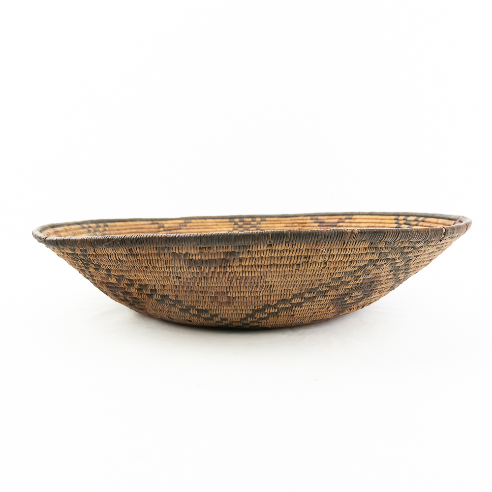 A finely woven coiled basket tray or shallow bowl, circa 1910. While its characteristic strongly aligns with Western Apache coiled basketry, there’s a possibility that it could be Jicarilla Apache, as both groups produced impressive, coiled baskets with geometric designs during this era. The foundation is a stiff 3-rod foundation, visible on a break at the rim. The basket is crafted from natural plant material with lighter golden sections, likely willow or sumac, forming the background and contrasting with the dark brown slash black elements derived from devil’s claw or other natural dyes. The natural aging process of the fibers over more than a century has contributed to the soft mellow patina visible. The rim of the basket is reinforced with a darker edge. The design features a complex geometric motif, which expands radially from the center dark “eye”. The pattern is composed of recurring diamond or stepped triangular shapes rendering a stark contrast with the lighter background. Aside from the break at the rim (about three coils deep), it is in good, stable condition with loss of weave commensurate with age and use. Dimensions: 18 diameter, 4” tall, approximately 10” base diameter. Please see photos.