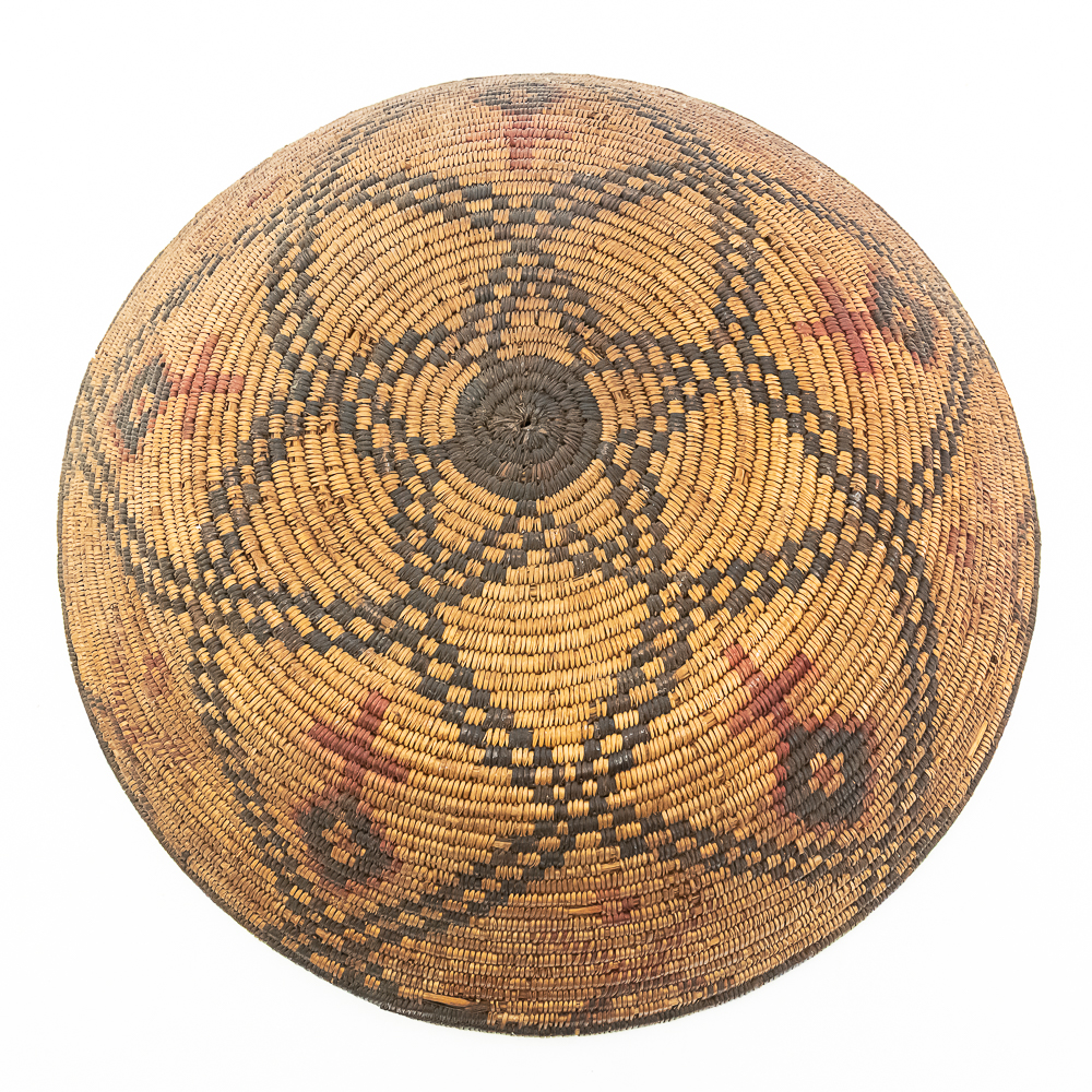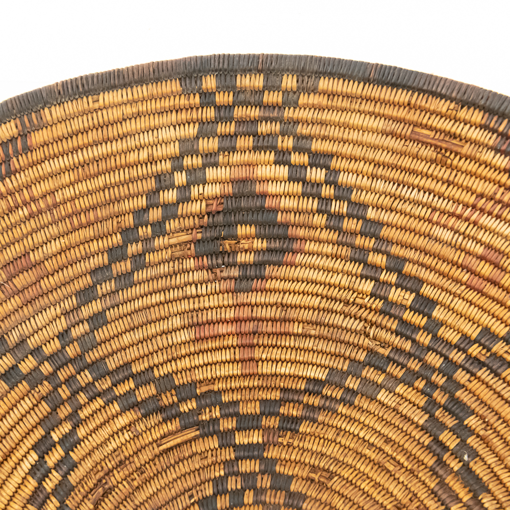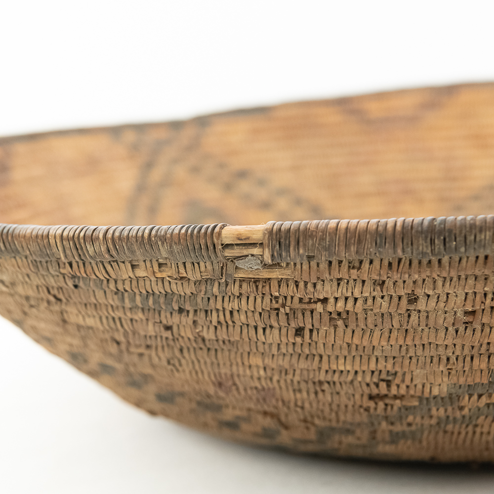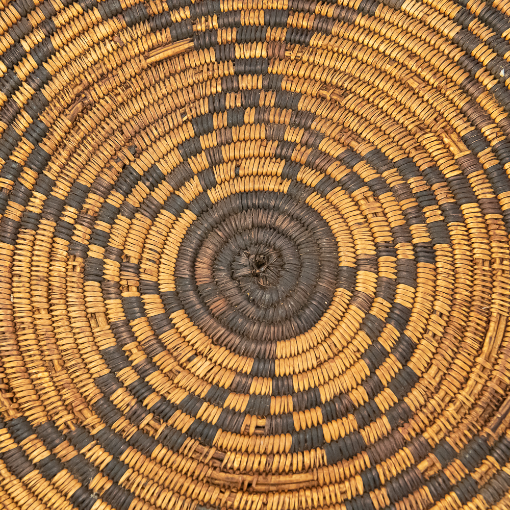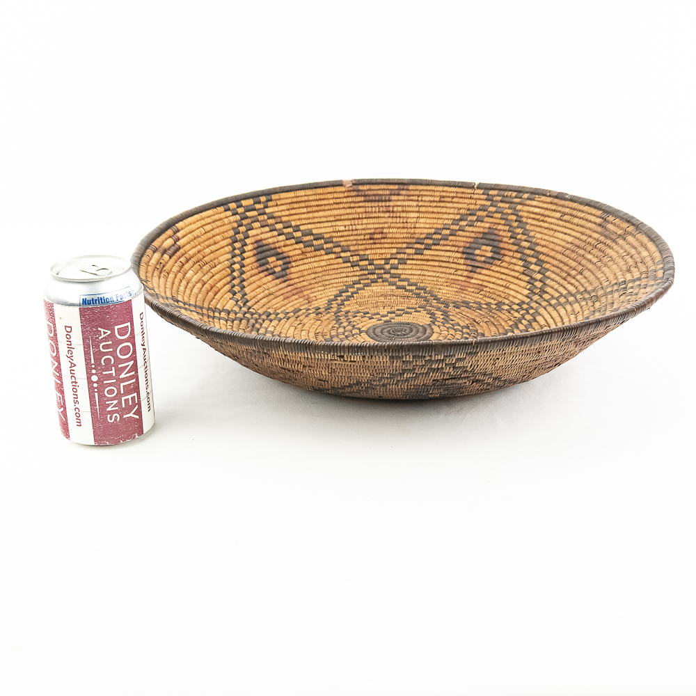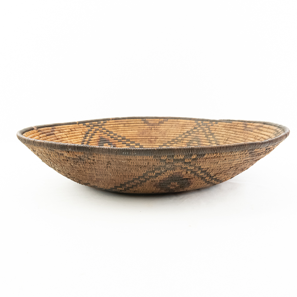 A finely woven coiled basket tray or shallow bowl, circa 1910. While its characteristic strongly aligns with Western Apache coiled basketry, there’s a possibility that it could be Jicarilla Apache, as both groups produced impressive, coiled baskets with geometric designs during this era. The foundation is a stiff 3-rod foundation, visible on a break at the rim. The basket is crafted from natural plant material with lighter golden sections, likely willow or sumac, forming the background and contrasting with the dark brown slash black elements derived from devil’s claw or other natural dyes. The natural aging process of the fibers over more than a century has contributed to the soft mellow patina visible. The rim of the basket is reinforced with a darker edge. The design features a complex geometric motif, which expands radially from the center dark “eye”. The pattern is composed of recurring diamond or stepped triangular shapes rendering a stark contrast with the lighter background. Aside from the break at the rim (about three coils deep), it is in good, stable condition with loss of weave commensurate with age and use. Dimensions: 18 diameter, 4” tall, approximately 10” base diameter. Please see photos.