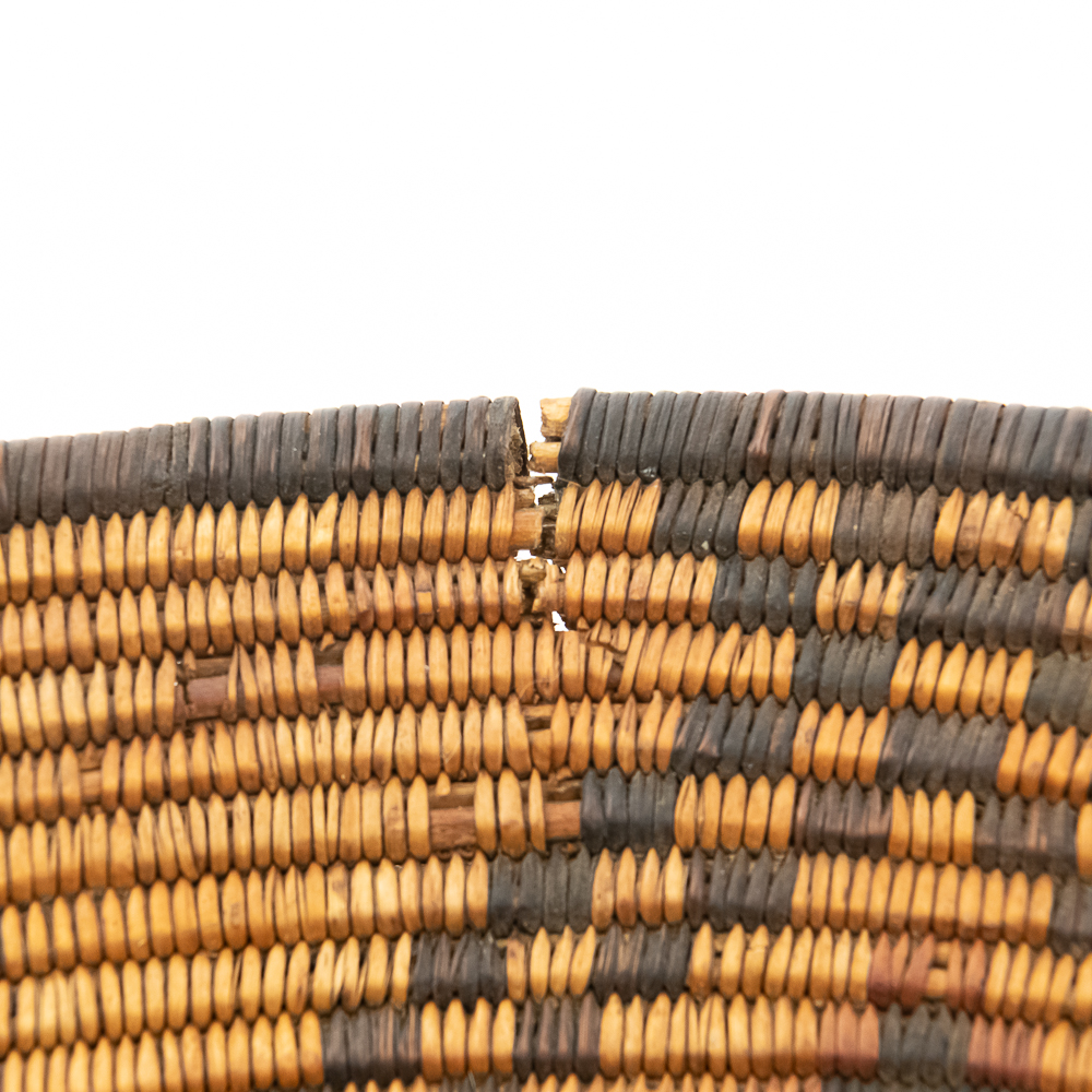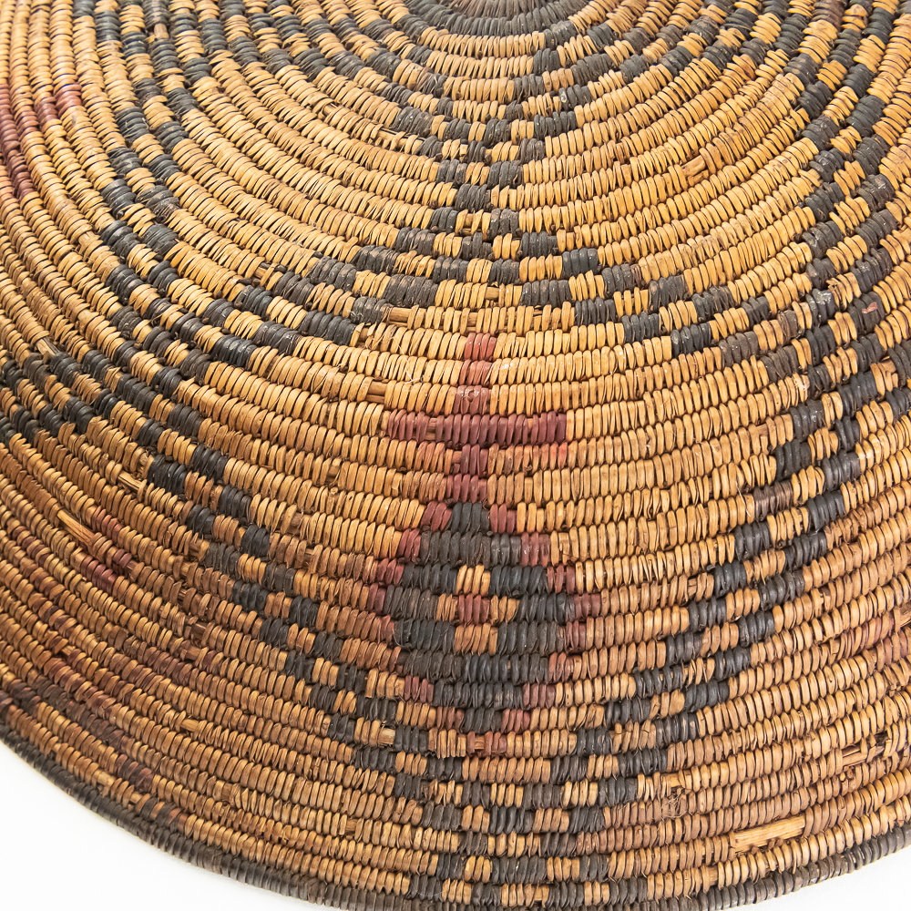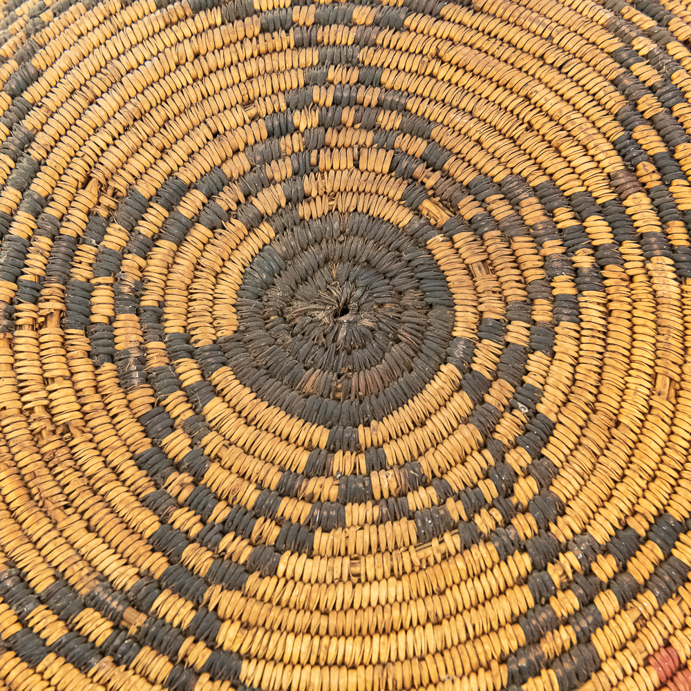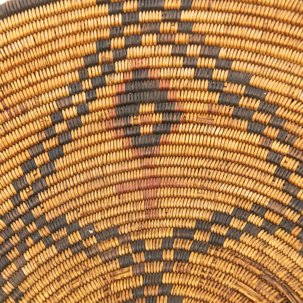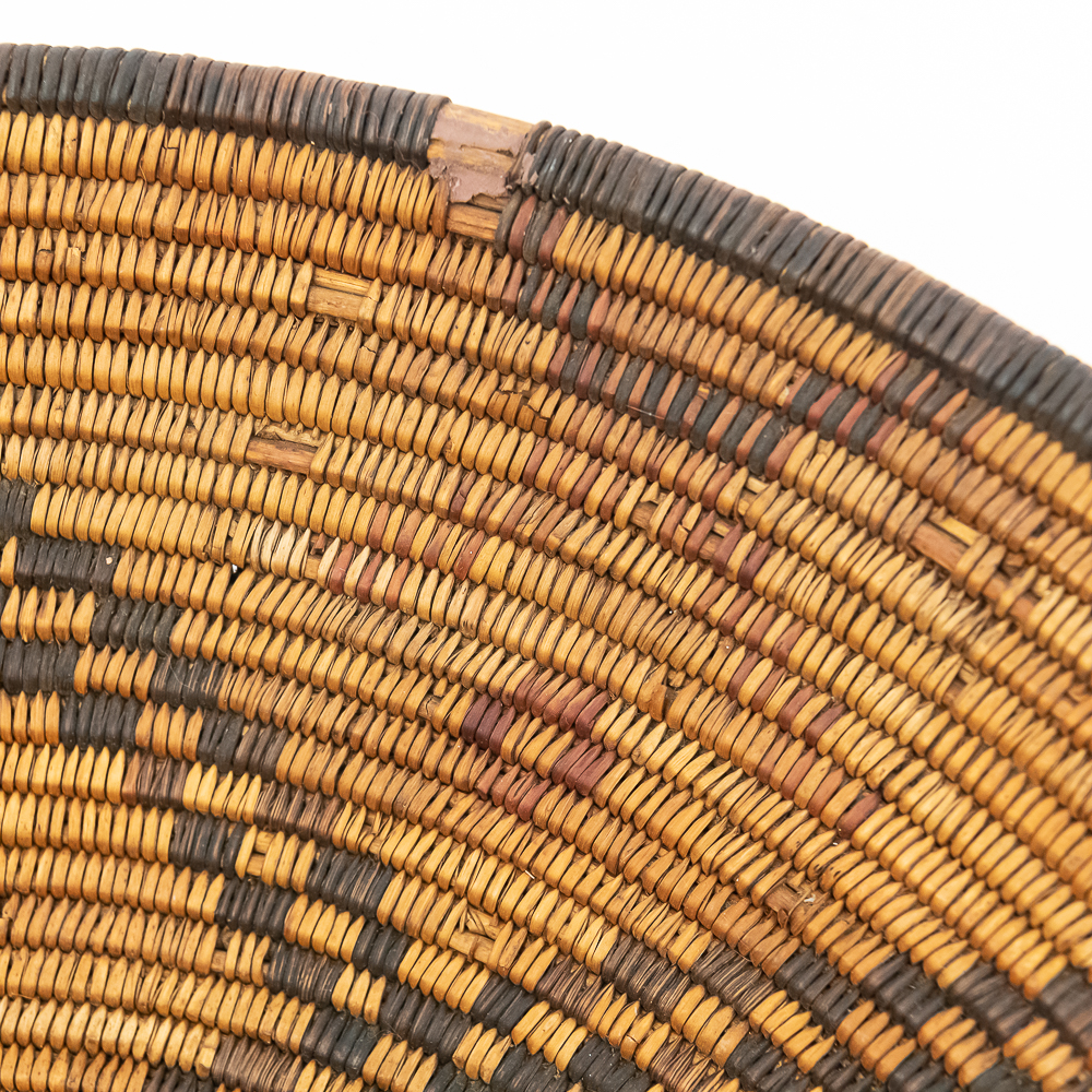 A finely woven coiled basket tray or shallow bowl, circa 1910. While its characteristic strongly aligns with Western Apache coiled basketry, there’s a possibility that it could be Jicarilla Apache, as both groups produced impressive, coiled baskets with geometric designs during this era. The foundation is a stiff 3-rod foundation, visible on a break at the rim. The basket is crafted from natural plant material with lighter golden sections, likely willow or sumac, forming the background and contrasting with the dark brown slash black elements derived from devil’s claw or other natural dyes. The natural aging process of the fibers over more than a century has contributed to the soft mellow patina visible. The rim of the basket is reinforced with a darker edge. The design features a complex geometric motif, which expands radially from the center dark “eye”. The pattern is composed of recurring diamond or stepped triangular shapes rendering a stark contrast with the lighter background. Aside from the break at the rim (about three coils deep), it is in good, stable condition with loss of weave commensurate with age and use. Dimensions: 18 diameter, 4” tall, approximately 10” base diameter. Please see photos.