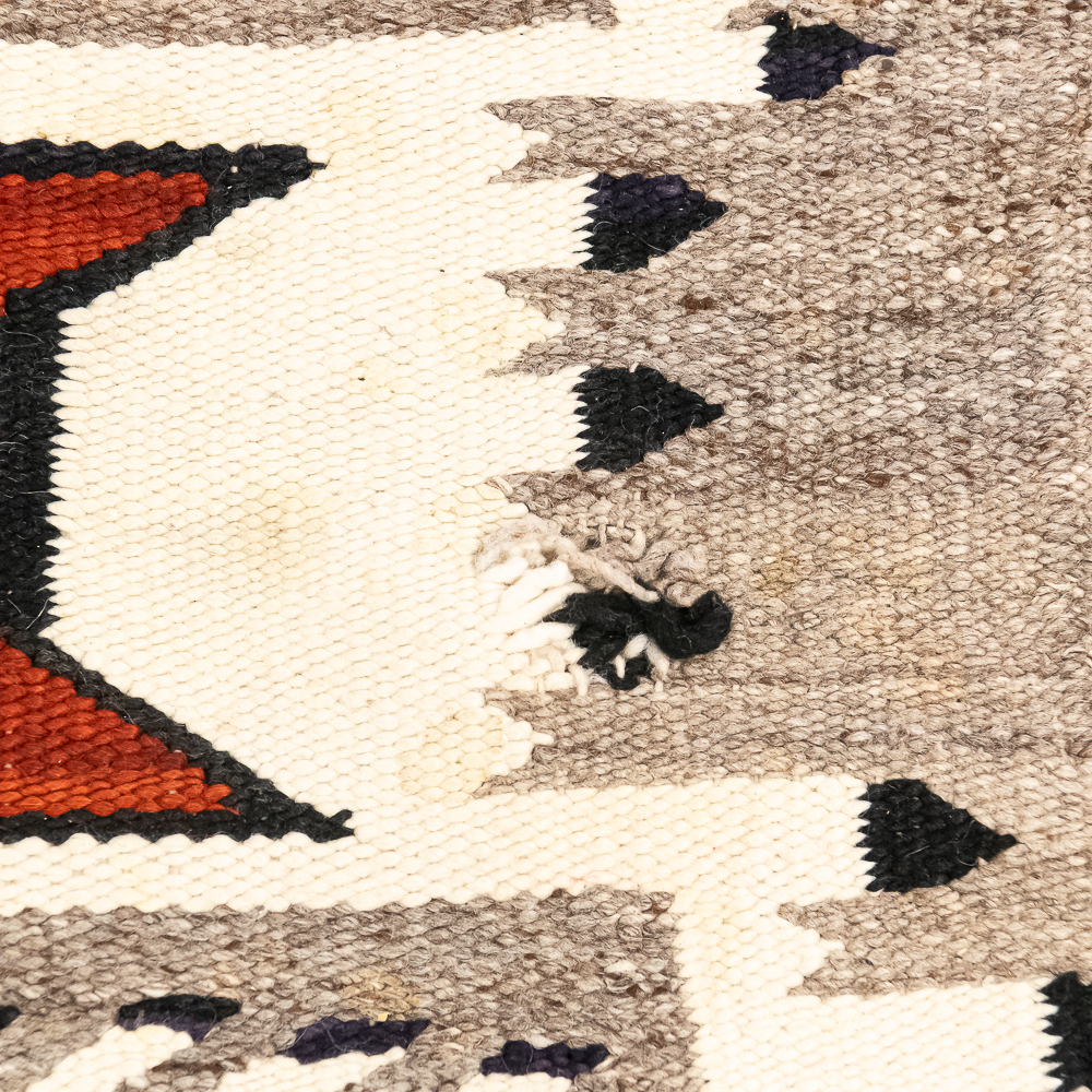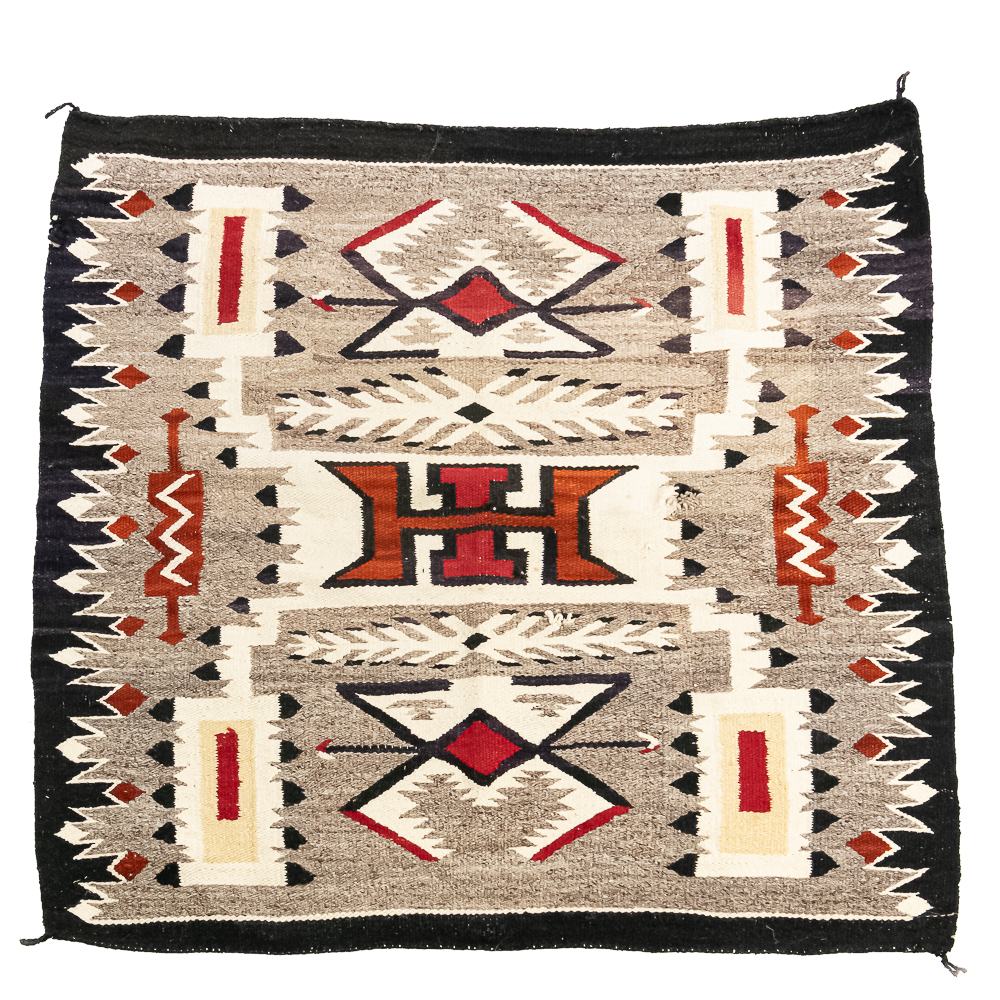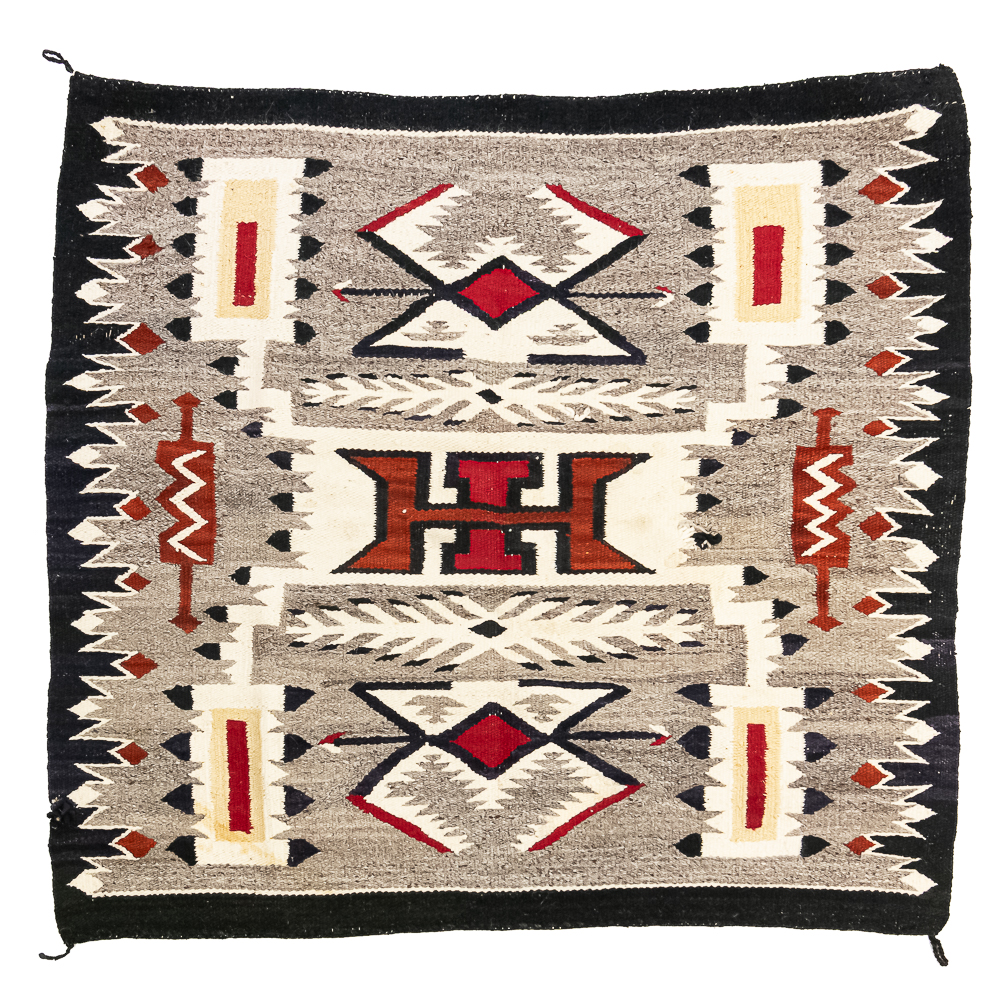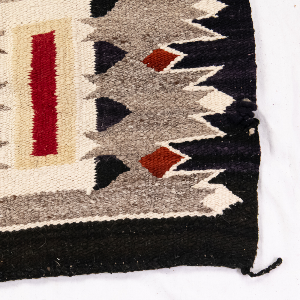 Mid-20th century Navajo Storm Pattern blanket/rug. Design features a central rectangular motif traditionally interpreted as a Hogan or the center of the universe rendered in bold red, black, cream and white. The characteristic geometric corner elements possibly representing natural forces radiate inwards and are connected to the central design by dynamic diagonal lightning lines the rug boasts a palette of black/dark indigo Gray and vibrant red contrasted by cream off white accents. Finished with a defined dark border hand woven with a tight weave this piece exhibits the unique artistry and traditional symbolism of Navajo textile traditions. Overall condition is good, with three repairable areas exhibiting wear through in the central area of the design, as well as on its edge. One spot is approximately 1” diameter and the other two approximately 2.25” diameter. Dimensions: 52” x48”. See photos.
