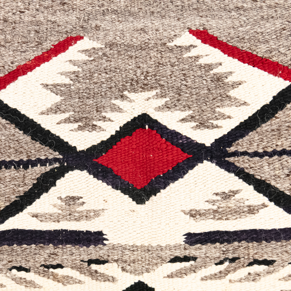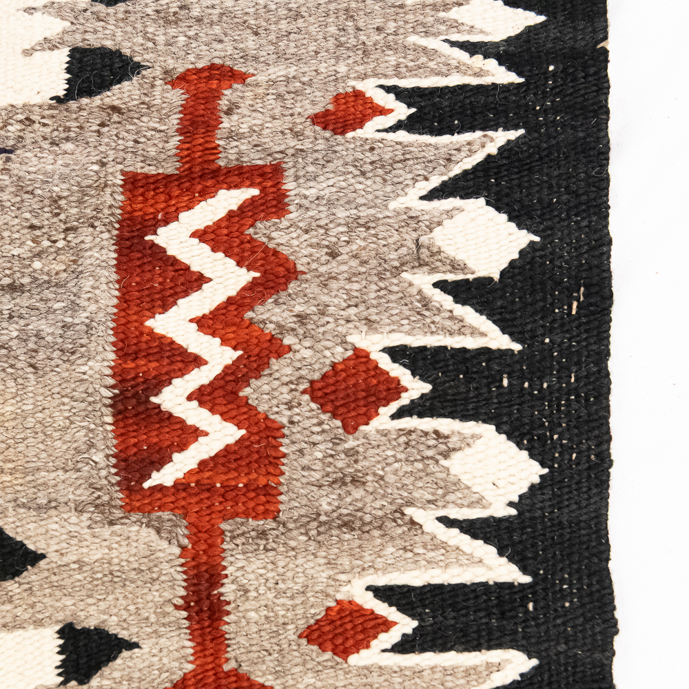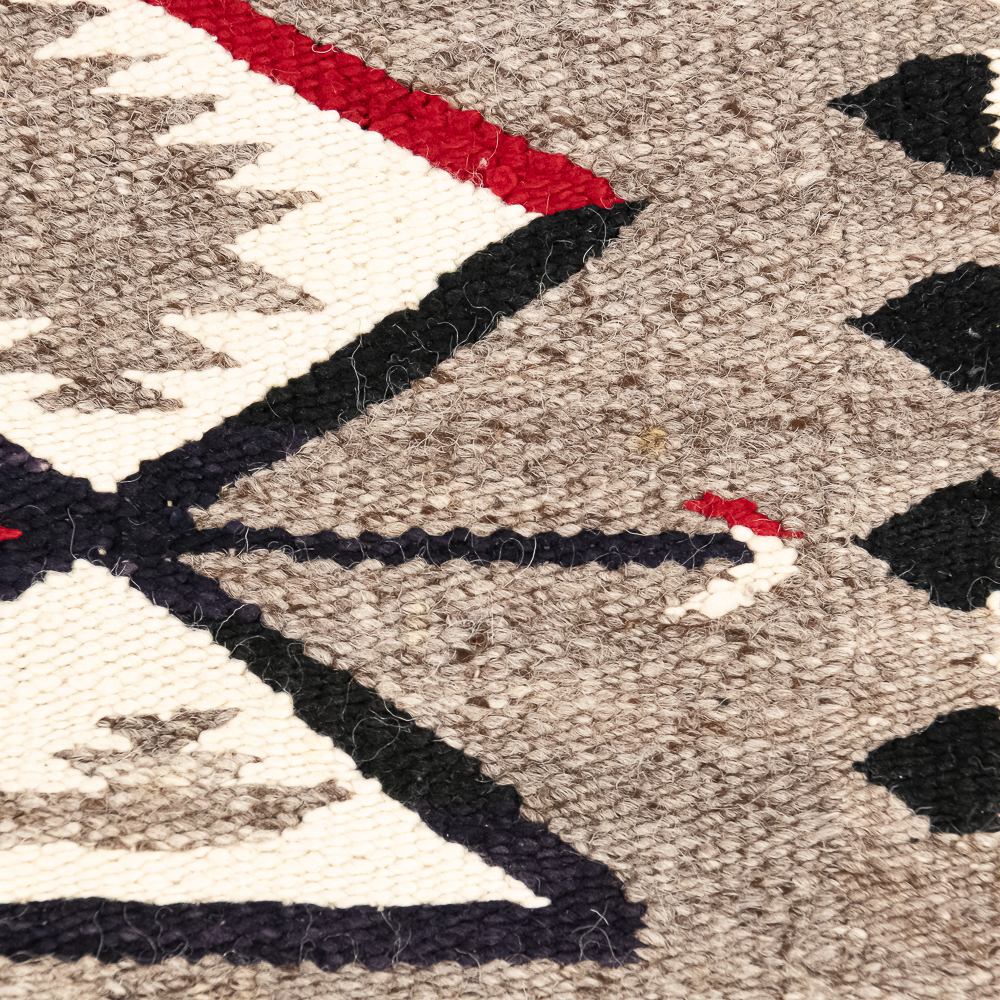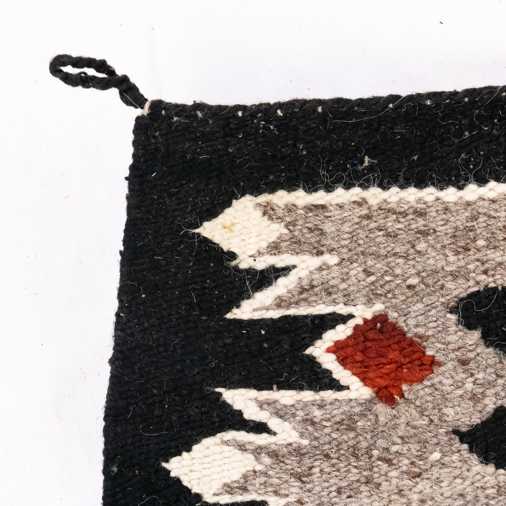 Mid-20th century Navajo Storm Pattern blanket/rug. Design features a central rectangular motif traditionally interpreted as a Hogan or the center of the universe rendered in bold red, black, cream and white. The characteristic geometric corner elements possibly representing natural forces radiate inwards and are connected to the central design by dynamic diagonal lightning lines the rug boasts a palette of black/dark indigo Gray and vibrant red contrasted by cream off white accents. Finished with a defined dark border hand woven with a tight weave this piece exhibits the unique artistry and traditional symbolism of Navajo textile traditions. Overall condition is good, with three repairable areas exhibiting wear through in the central area of the design, as well as on its edge. One spot is approximately 1” diameter and the other two approximately 2.25” diameter. Dimensions: 52” x48”. See photos.
