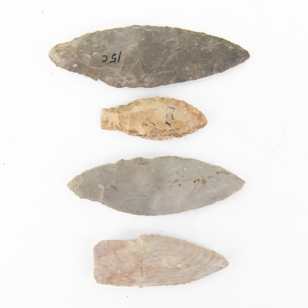 These are four finely crafted flint/chert projectile points, typical of prehistoric North American cultures, likely ranging from the Paleo-Indian to the Archaic periods. The two larger points on the left appear to be lanceolate forms, possibly Dalton or similar early styles, showcasing expert bifacial flaking and a dense, dark gray-brown chert material. The two smaller, stemmed points on the right are more characteristic of later Archaic arrowheads or dart points, with the smallest exhibiting a reddish-tan chert. All four pieces display tool marks from their creation, with the overall form and workmanship indicative of skilled lithic reduction. Visible inventory numbers are marked in black ink on the faces of all four artifacts (“15C,” “15B,” “123,” and a partial “121”). Condition is generally excellent, showing original flaking and expected evidence of use, age, and natural patination; there are no major breaks or modern chips. Estimated largest point: H 4.75″, W 1.75″. Estimated smallest point: H 2.25″, W 1.0″. From the Native American display in Donley’s Wild West Town.