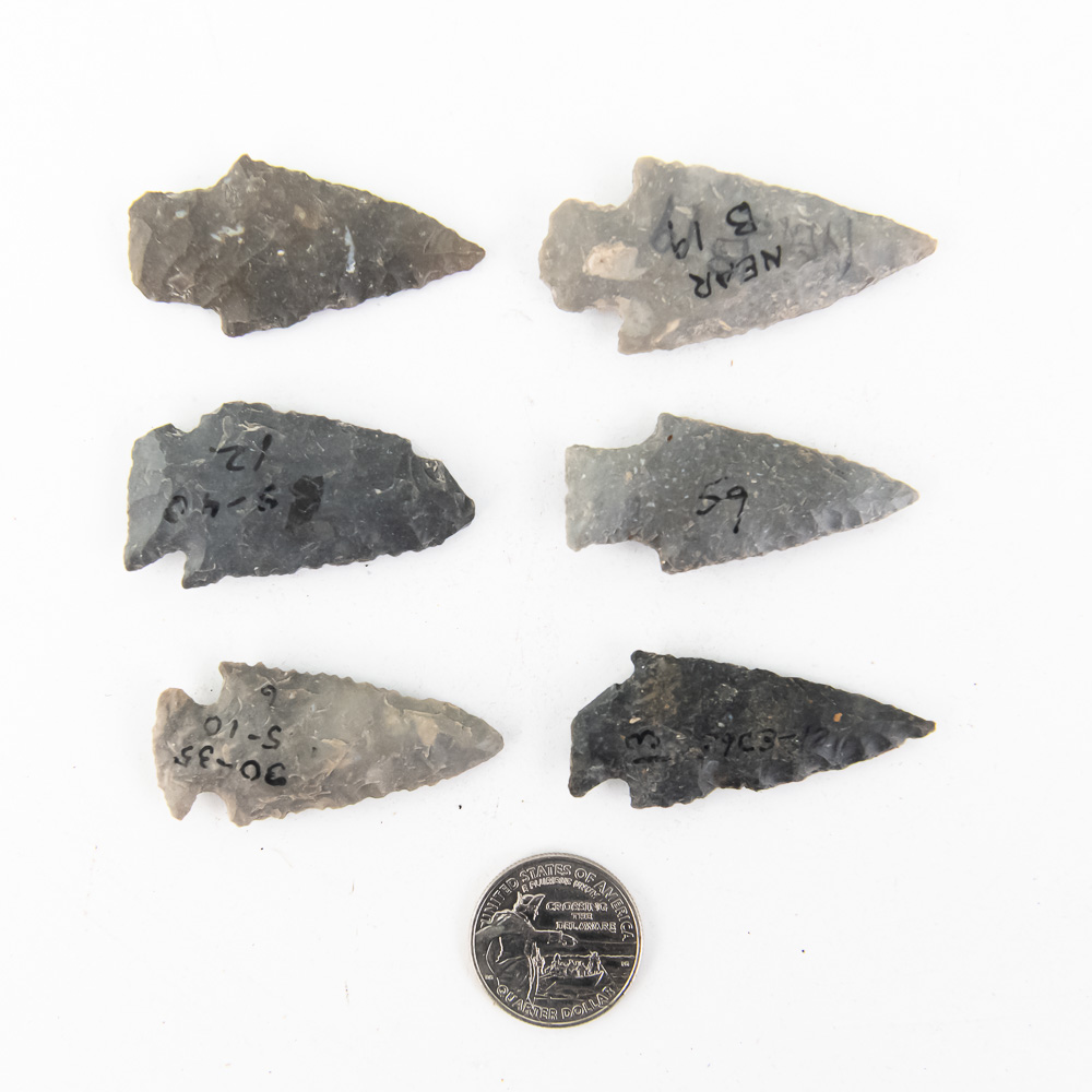 This is a very nice set of six prehistoric projectile points, likely curated from multiple archaeological contexts, as suggested by the varying styles, lithic materials, and visible collection markings. The collection includes notched and stemmed points, typical of the Late Archaic to Woodland periods, crafted from various dark chert and flint materials, exhibiting the classic bifacial percussion and pressure flaking of skilled knappers. The points are accompanied by visible collection inventory numbers and notations on their faces, such as “NEAR B 1A” and “BC,” which are important for tracing their provenance. The points are in generally good excavated condition, consistent with authentic artifacts, though they exhibit expected wear, small chips, and minor basal grinding from use, age, and recovery. The points are within the provided measurement range. H 2.25″, W 1″ (max est. for largest point). From the Native American display in Donley’s Wild West Town.