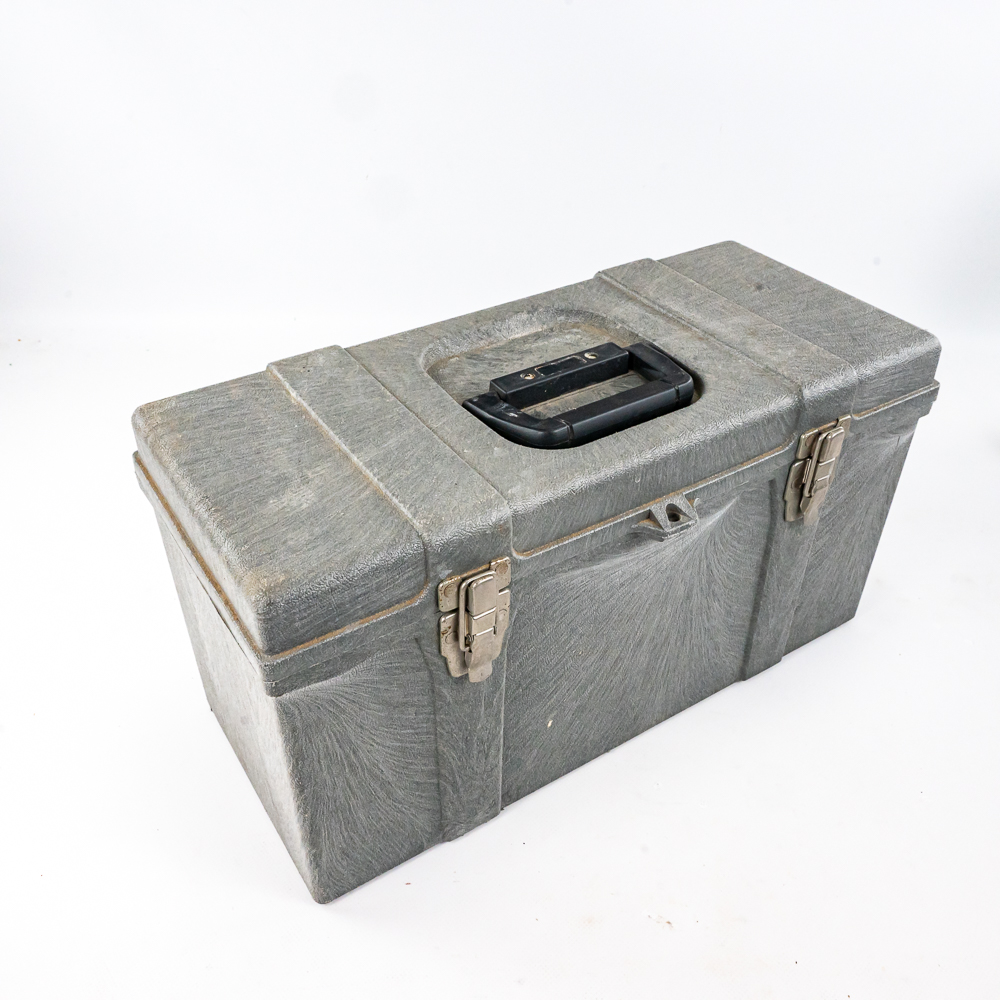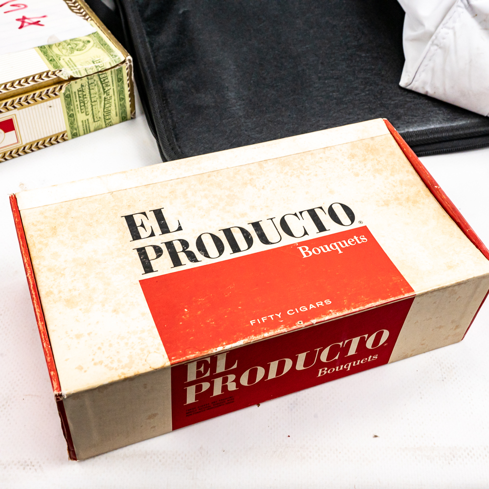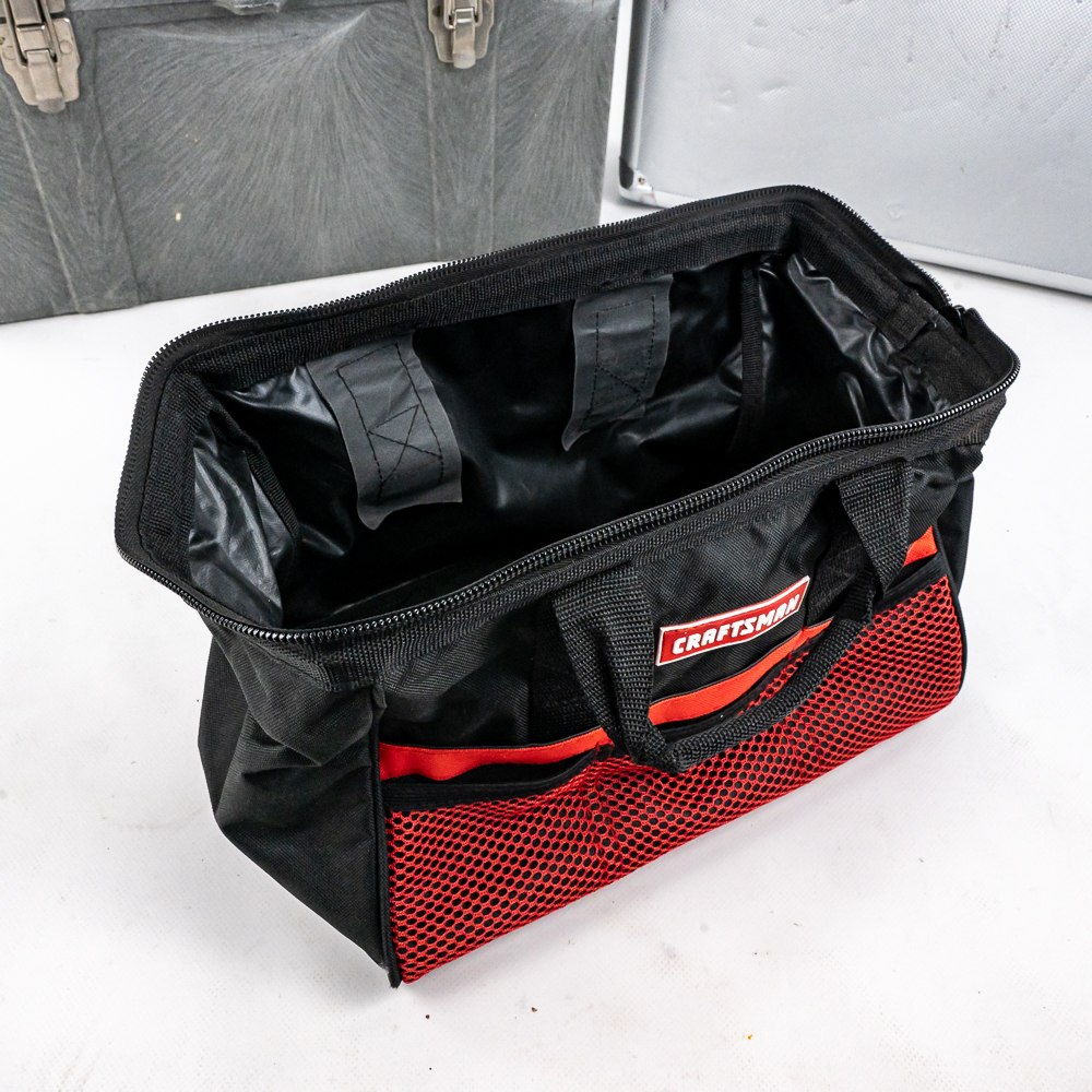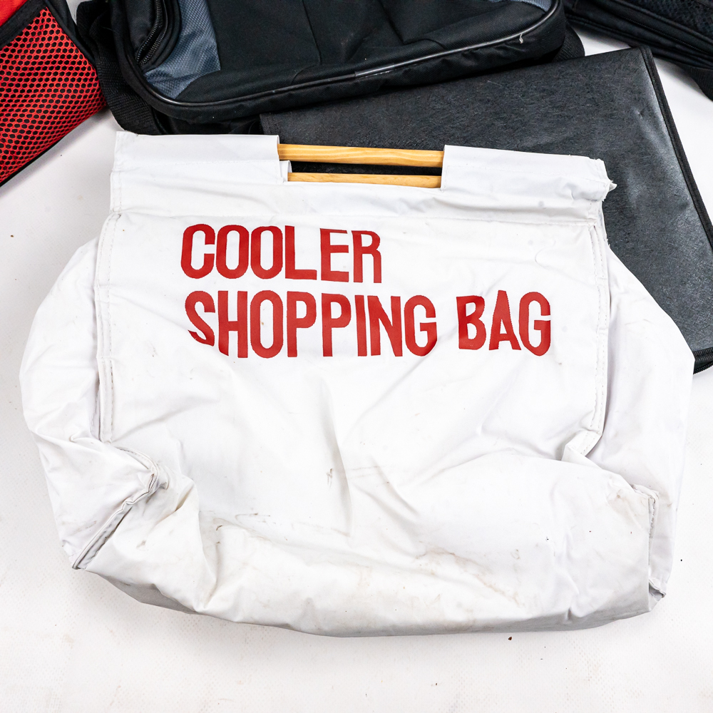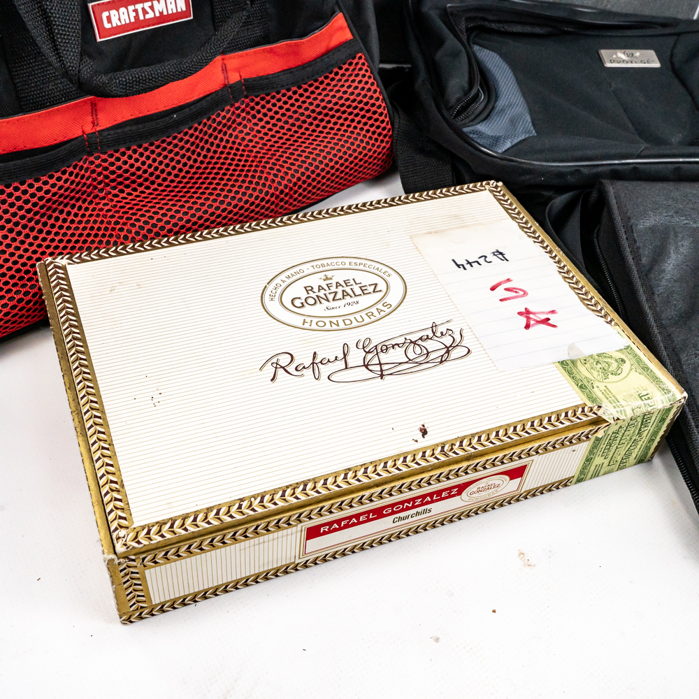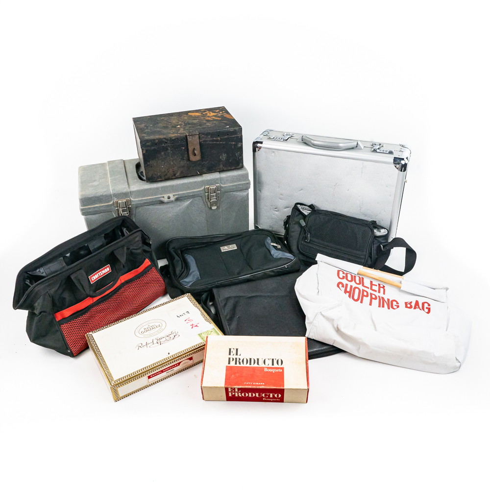 Including aluminum attache metal brief case with combo, approximately 18″t x 4.5″w x 13″l with some minor dings and cosmetic blemishes, Contico “Tuff Box” 10.5″t x 10″w x 20″l, Wood handle cooler shopping bag, Mini cooler bag, Craftsman travel bag, Protege travel bag & Binder and cigar boxes. Please use photos to judge condition and bid accordingly.