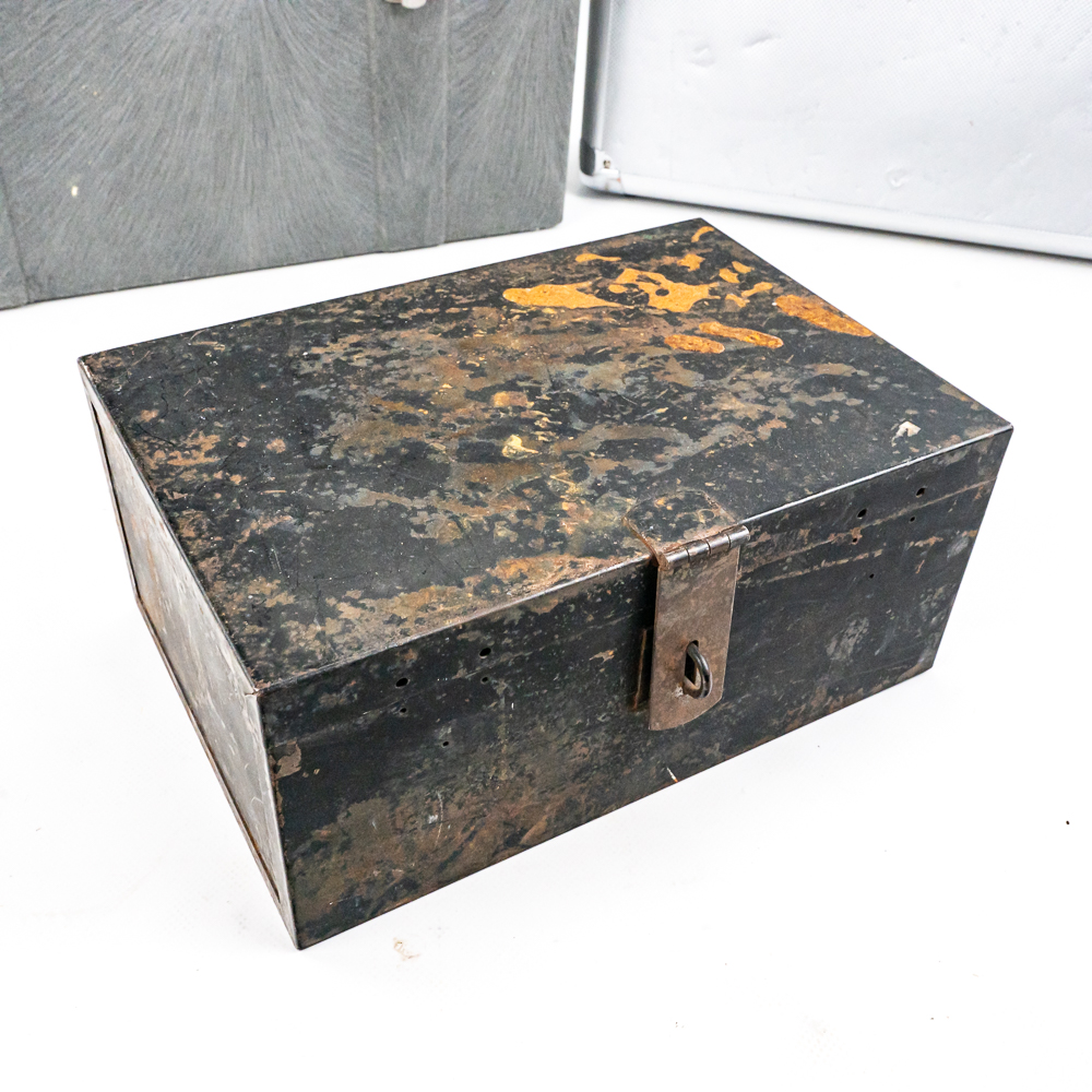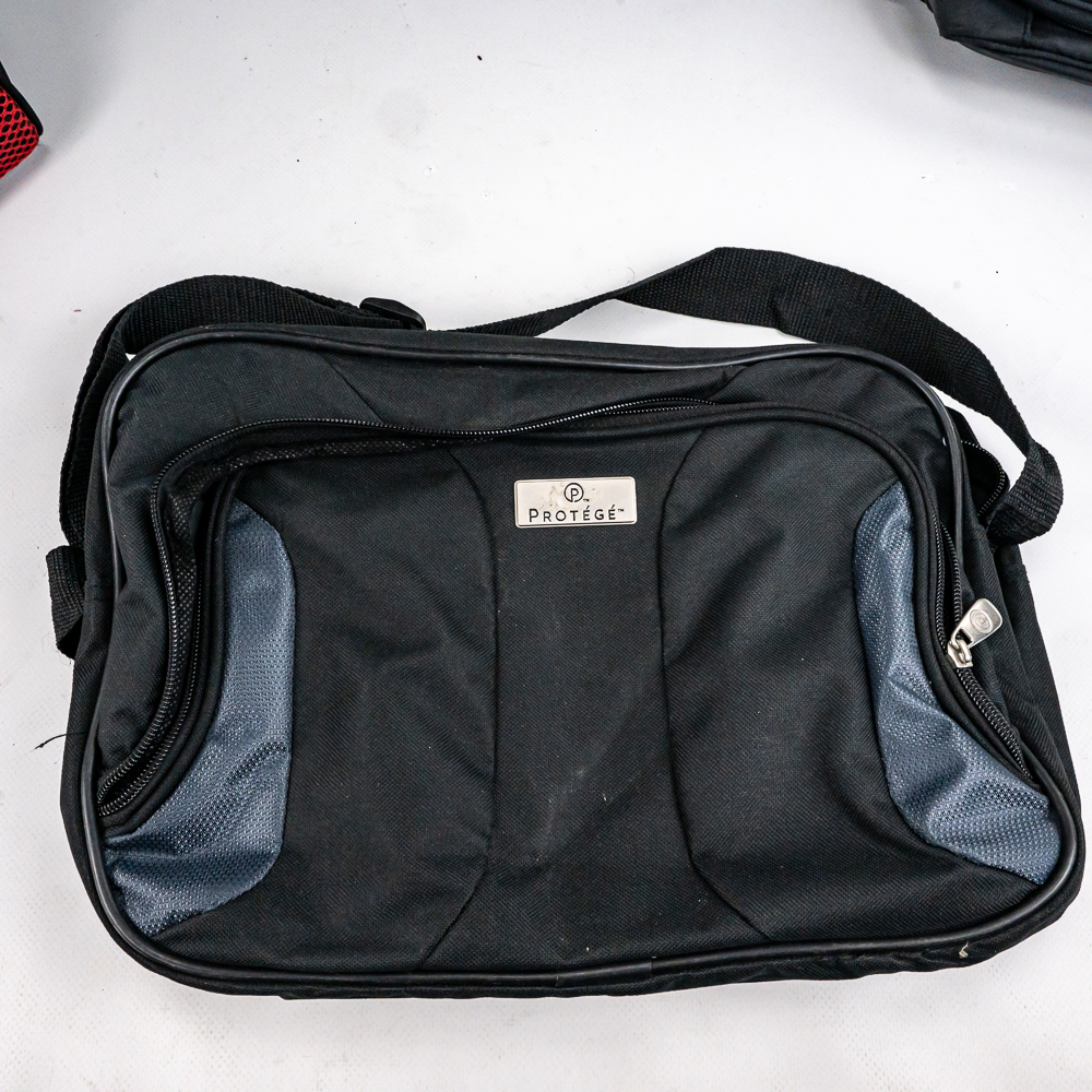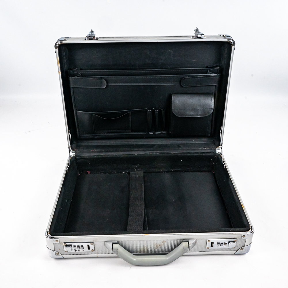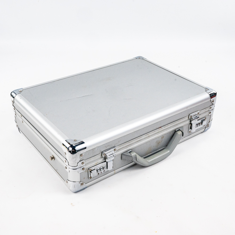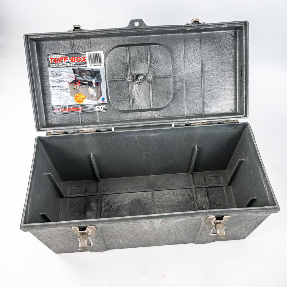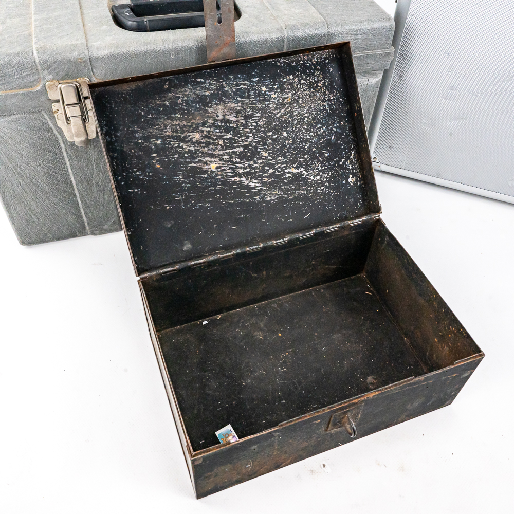Including aluminum attache metal brief case with combo, approximately 18″t x 4.5″w x 13″l with some minor dings and cosmetic blemishes, Contico “Tuff Box” 10.5″t x 10″w x 20″l, Wood handle cooler shopping bag, Mini cooler bag, Craftsman travel bag, Protege travel bag & Binder and cigar boxes. Please use photos to judge condition and bid accordingly.