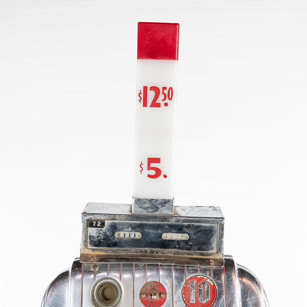 Chrome front Mills High Top 10 cent slot machine with a SAHARA nameplate above the reels. The Sahara is one of the oldest surviving casinos on the Las Vegas strip. This Sahara slot was most likely an original machine from when the casino opened in 1952. Accepts coins plays, and pays out. Has the change light and the jackpot light tower on top. In good condition, mech could use servicing. There is no lock in the door.
