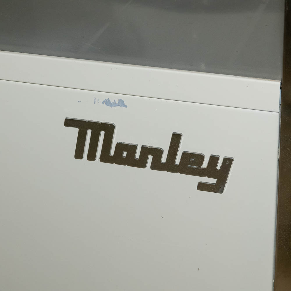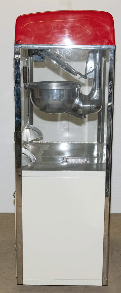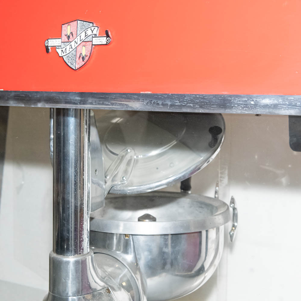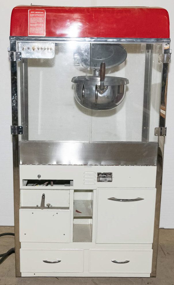 PRICE LOWERED! This beautifully restored Manley Model 44, Serial 44-207F popcorn machine has its original key. It features the Manley Cascade kettle and has a warming pan. It measures 36″W X 69″H X 23 1/2″D. there is a crack in the plastic top. Untested.