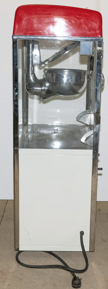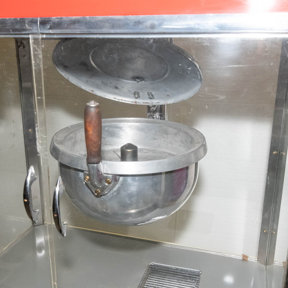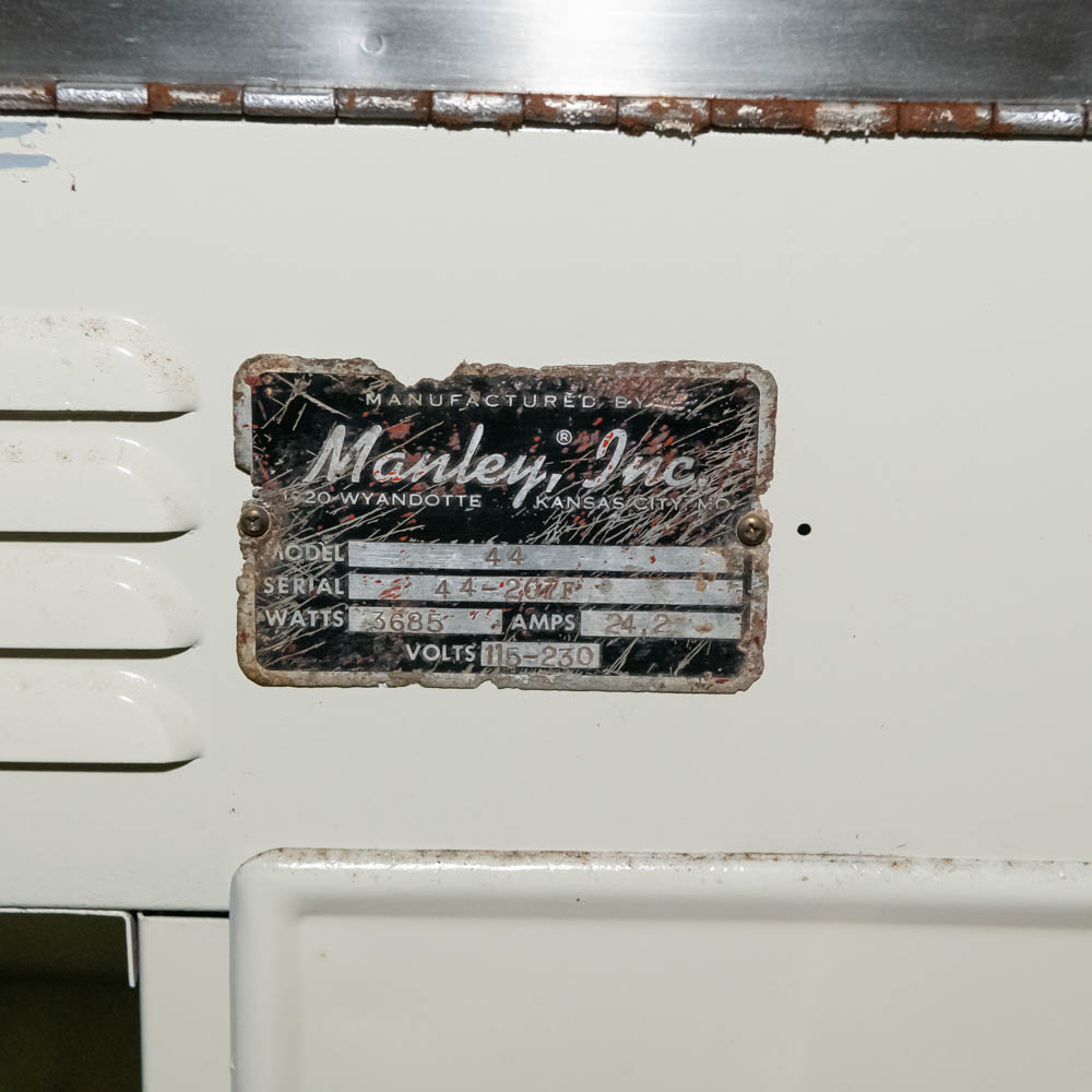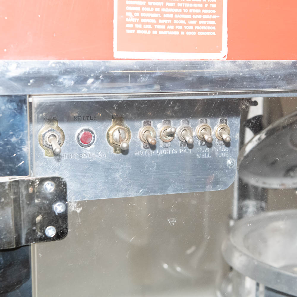 PRICE LOWERED! This beautifully restored Manley Model 44, Serial 44-207F popcorn machine has its original key. It features the Manley Cascade kettle and has a warming pan. It measures 36″W X 69″H X 23 1/2″D. there is a crack in the plastic top. Untested.