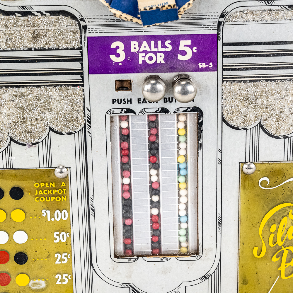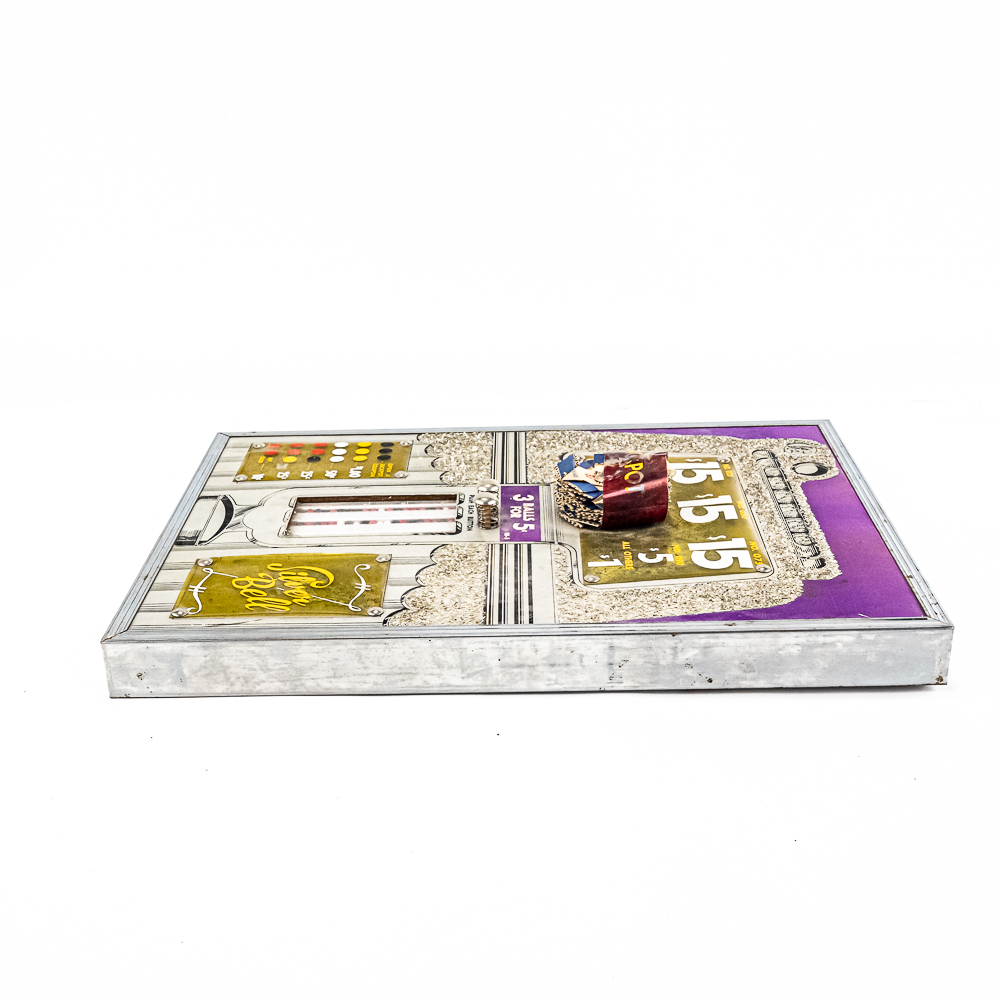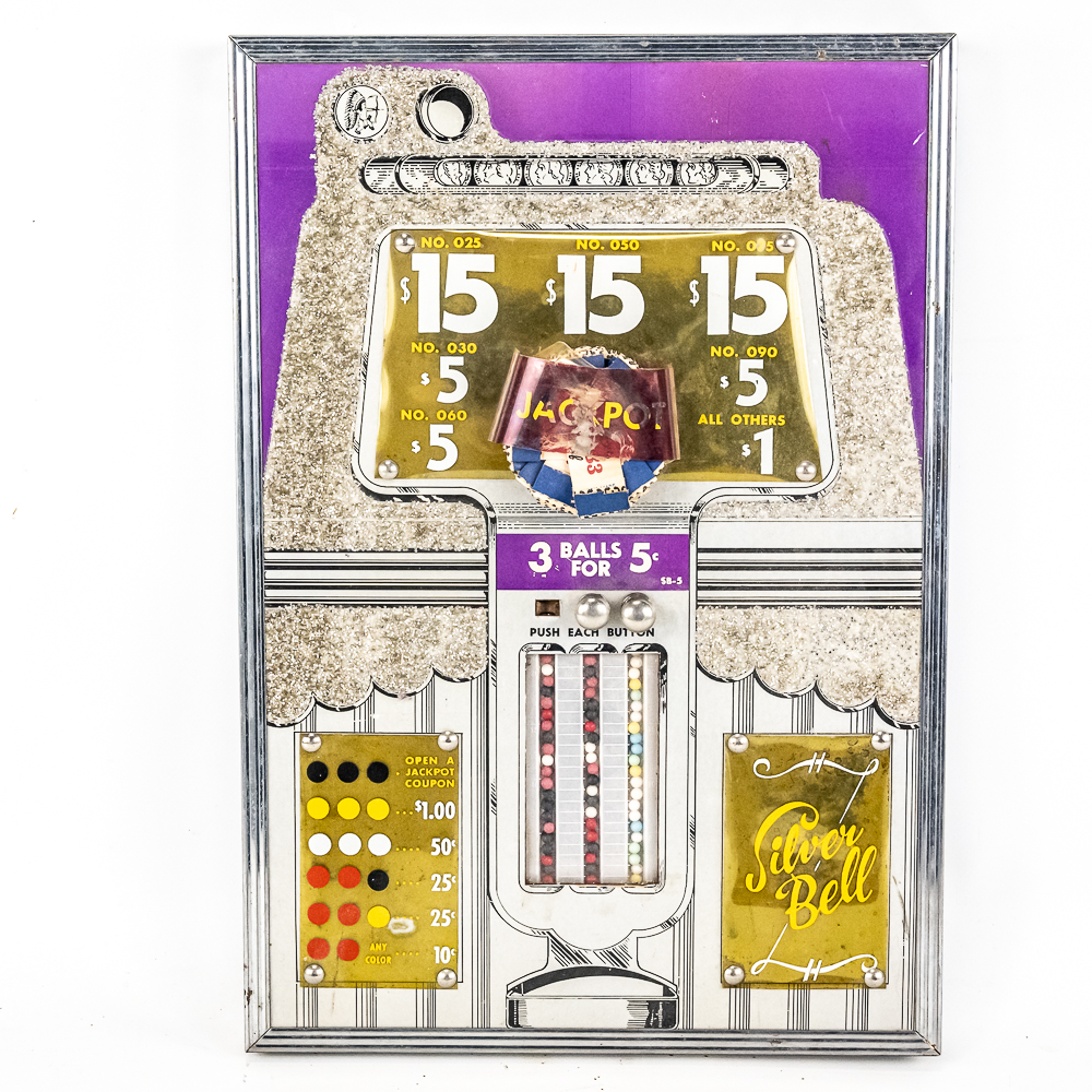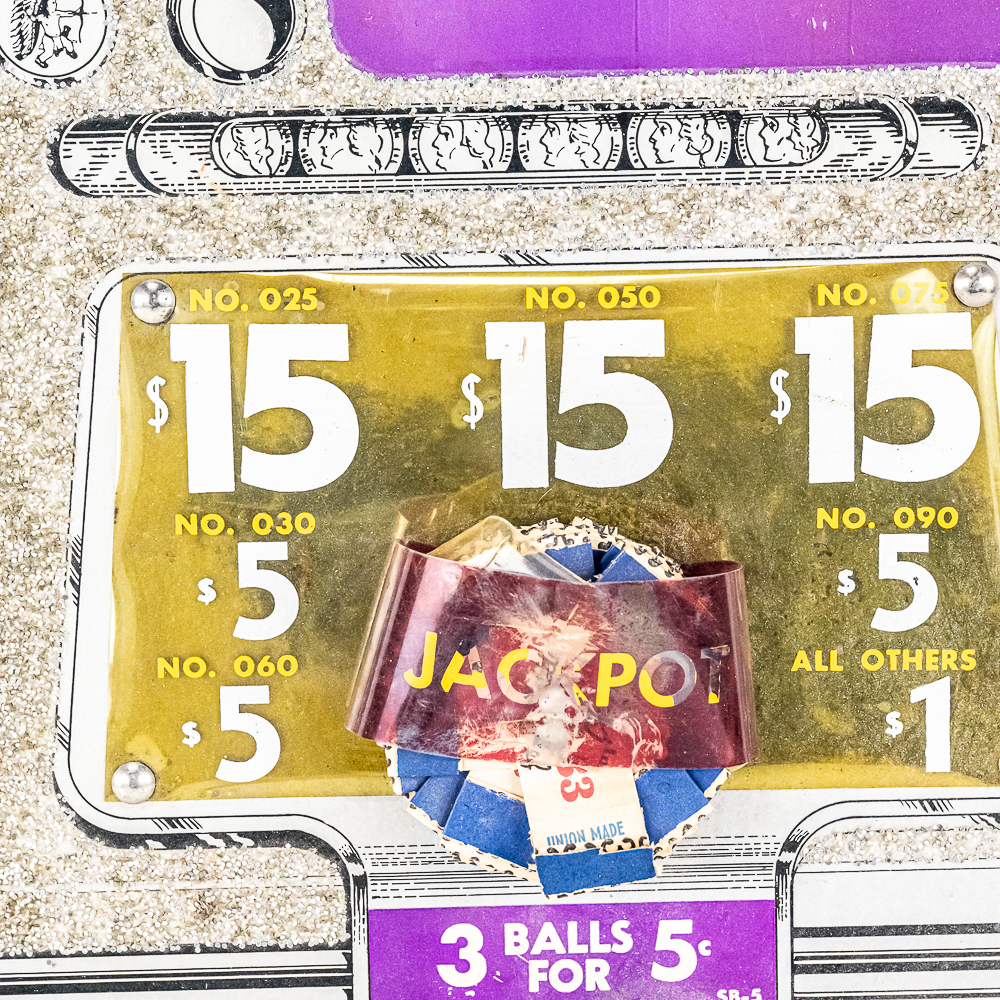 Another unusual counter top gambling item which uses pull tabs and small colored balls. The pay out was distributed by the shop owner or bartender. Very eye catching item in very good condition with just a few tabs missing. Again, never seen one!