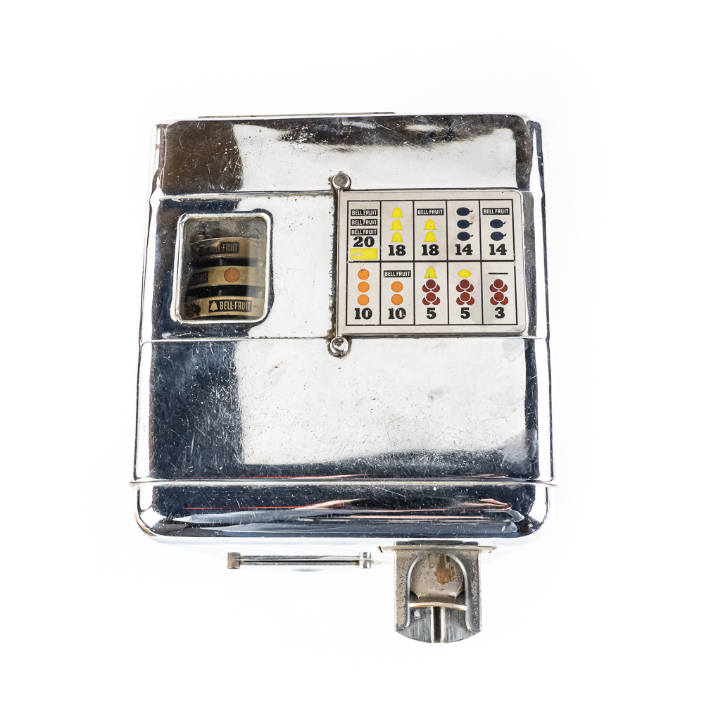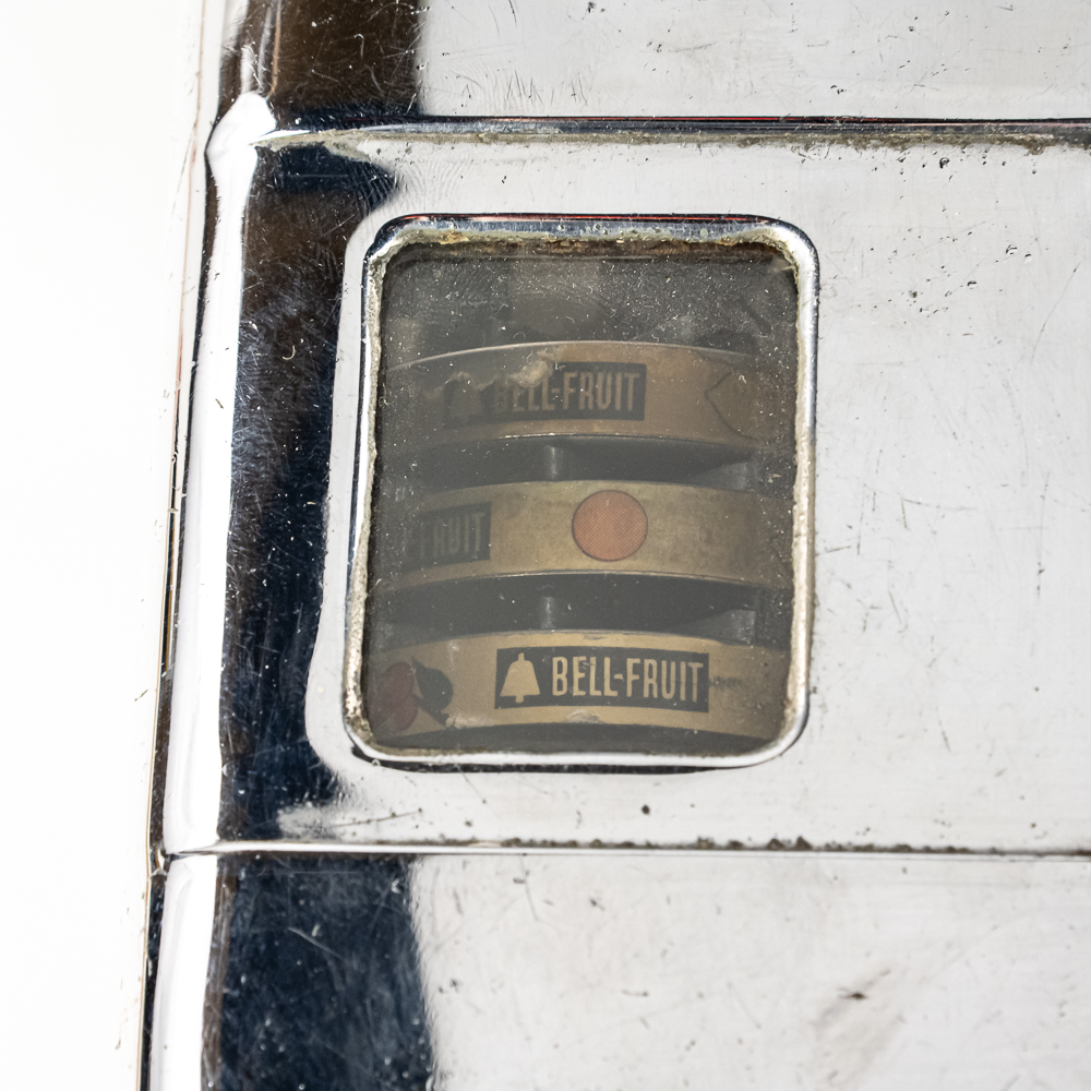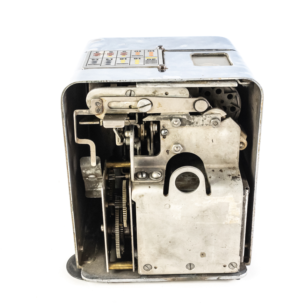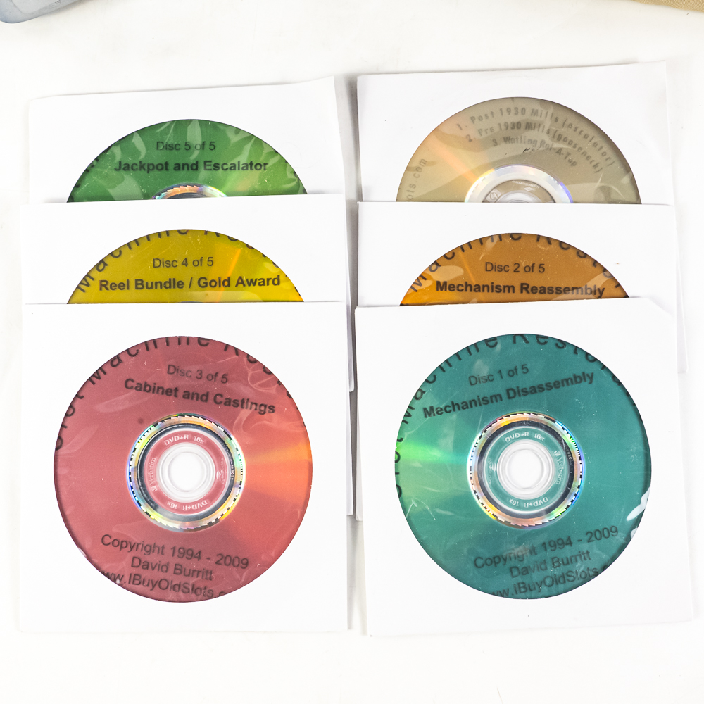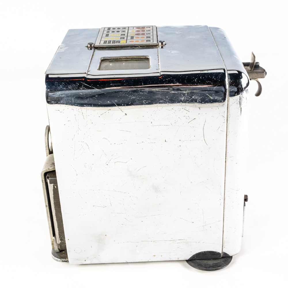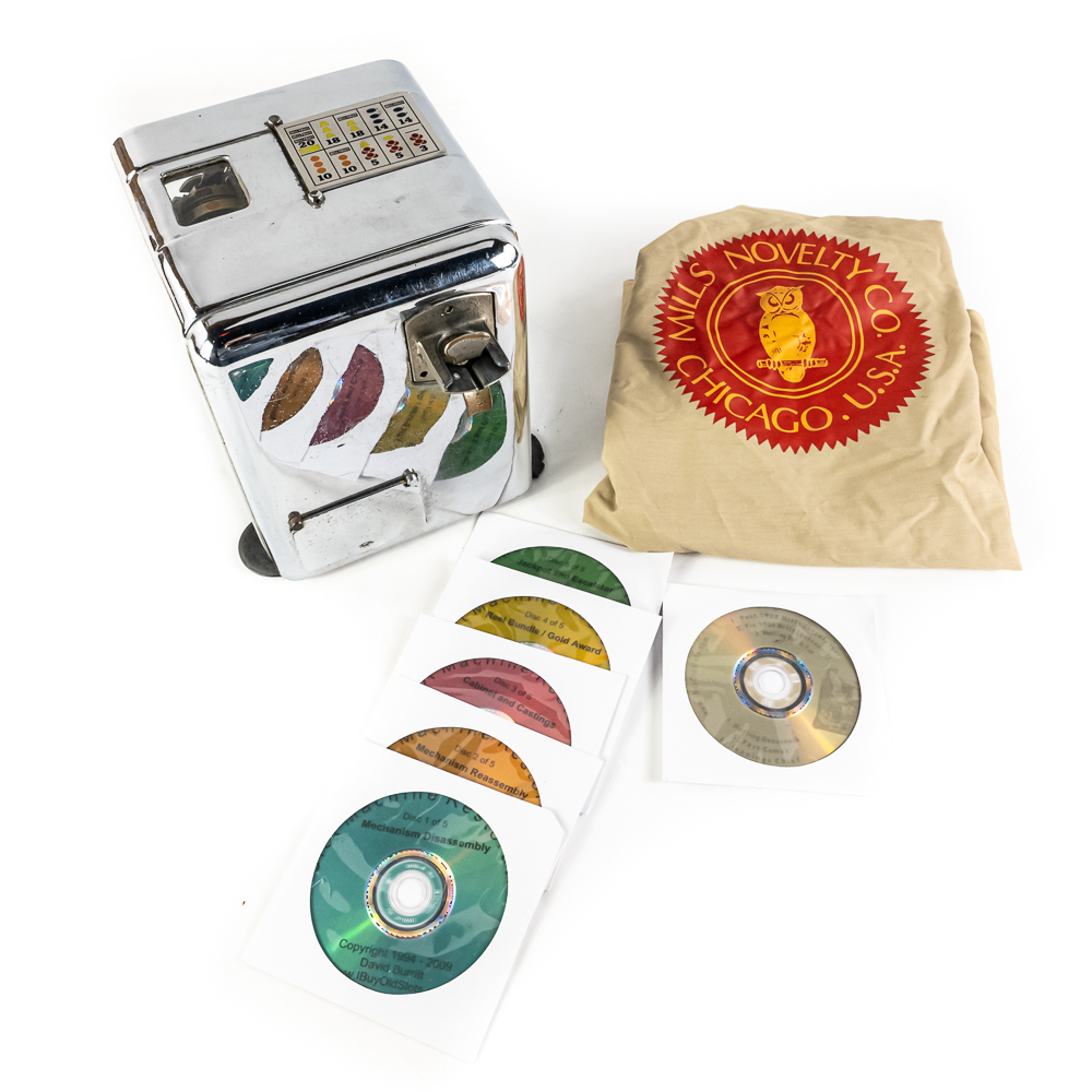 1940s Mills “Vest Pocket” tabletop nickel slot machine; sold as is for parts or repair along with full sized Mills Novelty slot machine dust cover & 6 repair instructional DVDs. Almost complete with mechanism and chrome plated body, missing rear door coin slot is jammed and missing a foot approximately 8″ x 7″ x 7″. Good overall condition with age and wear, perfect restoration candidate. Please use photos to judge condition and bid accordingly.