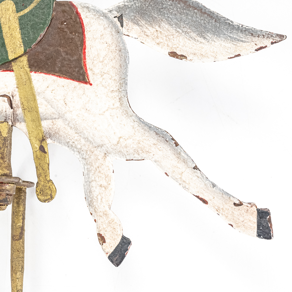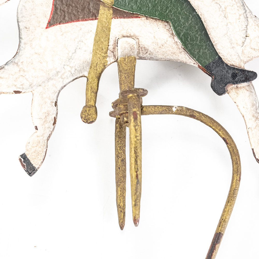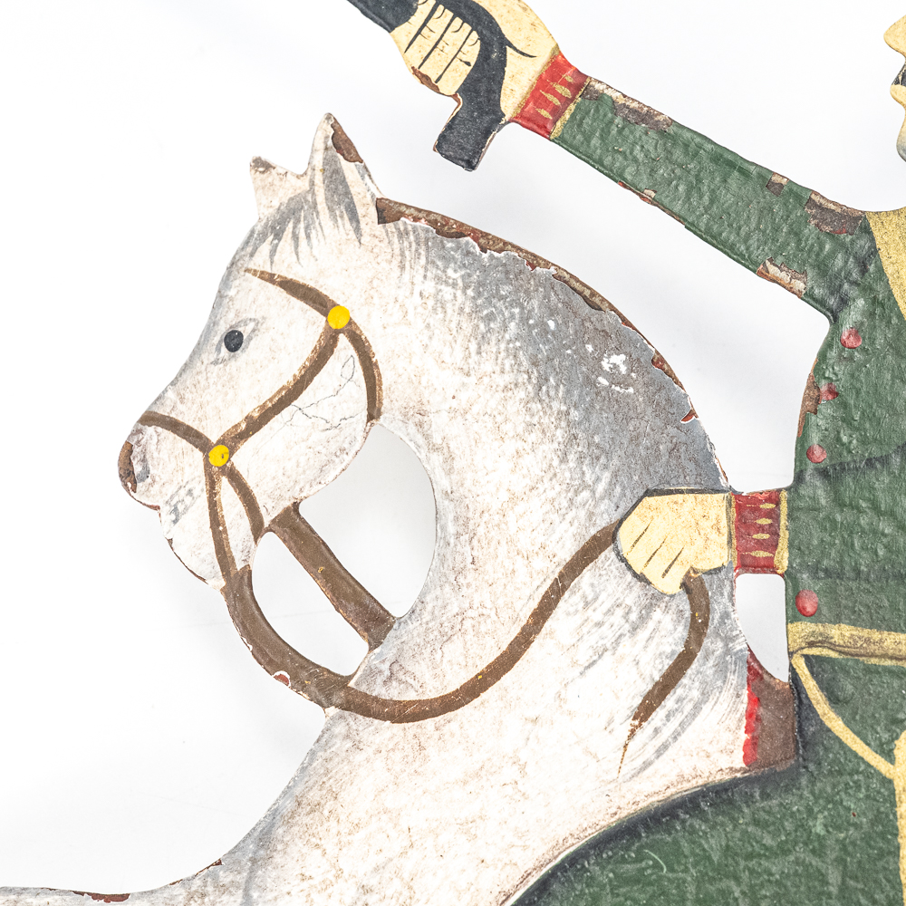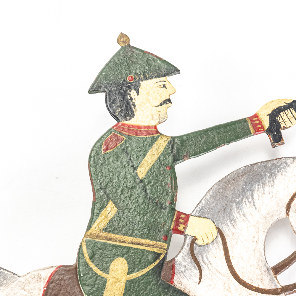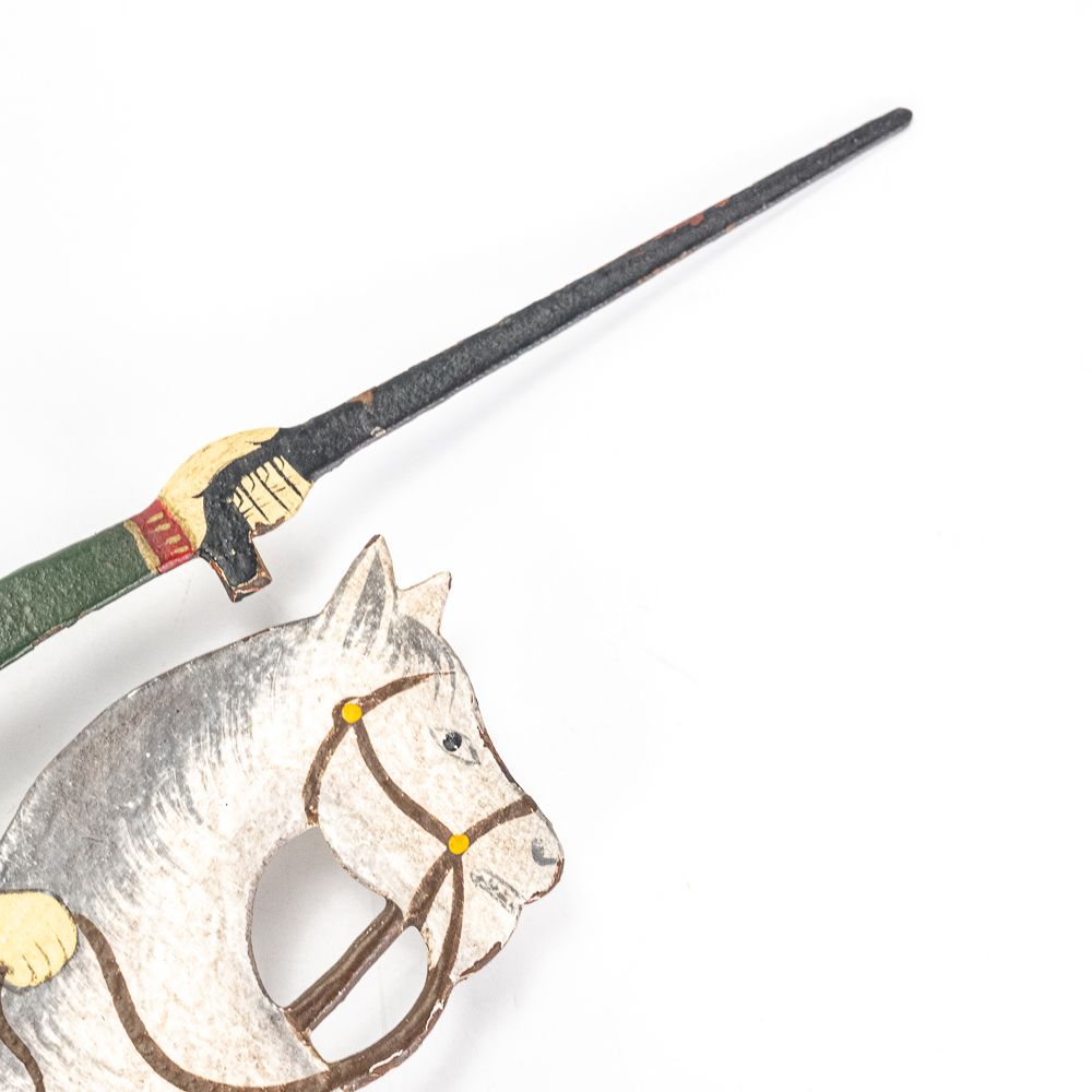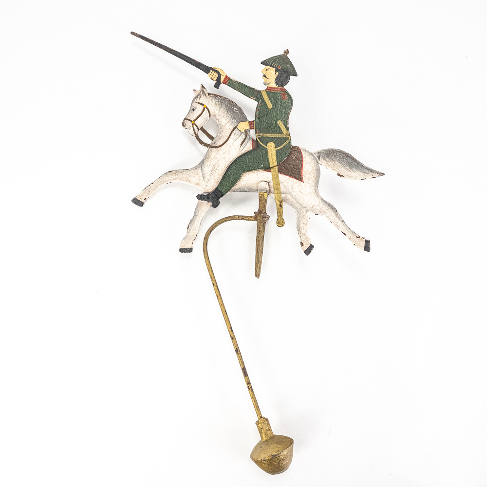 Vintage Soldier Riding Horse into Battle Sky Hook Pendulum Balance Toy in very good overall condition with minor paint loss and discoloration indicative of age. Presents extremely well with vivid and eye catching color and subject matter; approximately 21″t. Prefect addition to your collection, please use photos to judge condition and bid accordingly.