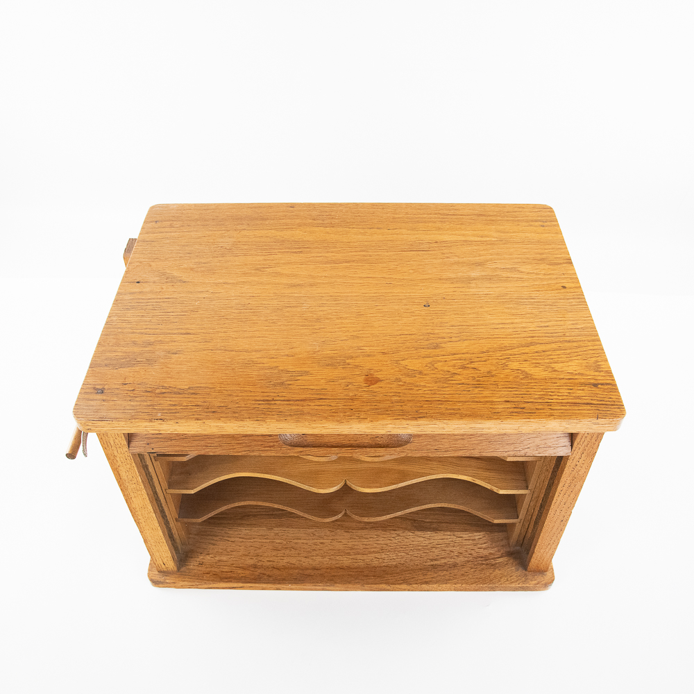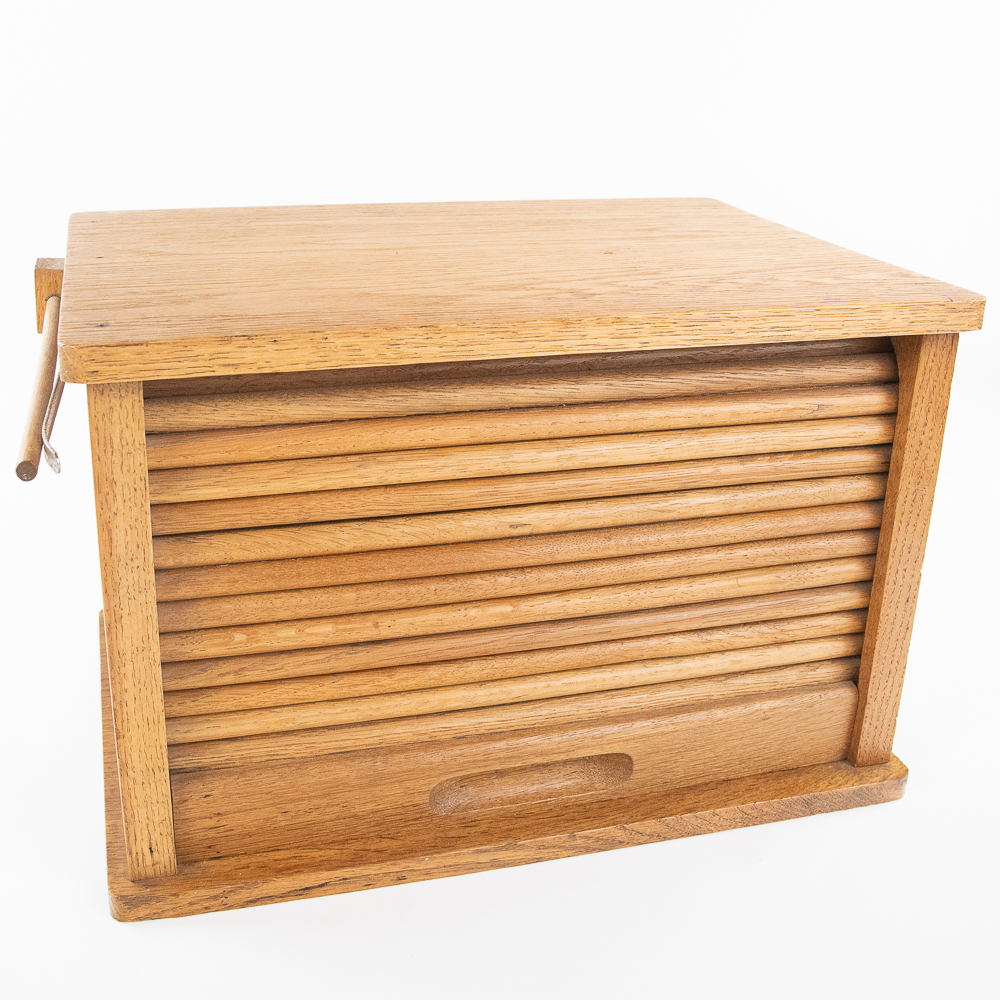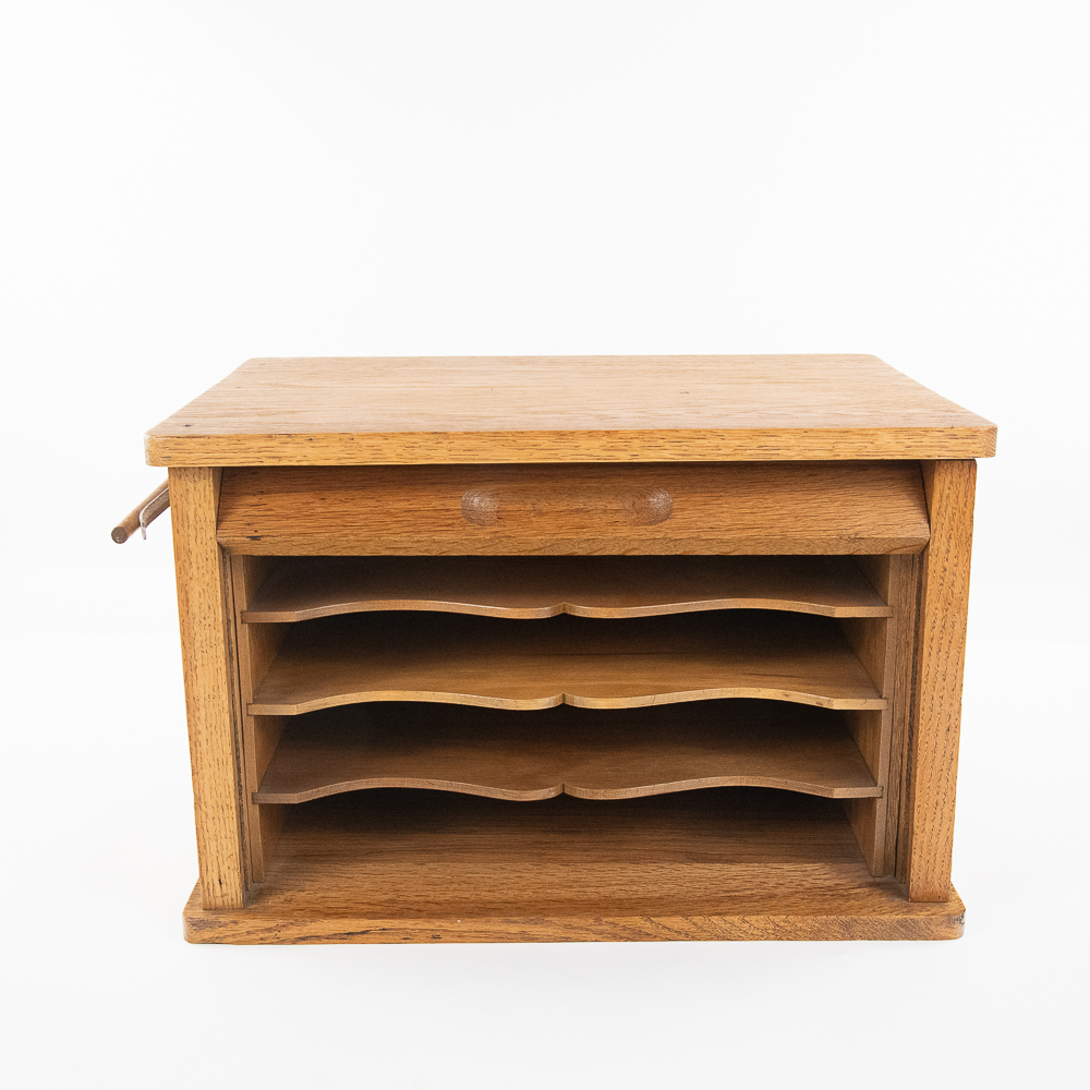 Unsigned 11″t x 17″l oak curtain roll top door tabletop cabinet opening up to three internal shelves perfectly accented with side hanging clip. Very good overall condition with minimal signs of age and use. Perfect addition to your home or office, please use photos to judge condition and bid accordingly.