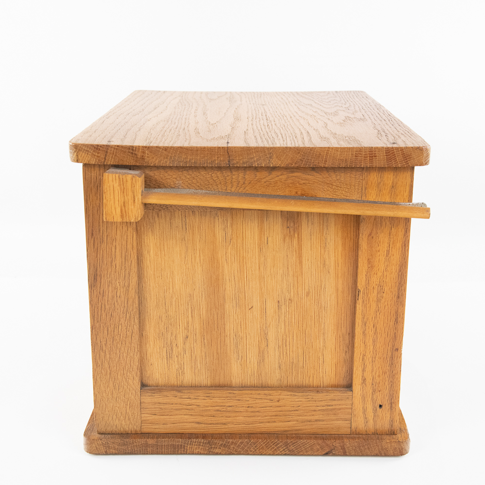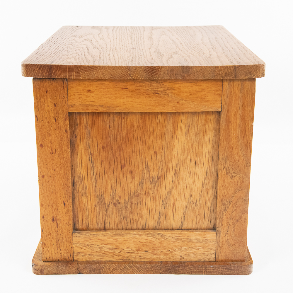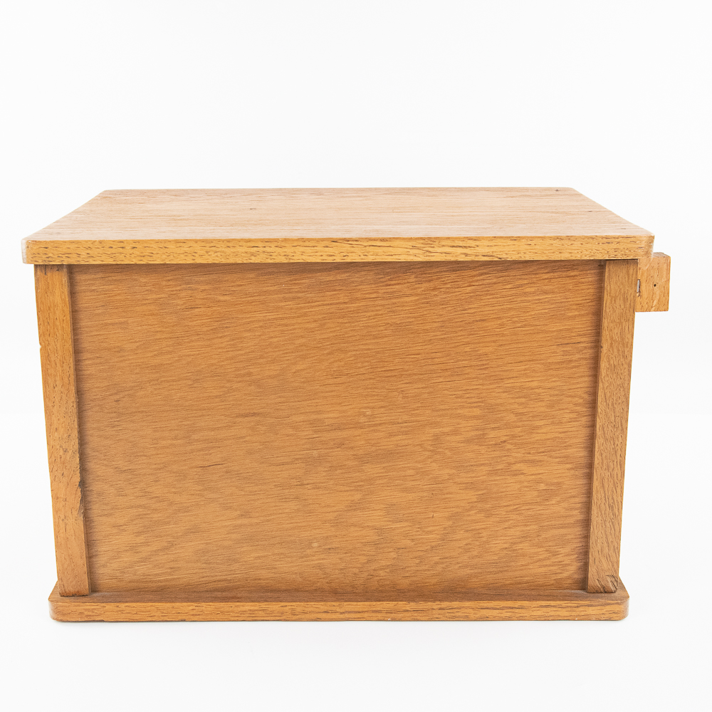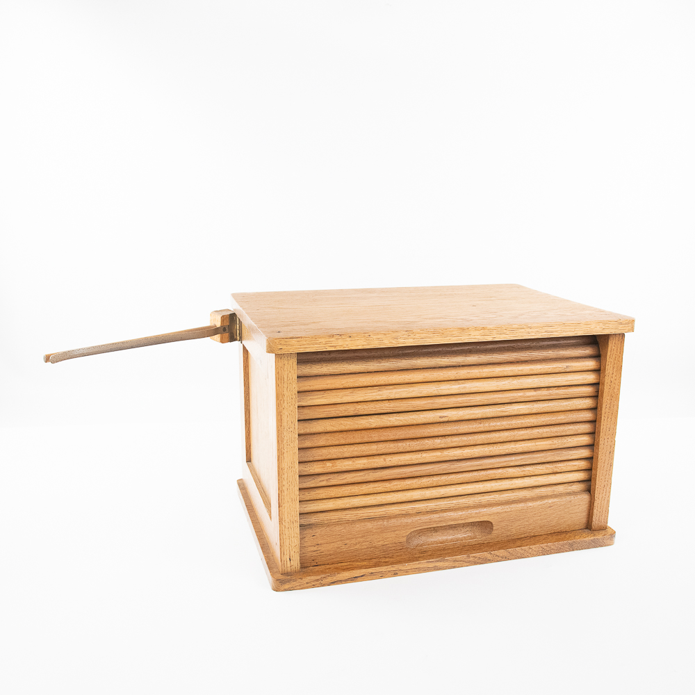 Unsigned 11″t x 17″l oak curtain roll top door tabletop cabinet opening up to three internal shelves perfectly accented with side hanging clip. Very good overall condition with minimal signs of age and use. Perfect addition to your home or office, please use photos to judge condition and bid accordingly.