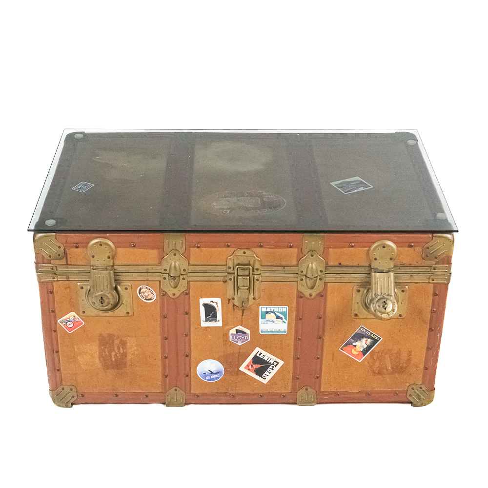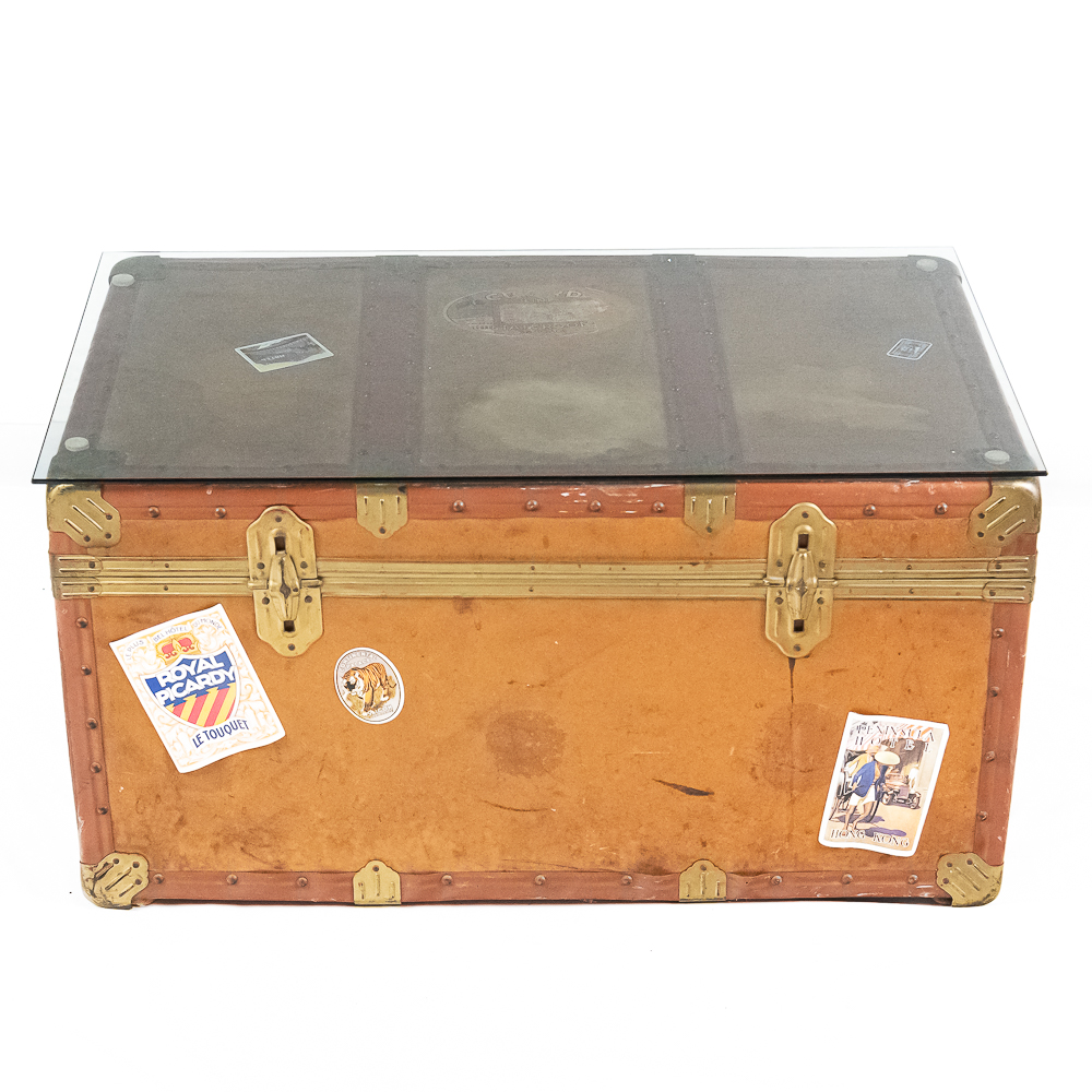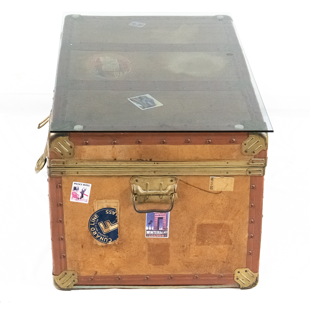 A great cocktail or end table using a vintage leather travel trunk with old travel stickers on it topped by a custom cut glass top. In VG condition. Measures 32″ wide, 16″ tall, 19″ deep.