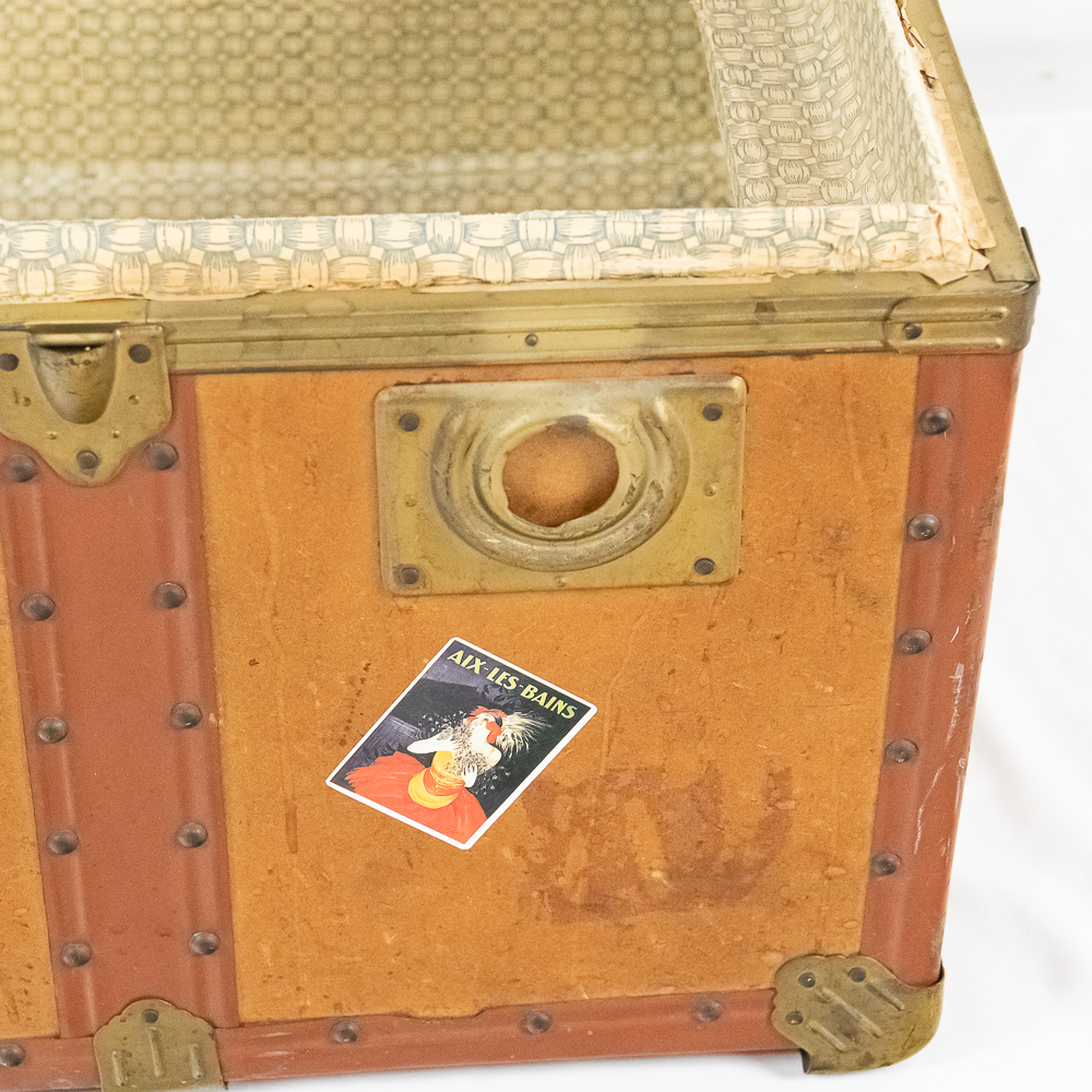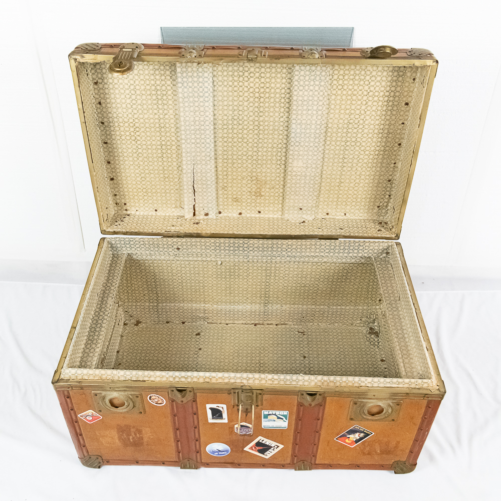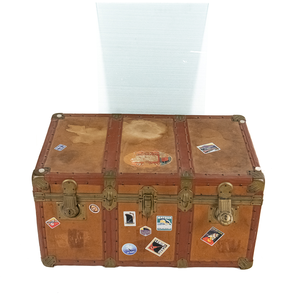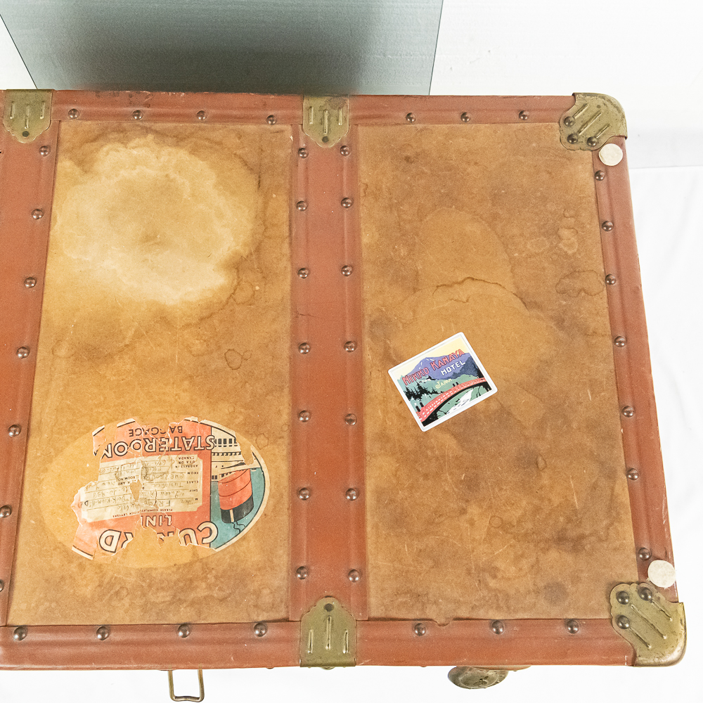 A great cocktail or end table using a vintage leather travel trunk with old travel stickers on it topped by a custom cut glass top. In VG condition. Measures 32″ wide, 16″ tall, 19″ deep.