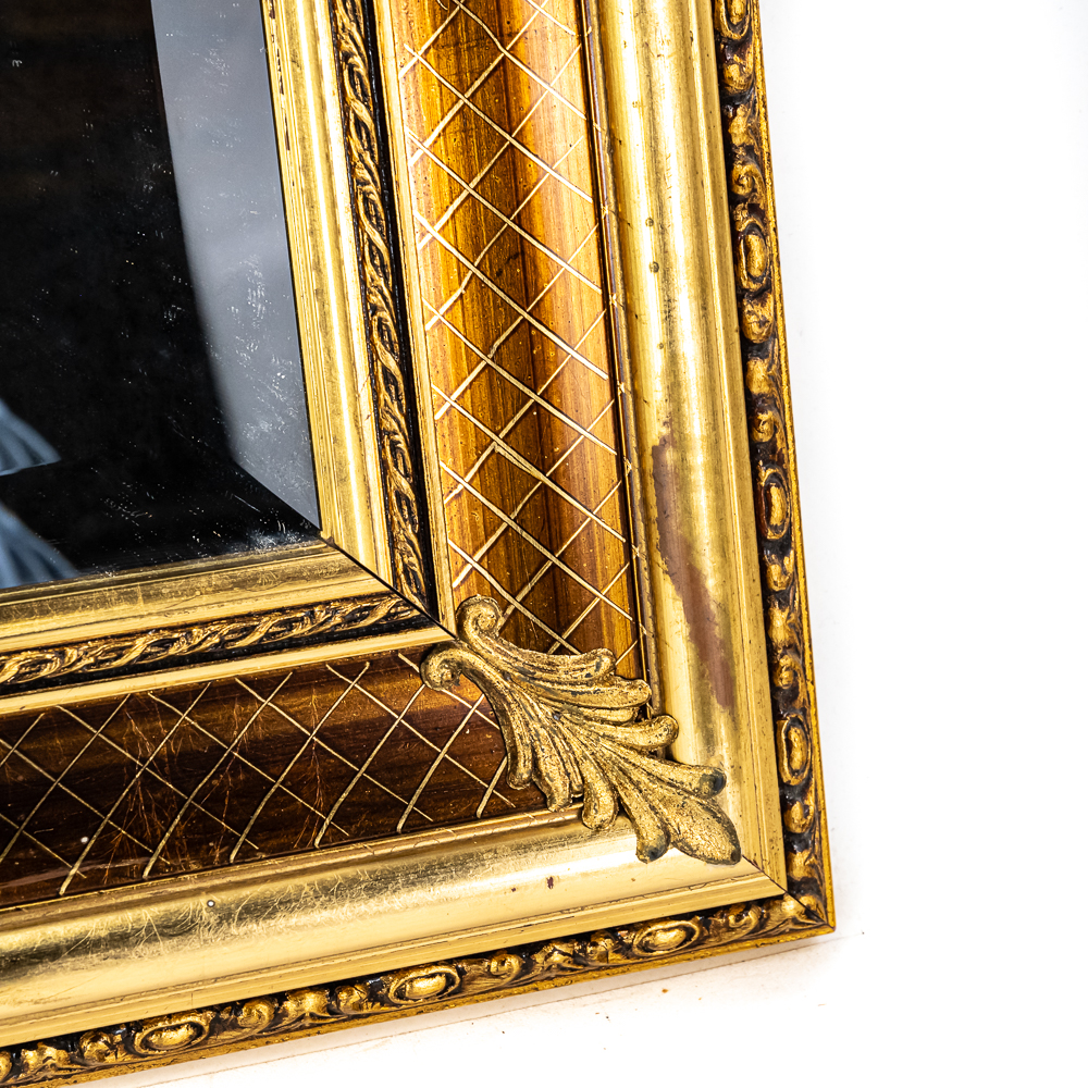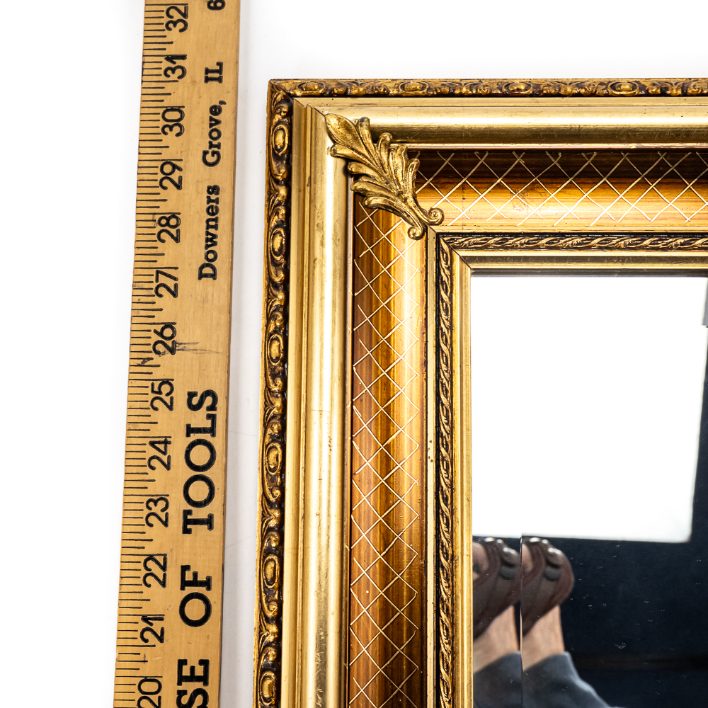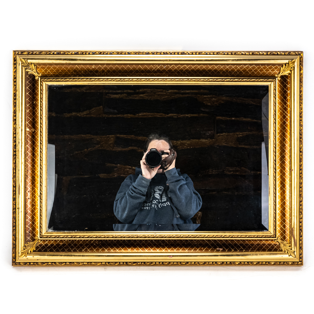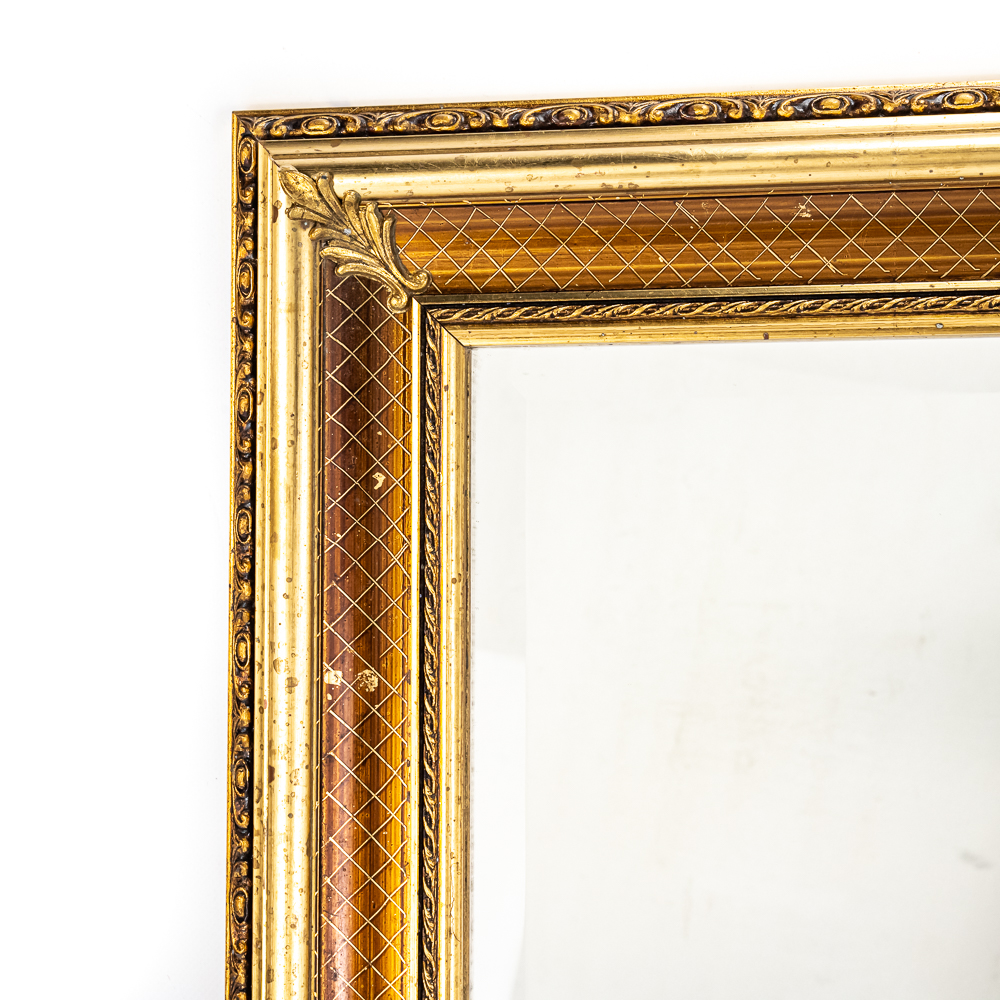 Striking vintage beveled glass rectangular wall mirror presented in attractive “gilded” frame with ornate designs. Presents well hanging on a wall head height; some age and wear related cosmetic imperfections including some discoloration & marks. Top corners veneer is pulled off the frame; noticeable when looking down at frame otherwise not noticeable; approximately 22.5″t x 1.5″d 30.5″l. Perfect addition to your home of office, please use photos to judge condition and bid accordingly.