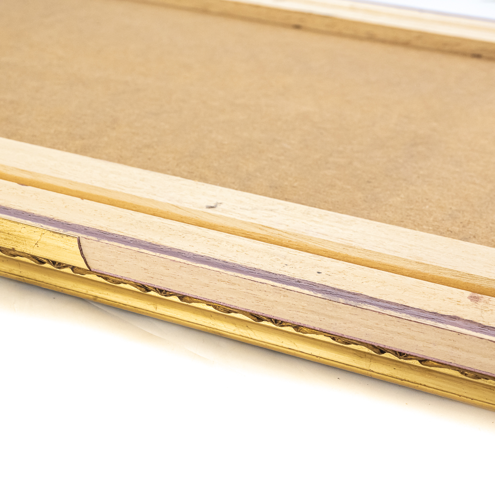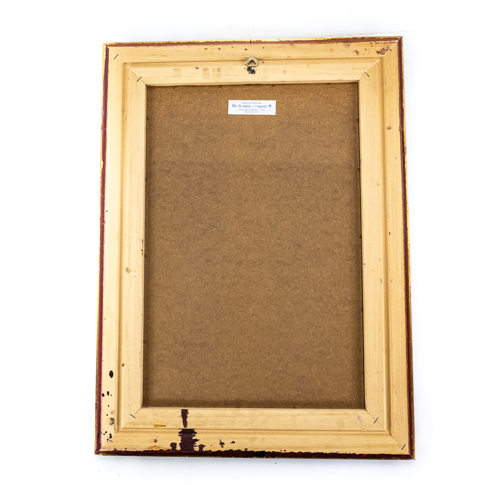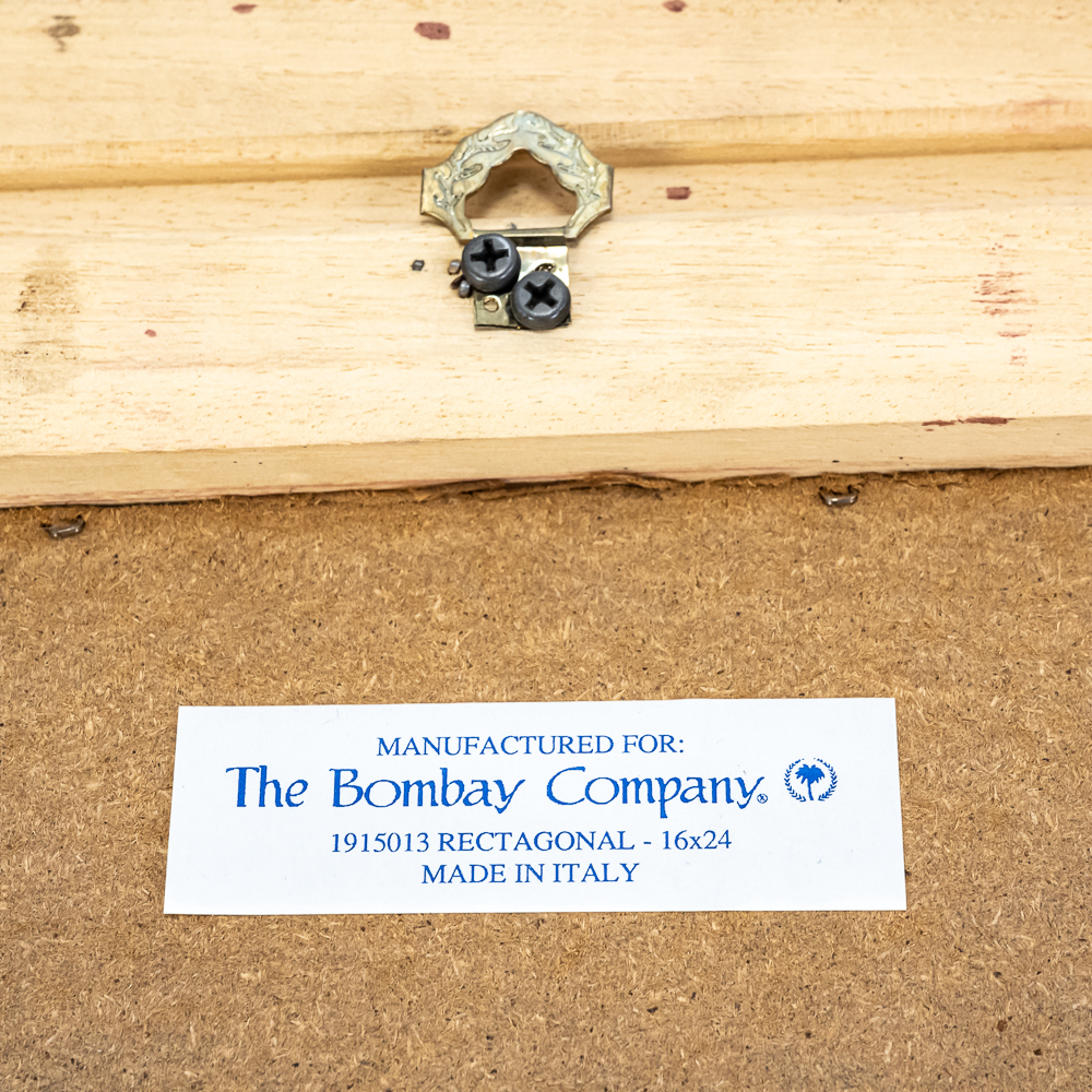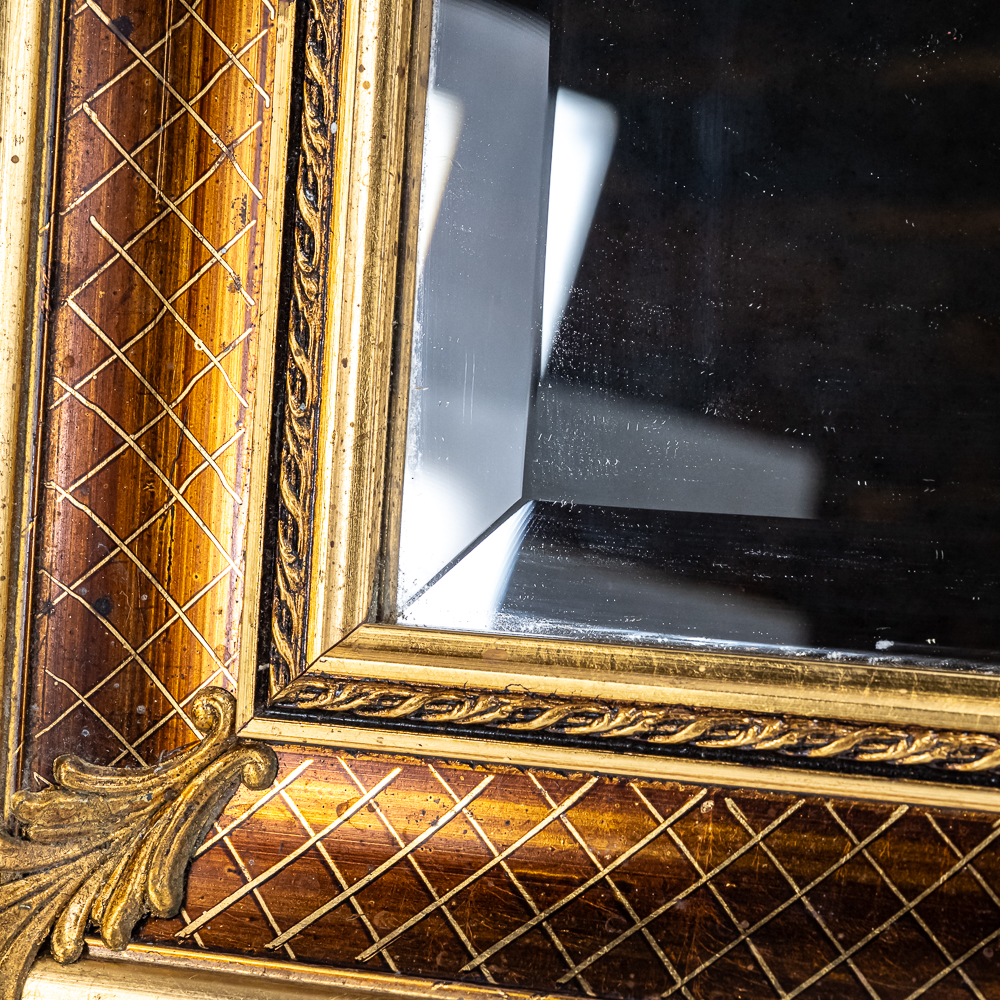 Striking vintage beveled glass rectangular wall mirror presented in attractive “gilded” frame with ornate designs. Presents well hanging on a wall head height; some age and wear related cosmetic imperfections including some discoloration & marks. Top corners veneer is pulled off the frame; noticeable when looking down at frame otherwise not noticeable; approximately 22.5″t x 1.5″d 30.5″l. Perfect addition to your home of office, please use photos to judge condition and bid accordingly.