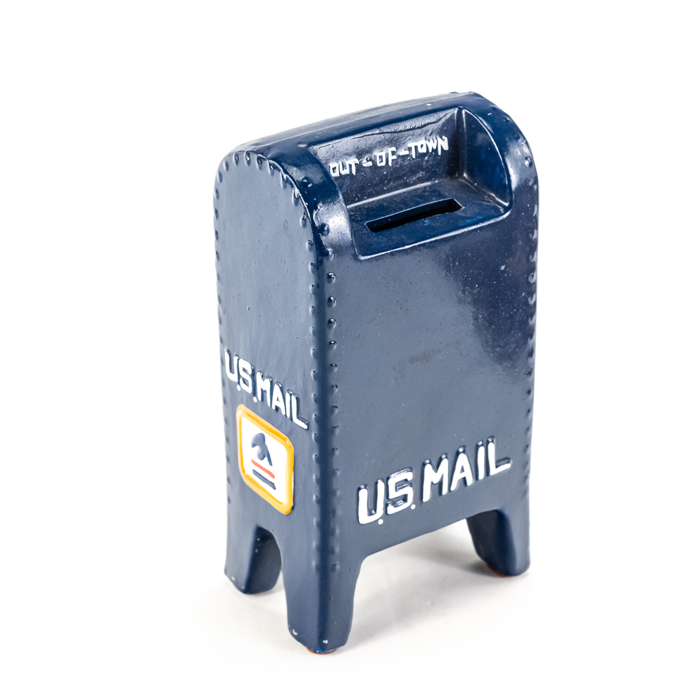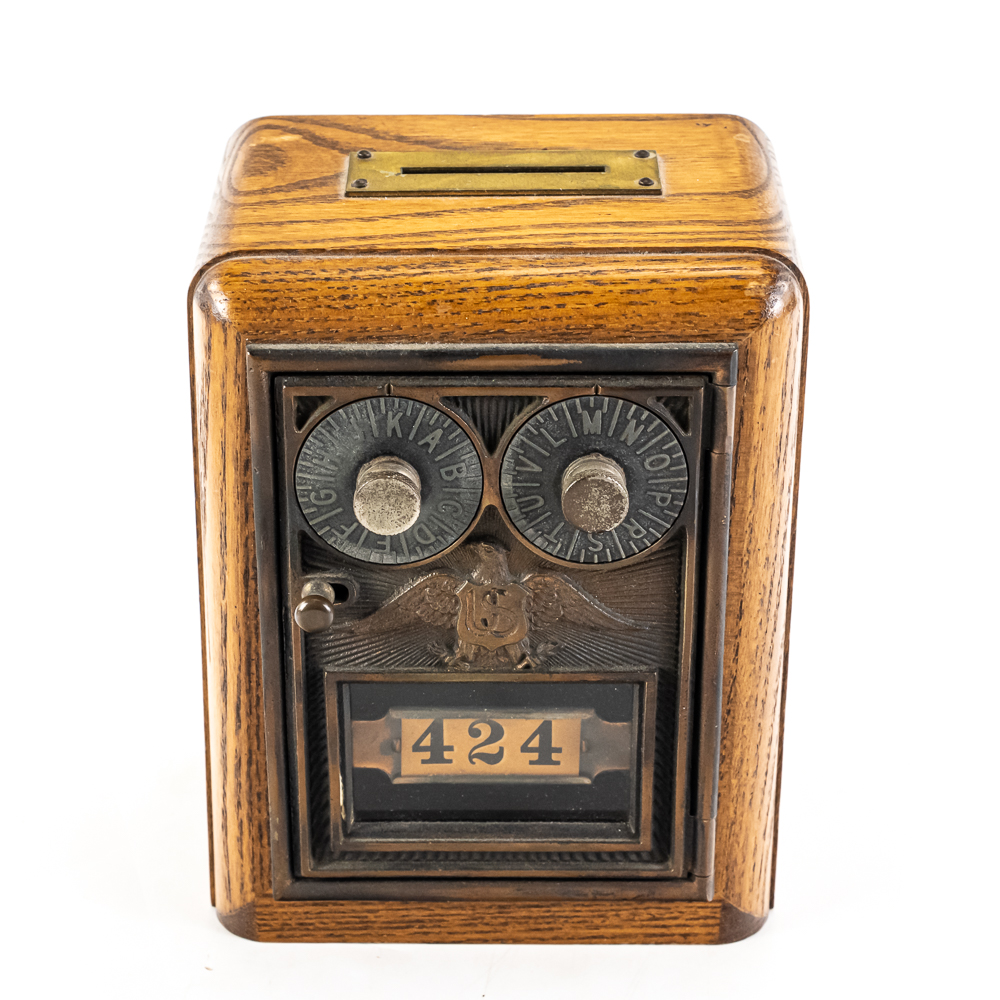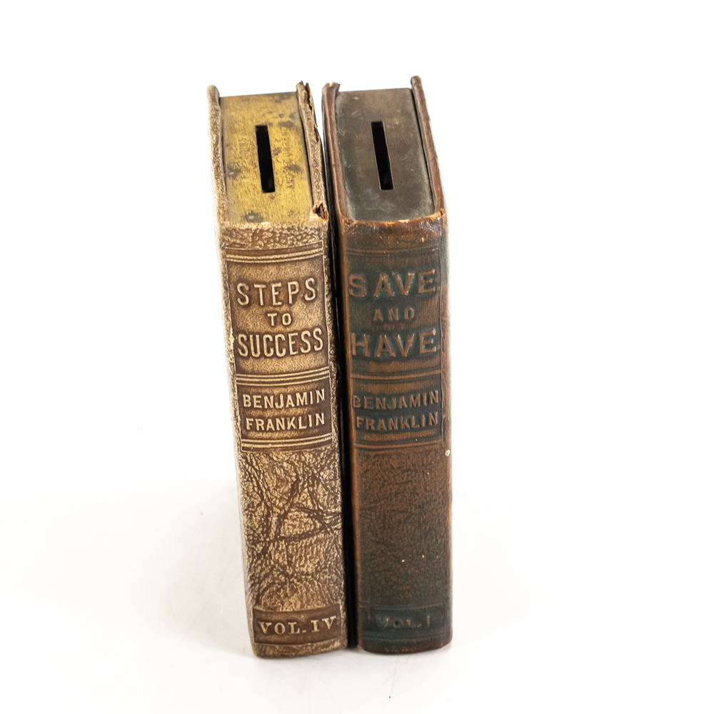 Vintage coin bank assortment features 6″ Post Office Box Bank, 6.5″ US MAIL Out of Town ceramic coin bank, 5.5″ “Steps to Success & Save & Have Benjamin Franklin Vol. I & IV advertising book banks, 3.5” Security Savings Bank Waukegan “Bank Combination” coin bank & 5″ Swissco handcrafted wooden music box coin bank ( winds does not play). Very good to good overall condition; some with more age and wear than others. Please use photos to judge condition and bid accordingly.