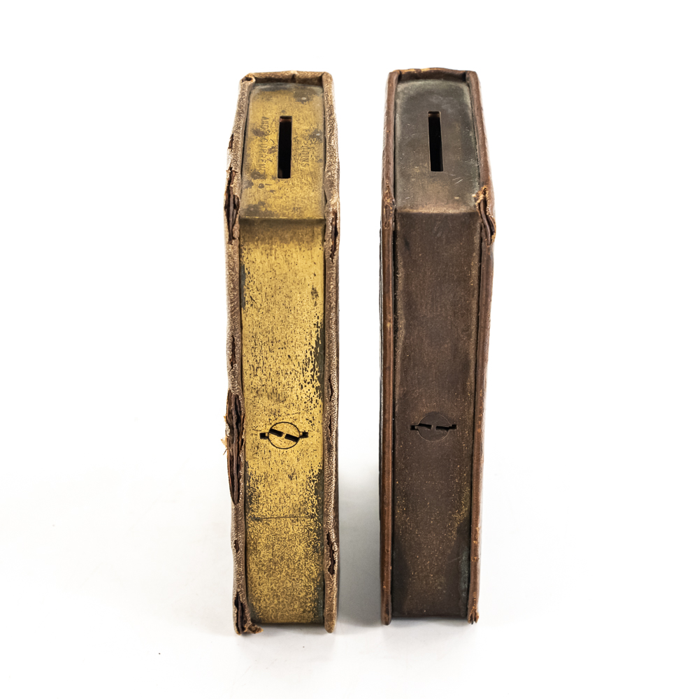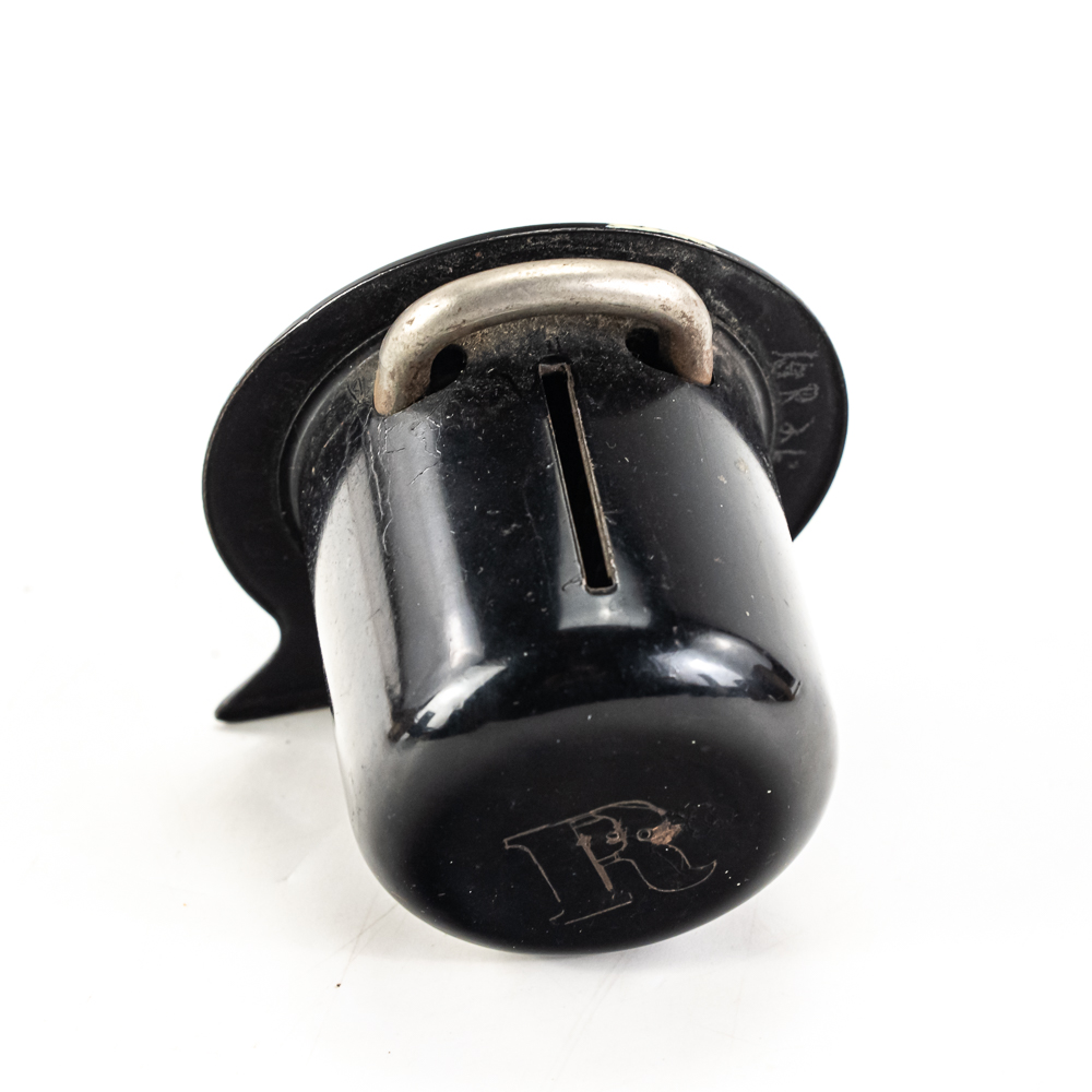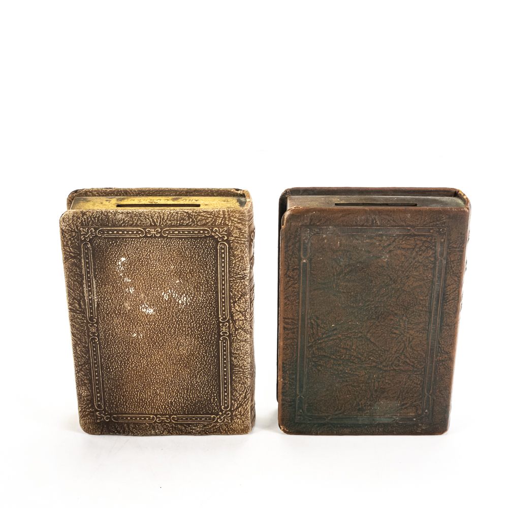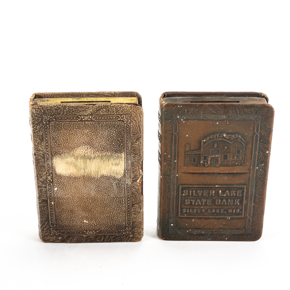 Vintage coin bank assortment features 6″ Post Office Box Bank, 6.5″ US MAIL Out of Town ceramic coin bank, 5.5″ “Steps to Success & Save & Have Benjamin Franklin Vol. I & IV advertising book banks, 3.5” Security Savings Bank Waukegan “Bank Combination” coin bank & 5″ Swissco handcrafted wooden music box coin bank ( winds does not play). Very good to good overall condition; some with more age and wear than others. Please use photos to judge condition and bid accordingly.
