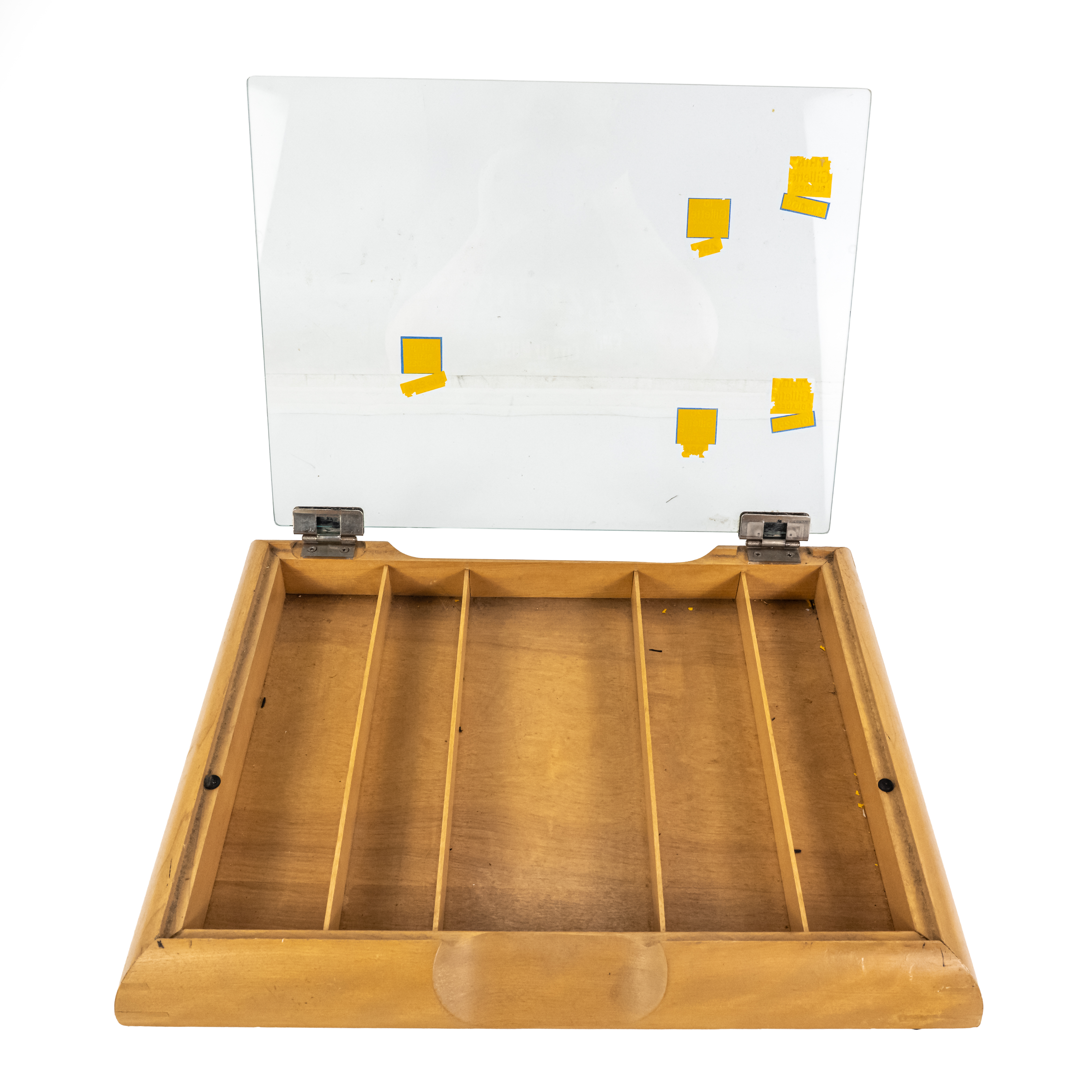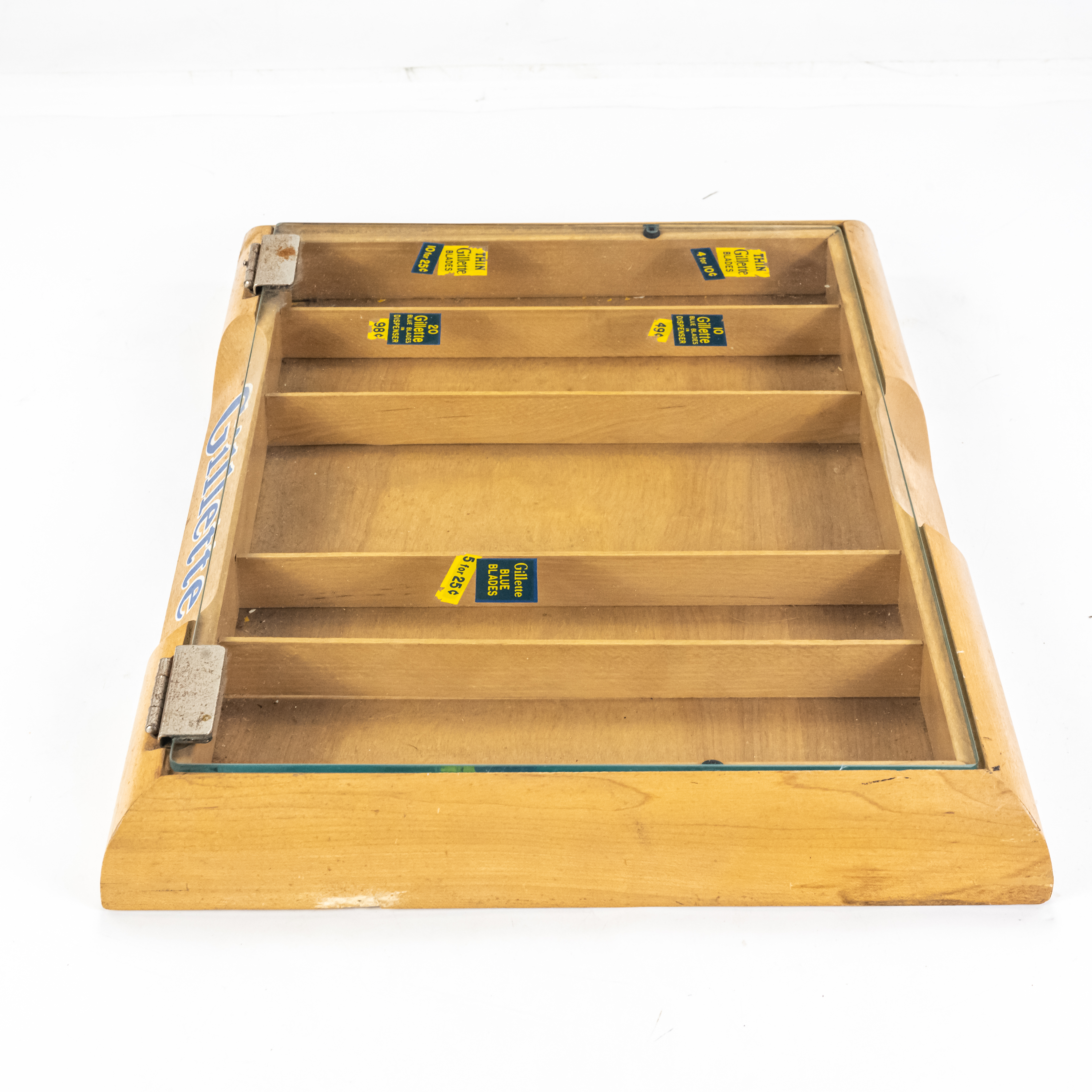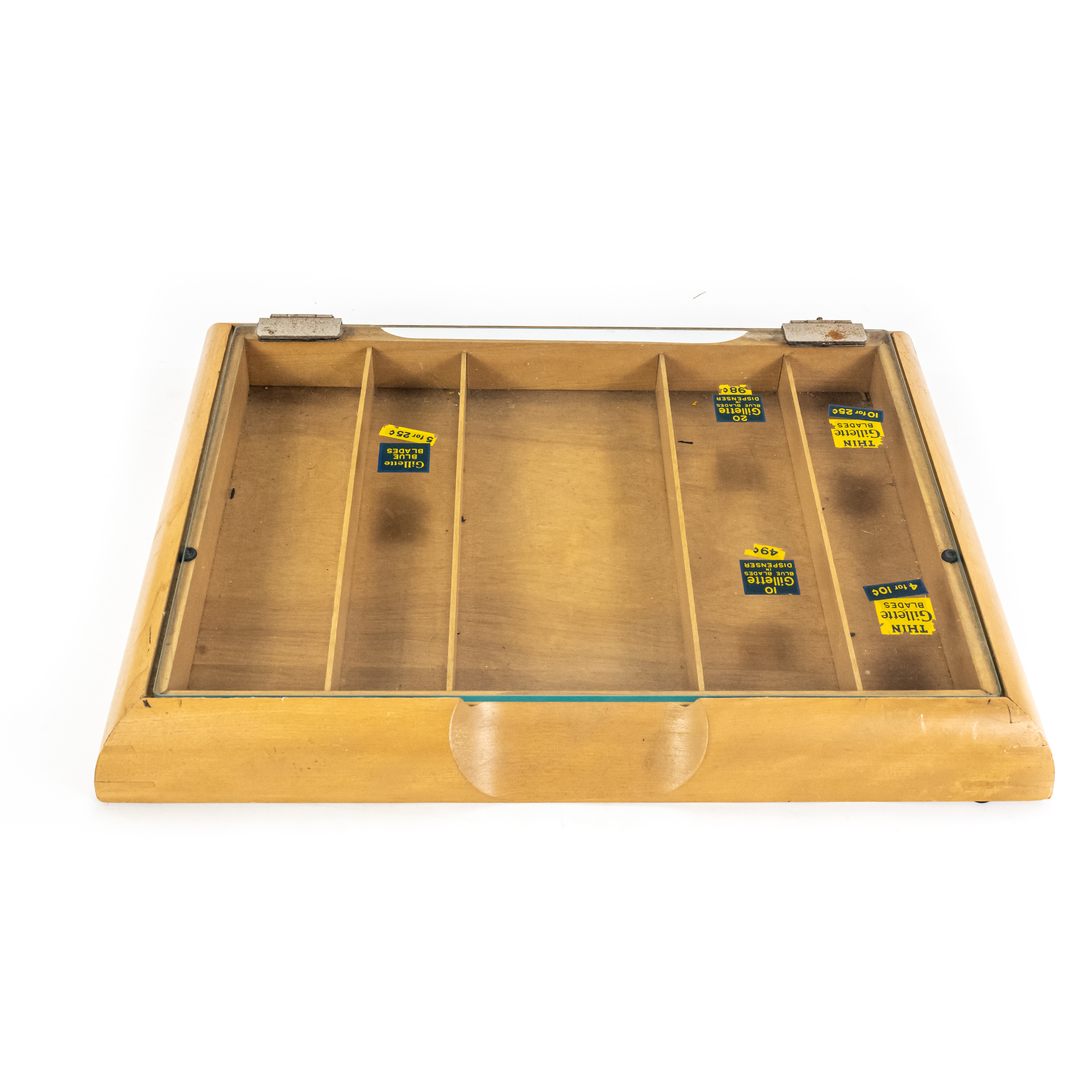 A vintage Gillette razor blade display case used in pharmacies and general stores to display razor blades at the counter. Wood case with a hinged glass top featuring a “Gillette” logo, contains original price stickers, minor nicks, some rust on hinges, otherwise good condition, 18″ x 14″, see photos.