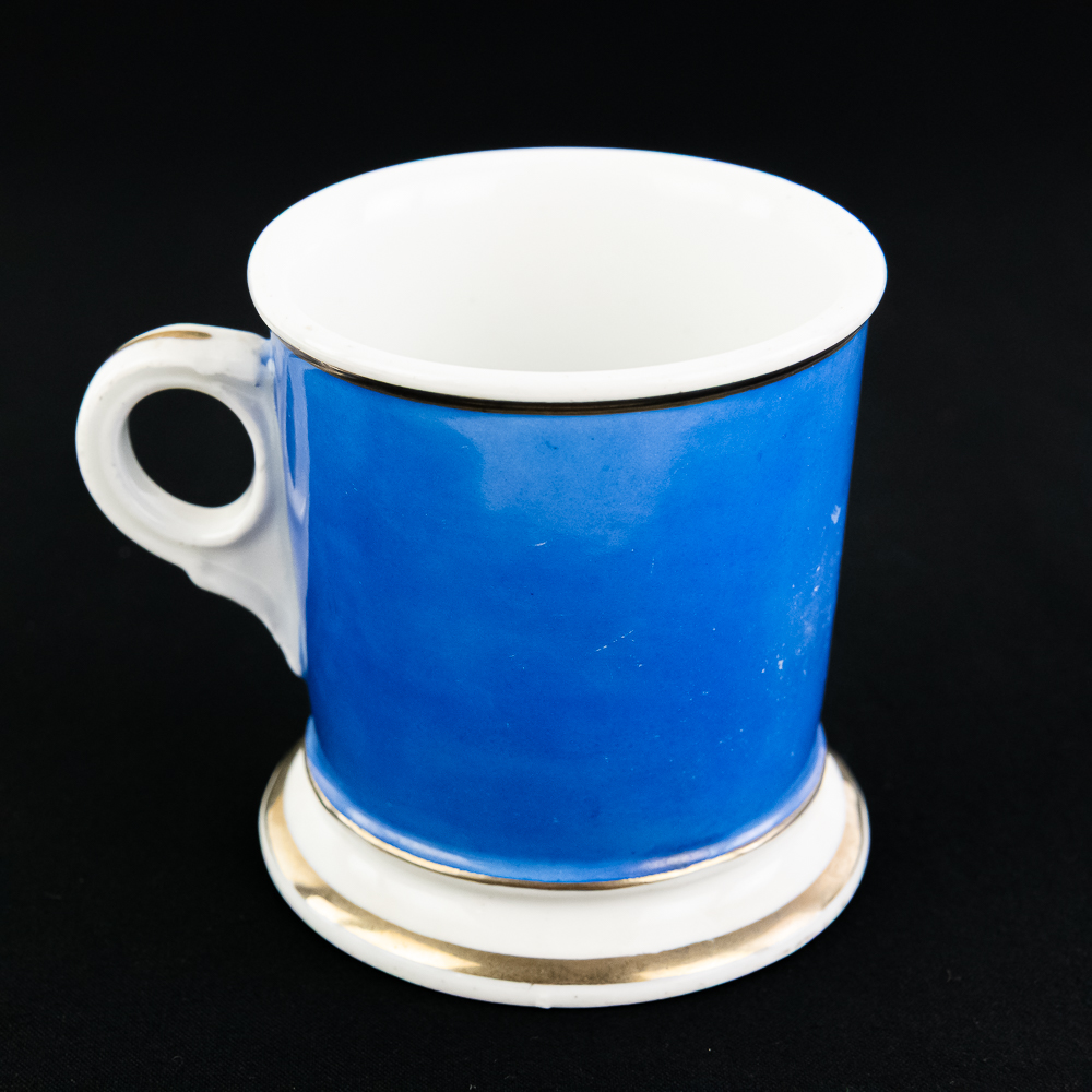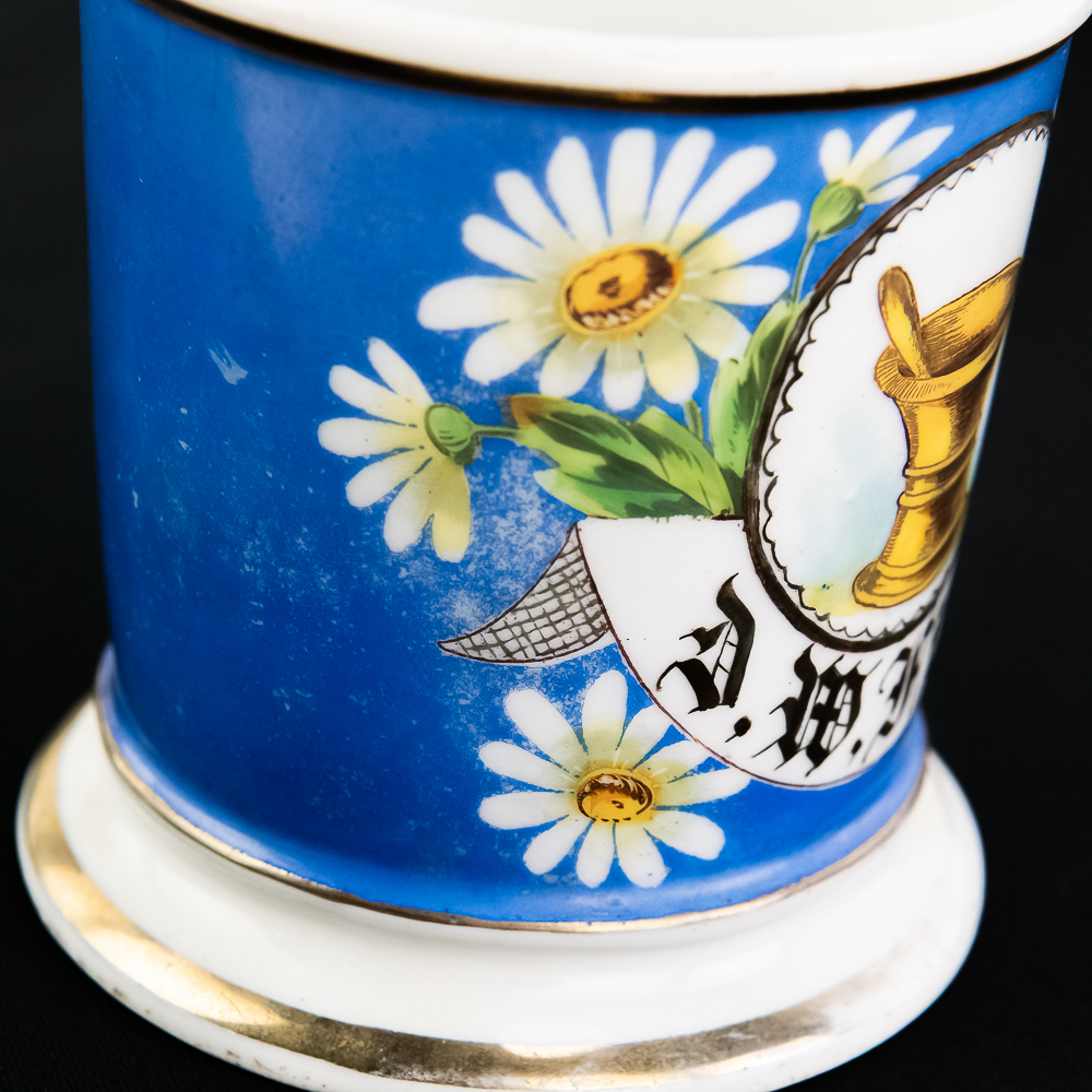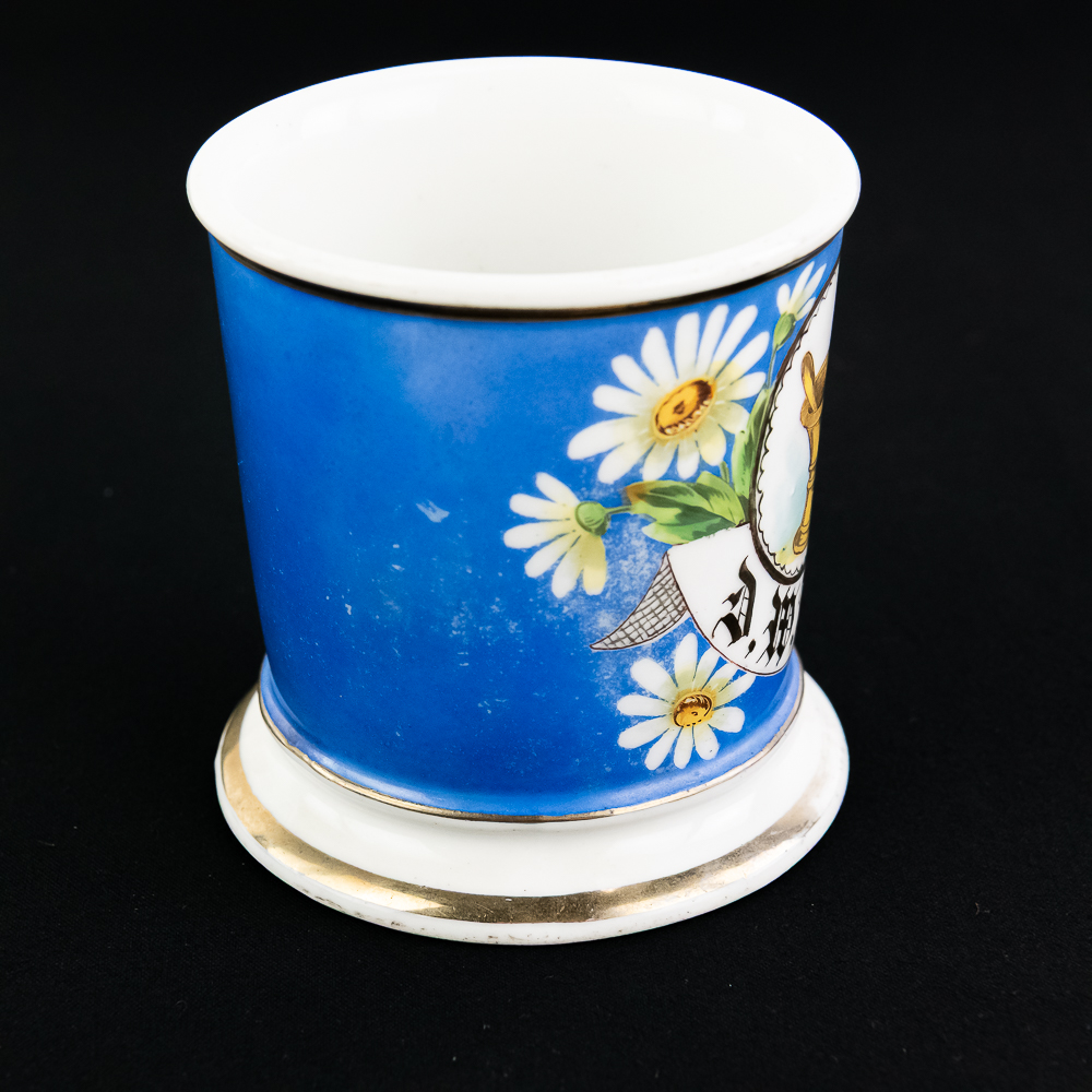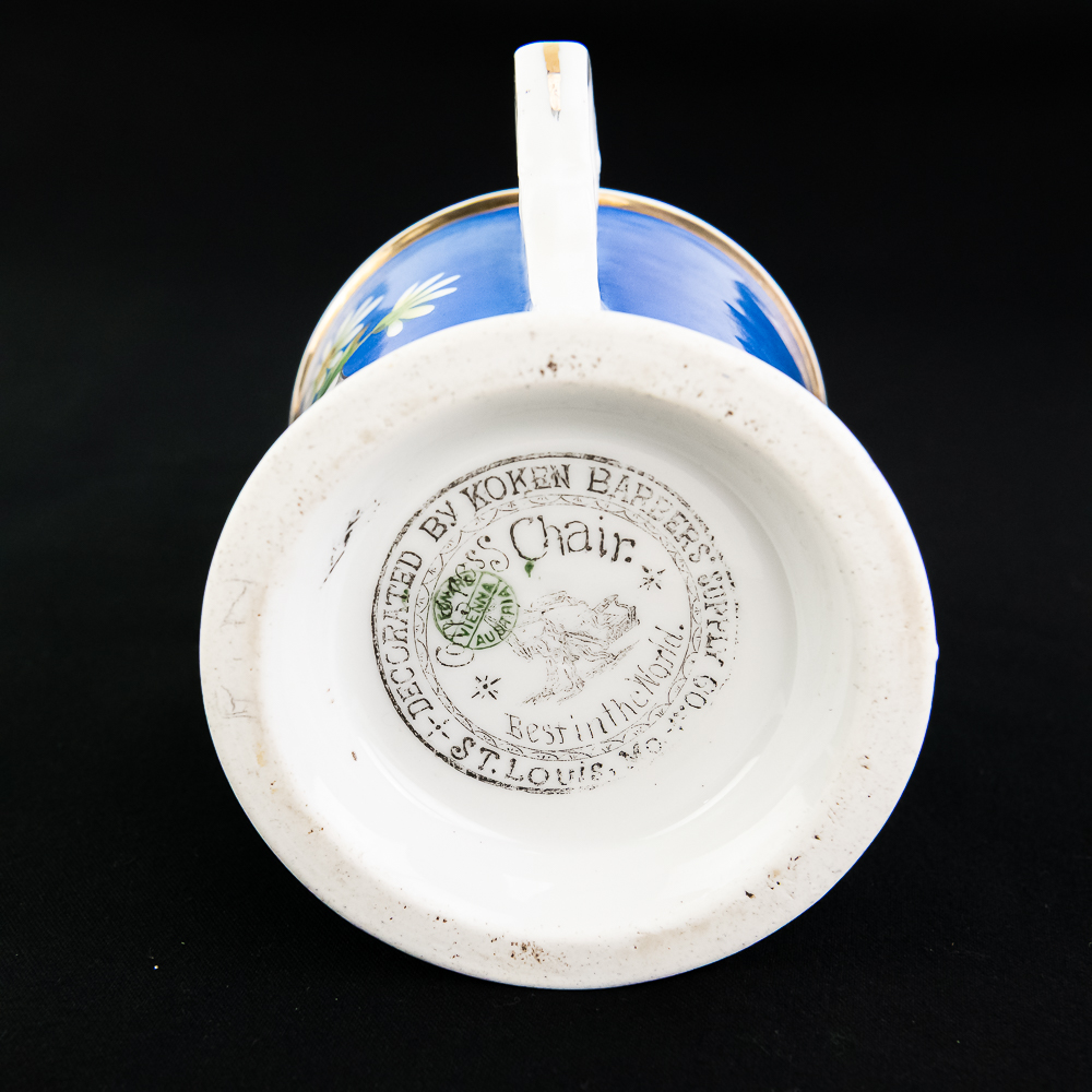 Shaving mug for a Pharmacist showing a mortar & pestle. In VG condition with no chips, cracks, or crazing. Stamped Koken Barber Supply St. Louis on bottom.