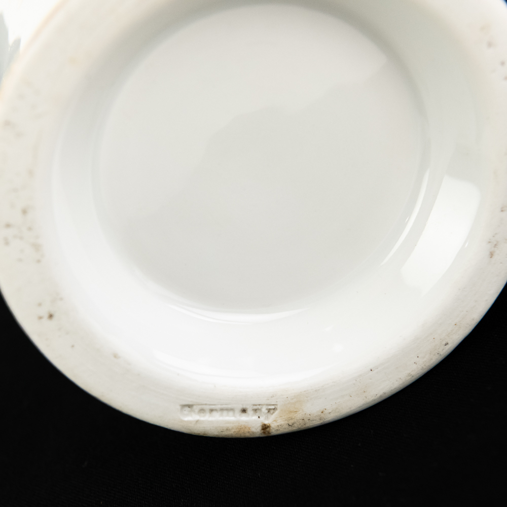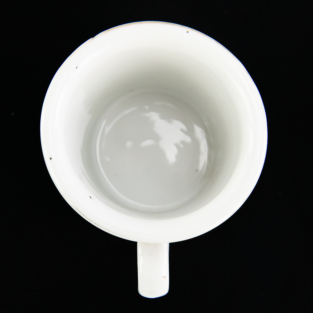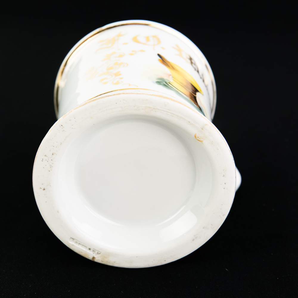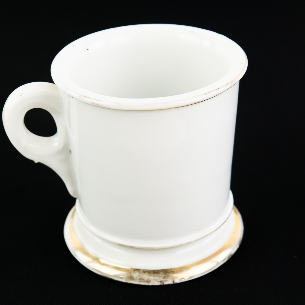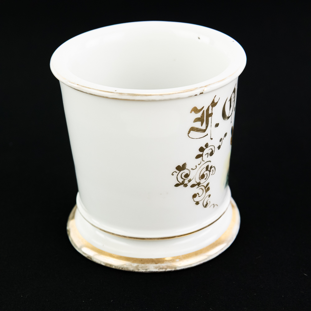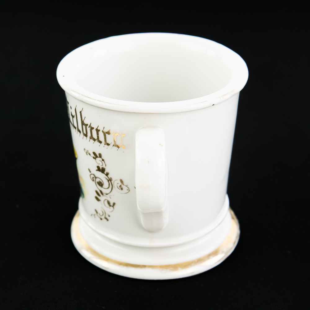 Shaving mug for a Pharmacist showing a mortar & pestle. In VG condition with no chips, cracks, or crazing. Incised Germany on bottom.