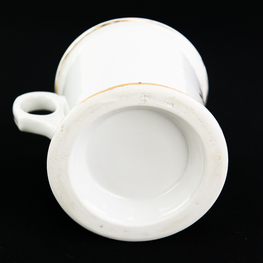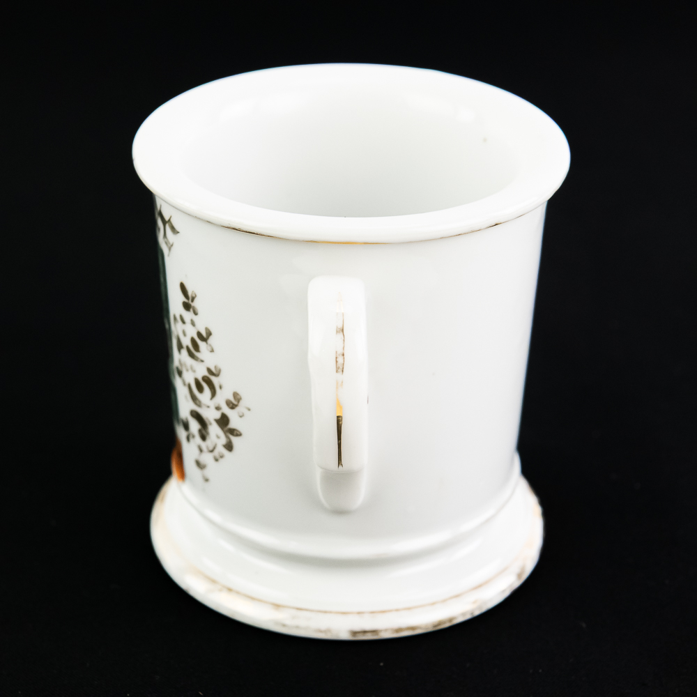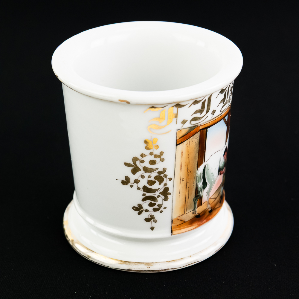 Shaving mug for a Farrier showing an anvil, forge, horse, and farrier. In VG condition with no chips, cracks, or crazing. Incised Germany on bottom.