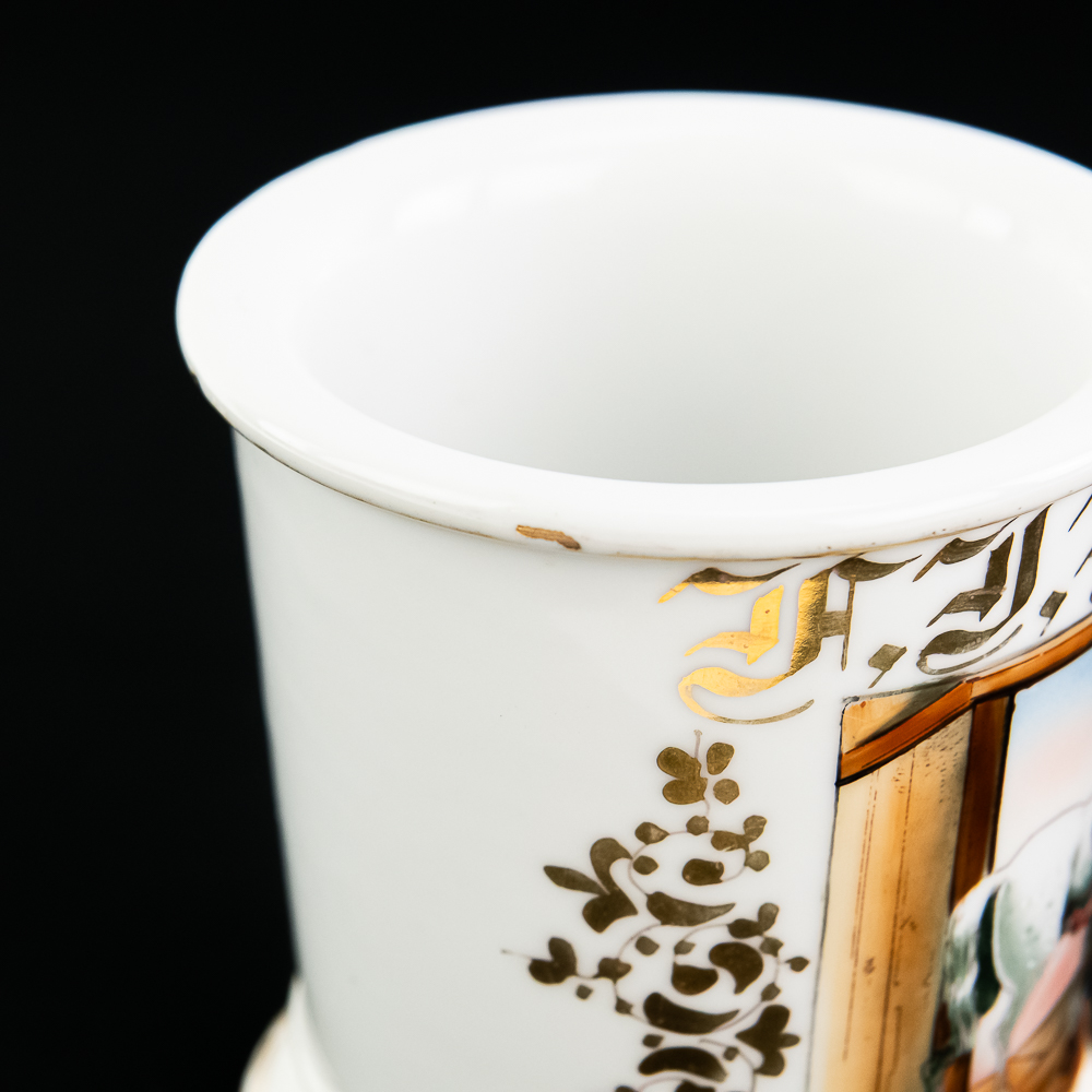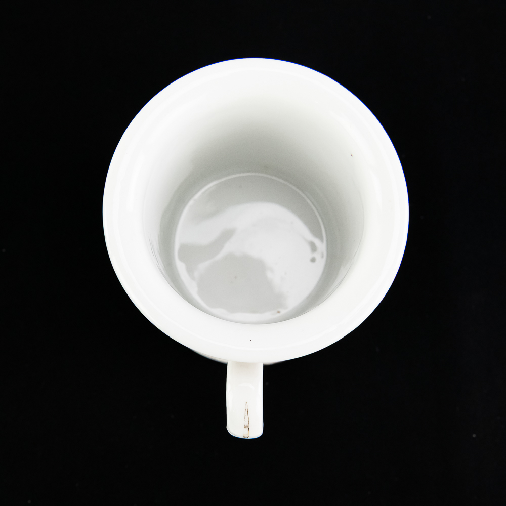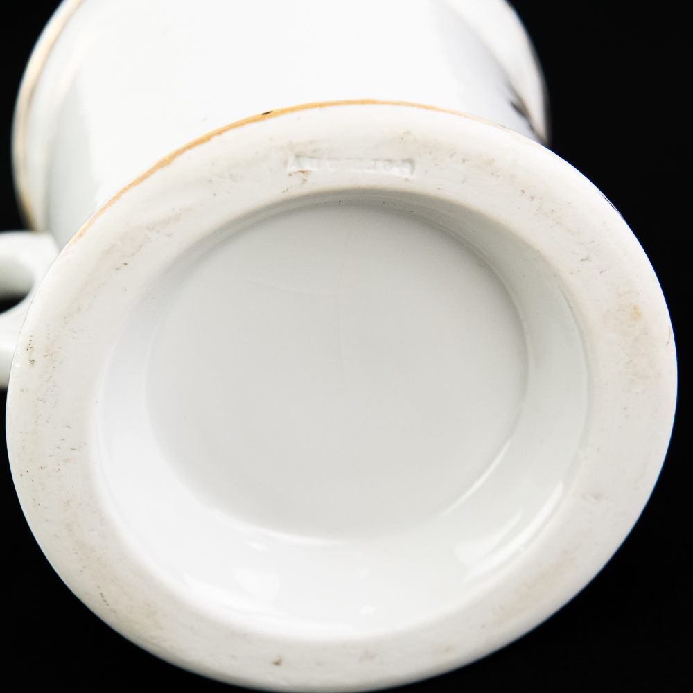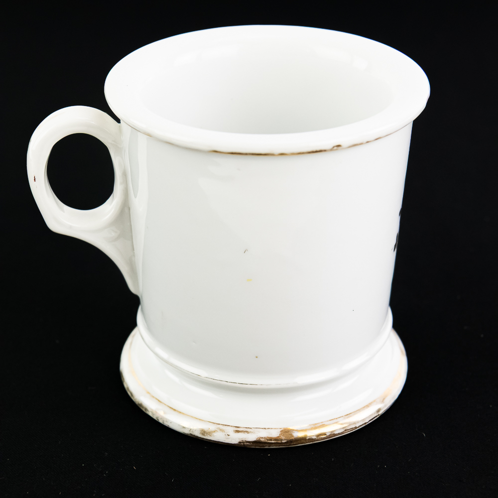 Shaving mug for a Farrier showing an anvil, forge, horse, and farrier. In VG condition with no chips, cracks, or crazing. Incised Germany on bottom.