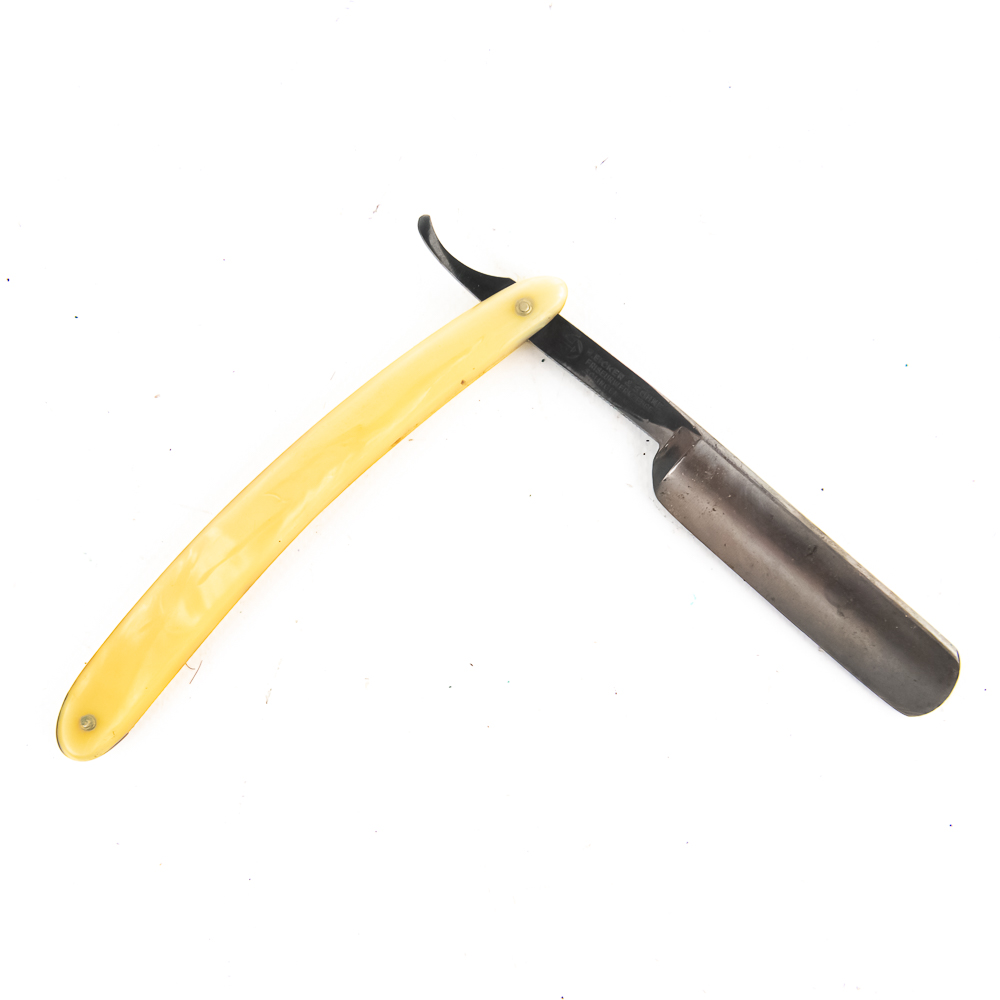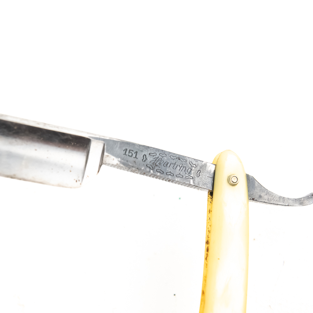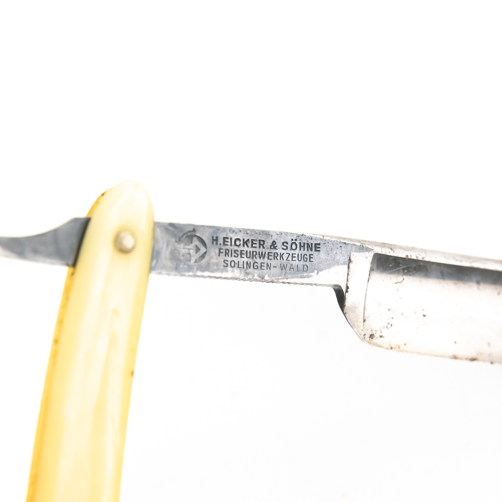 Vintage Straight Razor “151 Heartring” by H. EIcker & Sohne, with pearly celluloid scales. The face is blank, Tang reads “151 Heartring” encircled in hearts, and reverse reads “H. Eicker & Sohne Friseurwerkzeuge Solingen-Wald”. Blade is in overall fair condition, with tarnish noted. Original Box NOT included. See photos and bid accordingly.