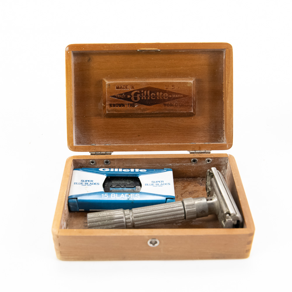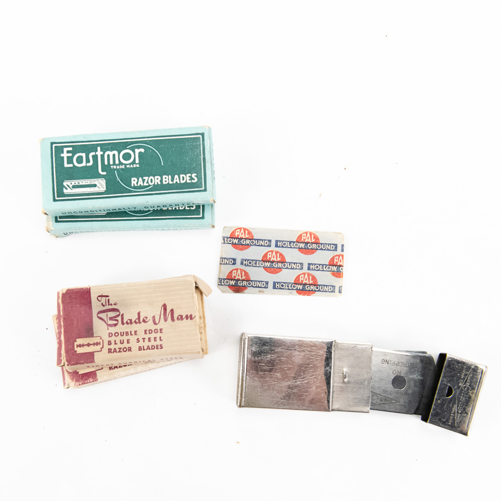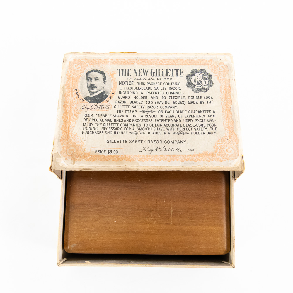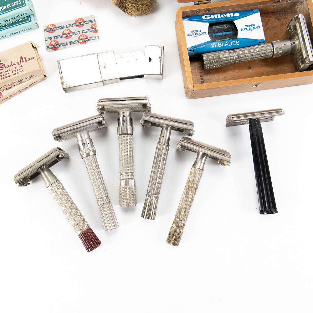 Vintage assortment of shaving related items featuring vintage razors, shaving cream brushes, razors many new in original box and “The New Gillette” razor with wood box and cardboard box (tattered missing a edge). Lots of fun, perfect addition to your collection, please use photos to judge condition and bid accordingly.