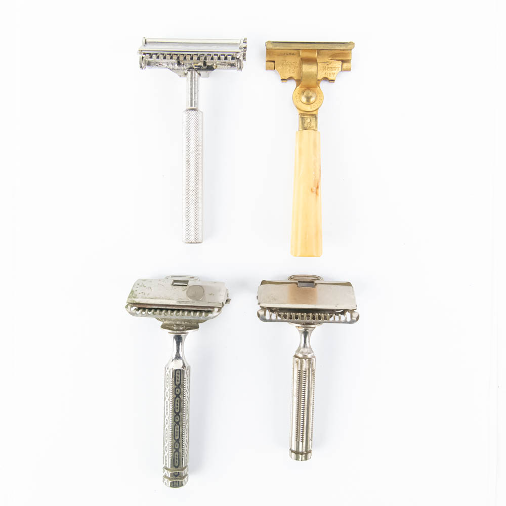 Includes two boxes of “Perfect” razor blade boxes with 20 boxes each, cover missing on one box, other one detached but present and 4 various razors, see photos.