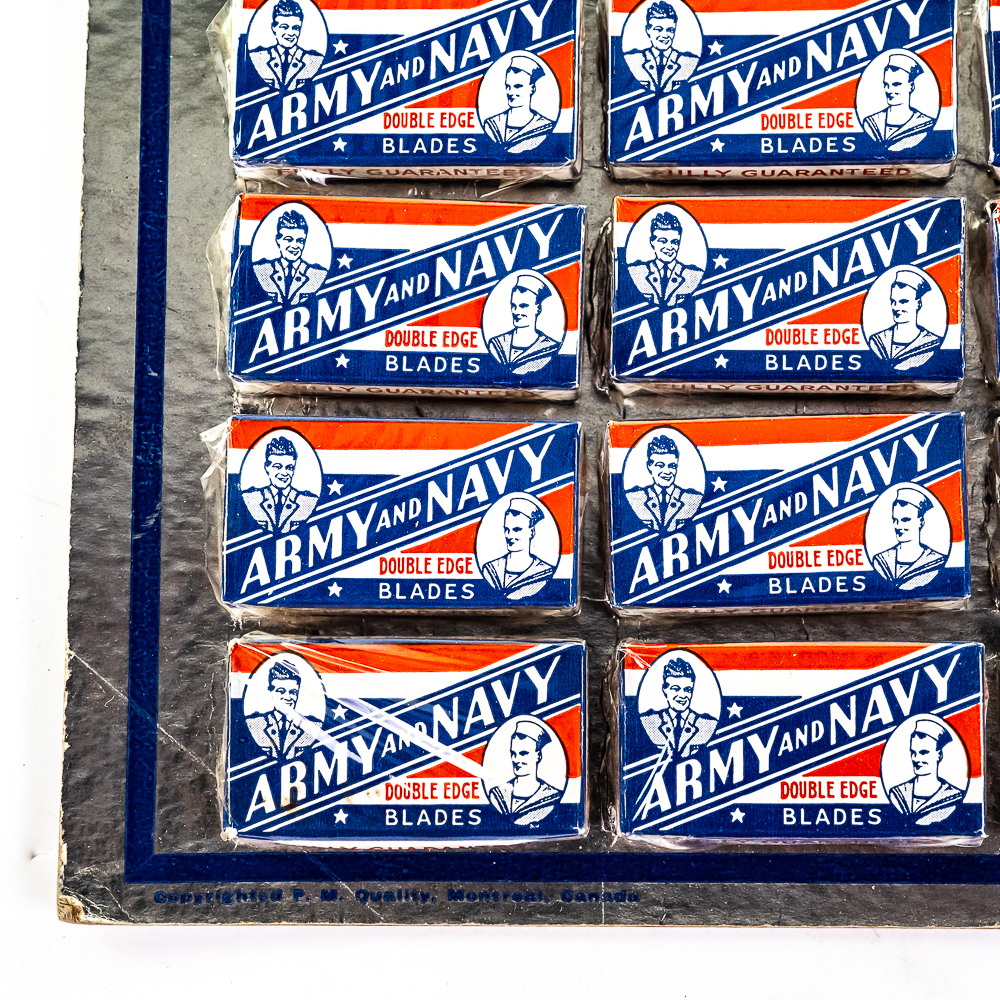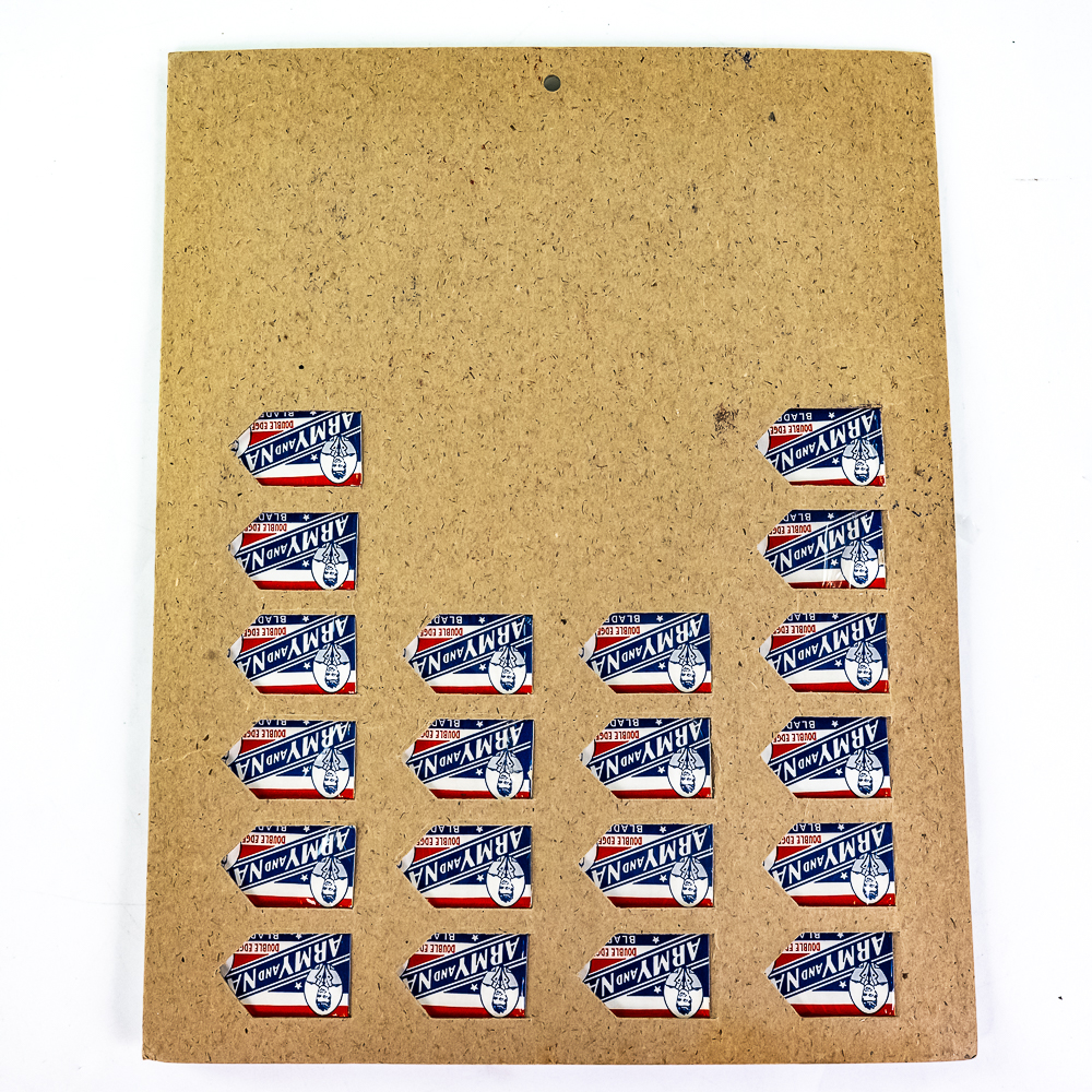 Vintage Army & Navy Blue Razor Blade Display, comes with 20 blade boxes, minor wear on corners, good condition, see photos, 10″ x 12 1/2″