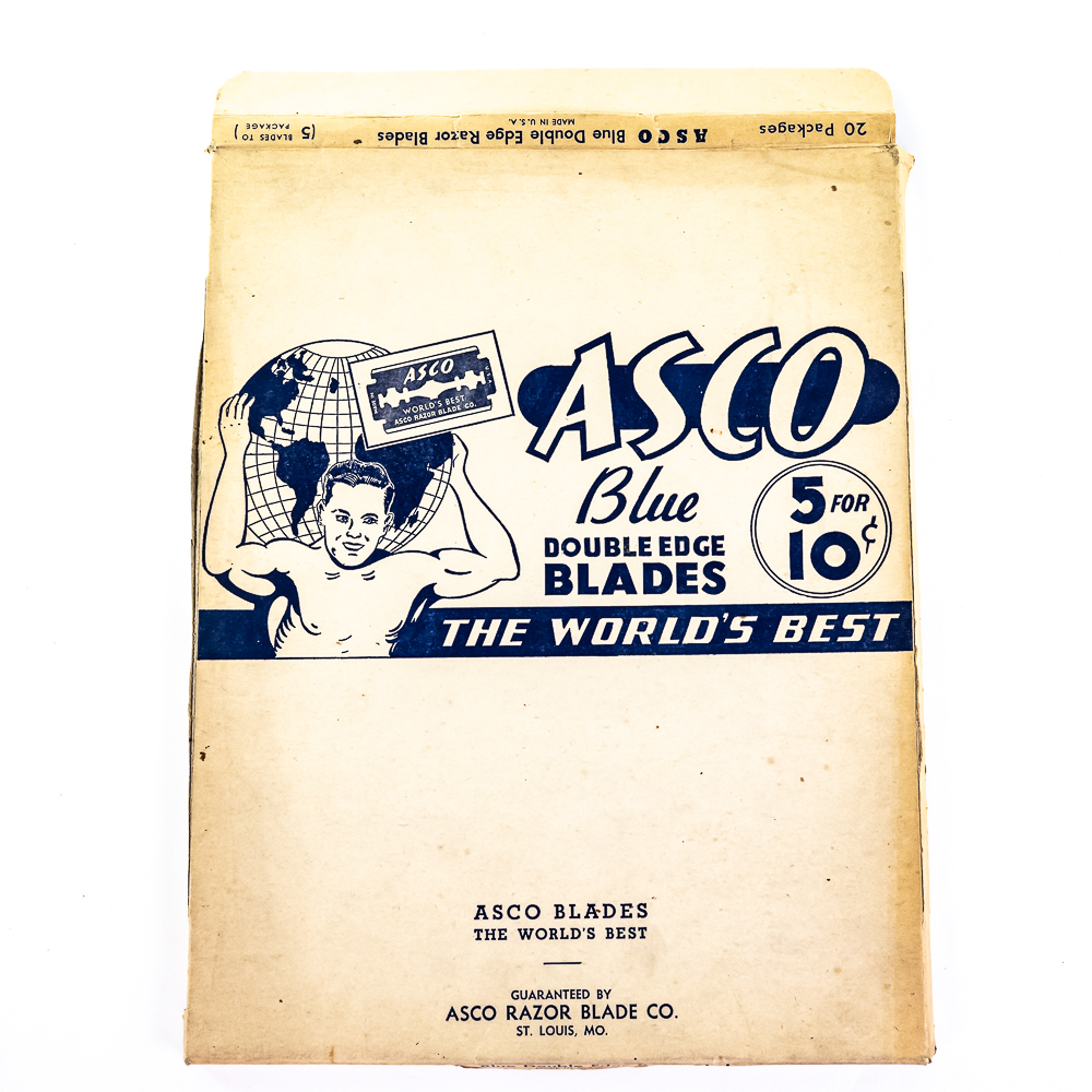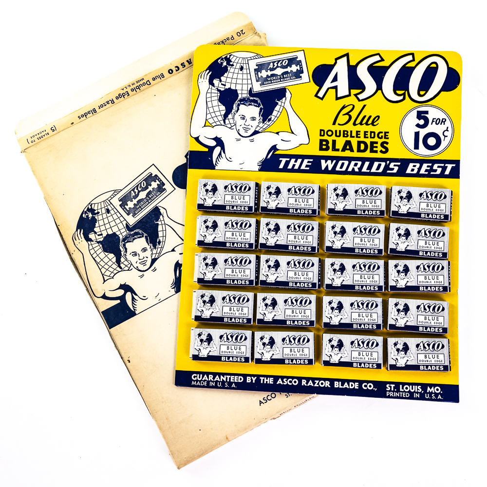 Vintage Asco Razor Blade Display, St. Louis, MO, comes with 20 blade boxes and original box, good condition, see photos, 9 1/2″ x 12″