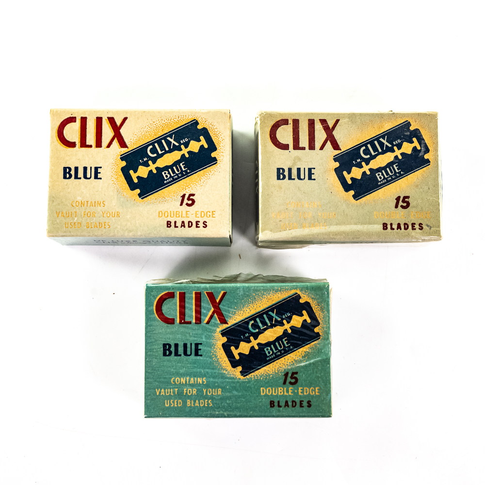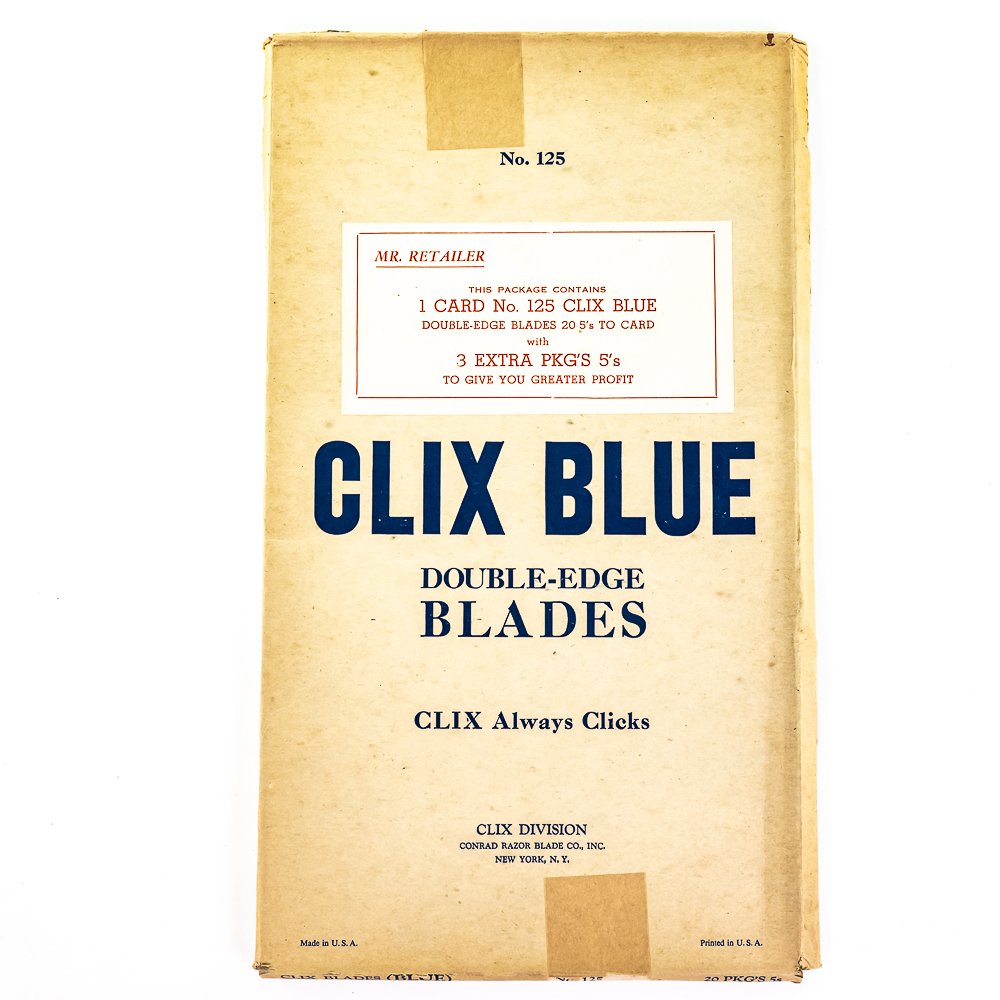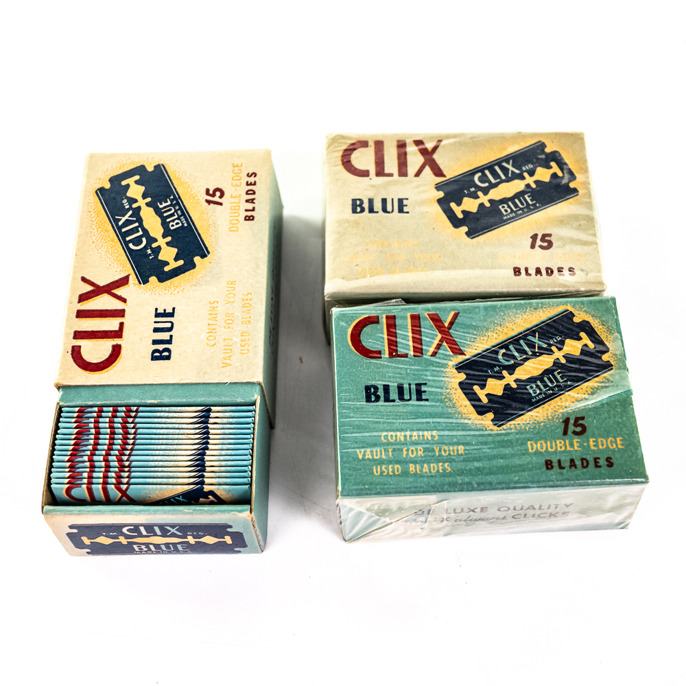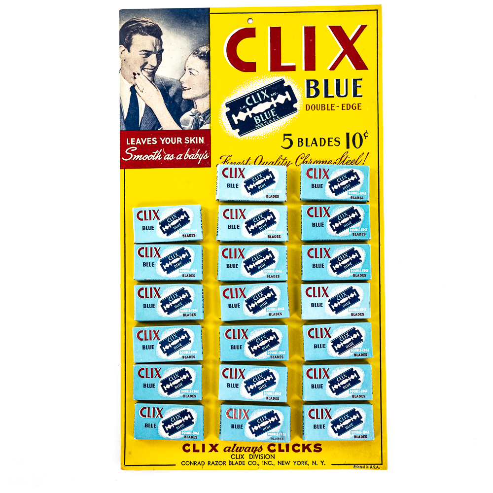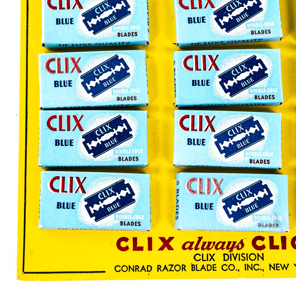 Vintage Clix Blue Razor Blade Display, New York, NY, comes with 20 blade boxes and 3 complete Clix Blue blade boxes, see photos.
