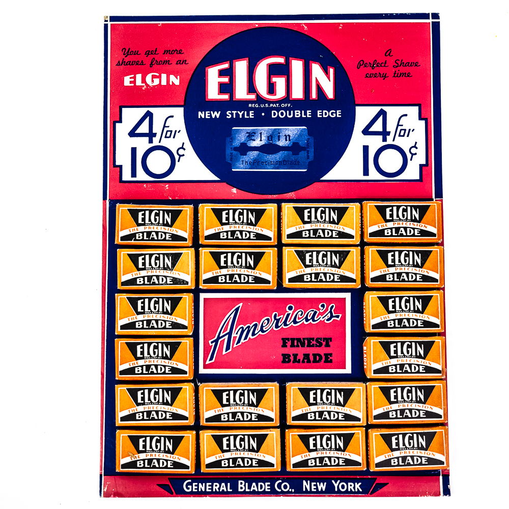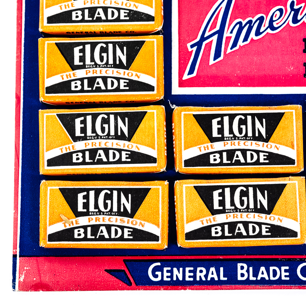 Vintage Elgin Razor Blade Display, New York, comes with 20 blade boxes, good condition, see photos, 9 1/2″ x 13″