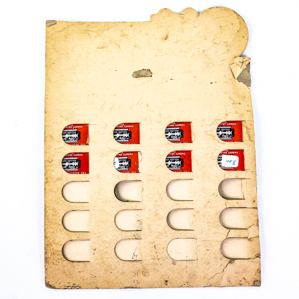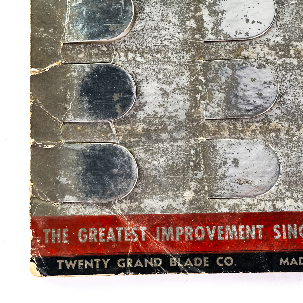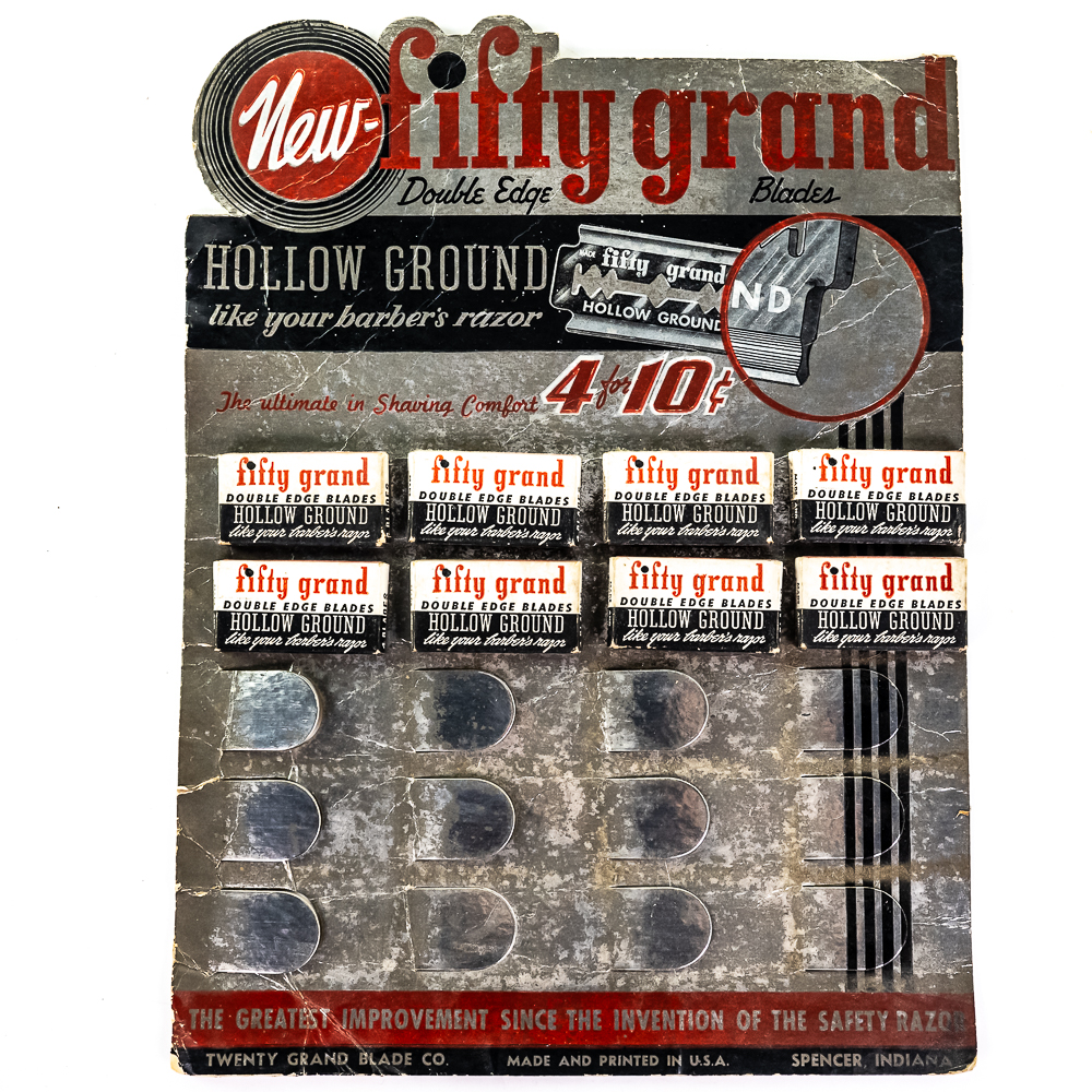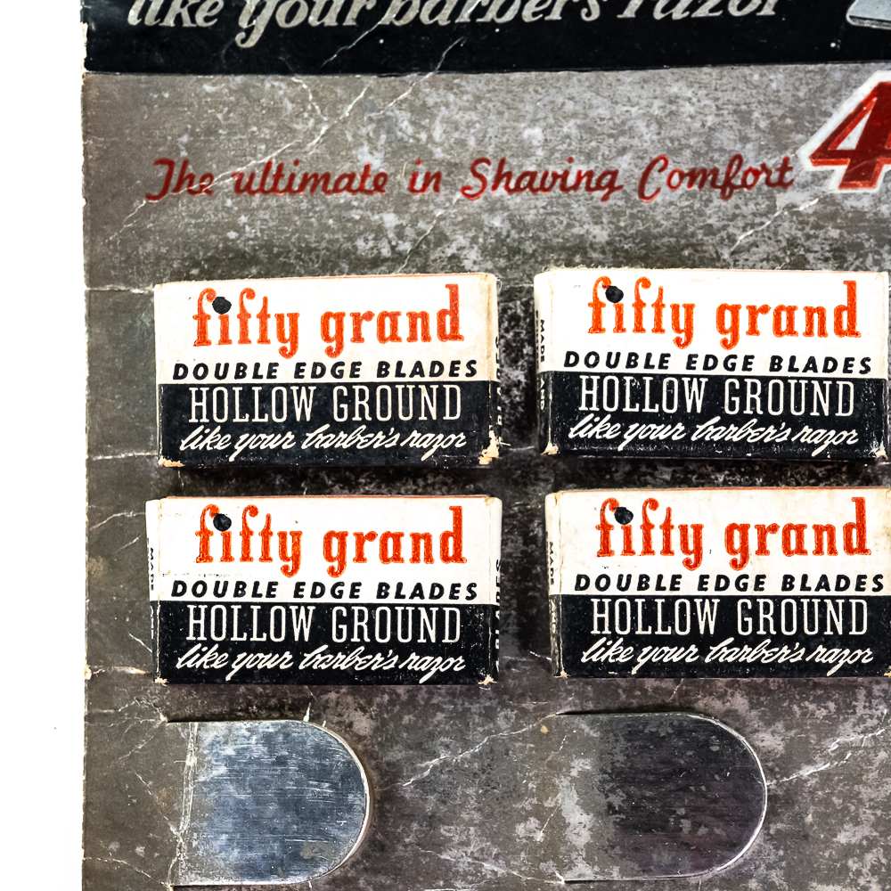 Vintage Fifty Grand Razor Blade Display, Spencer, IN, comes with 8 blade boxes, missing 12, shows wear, small creases and tears, graphics flaking, see photos, 9 1/2″ x 13″