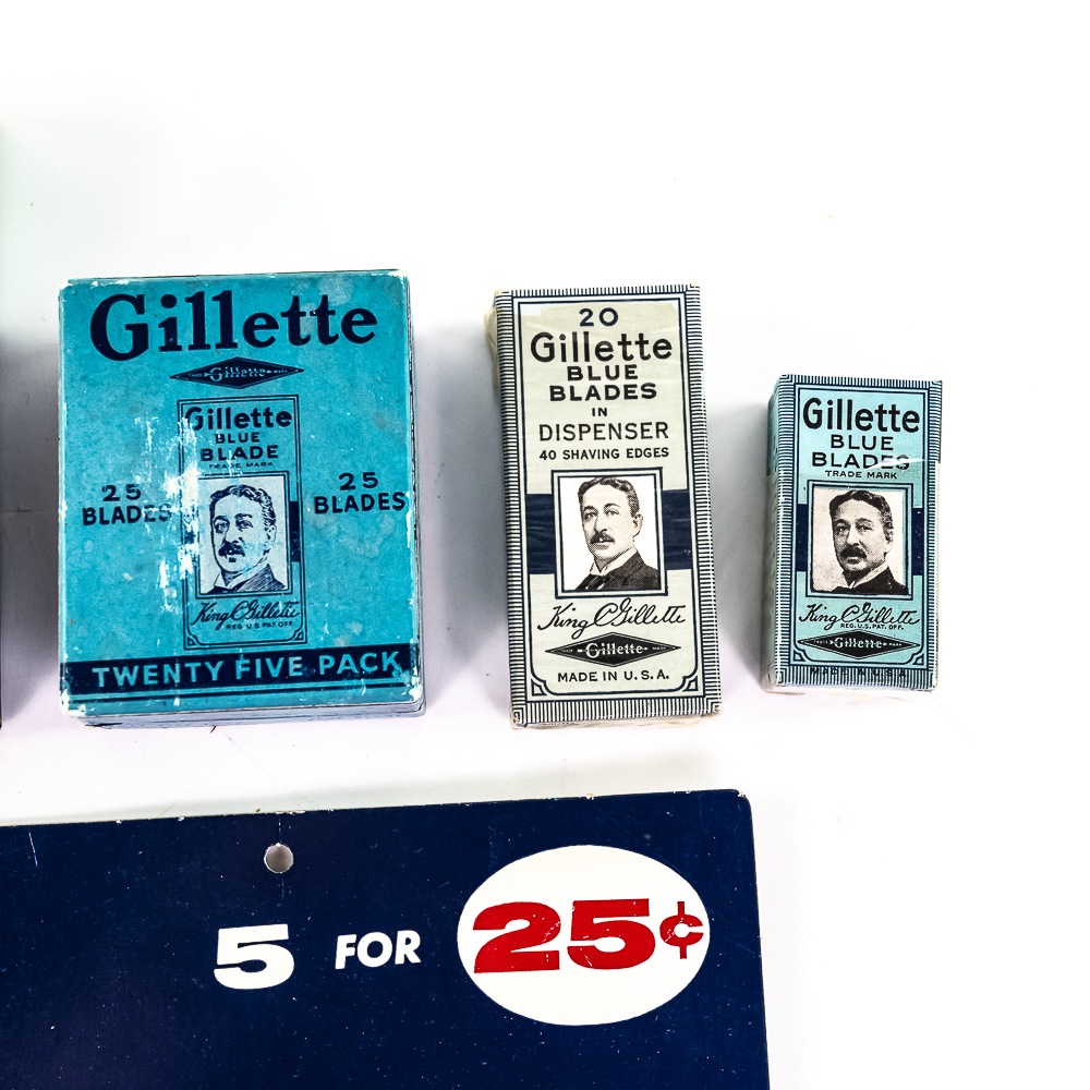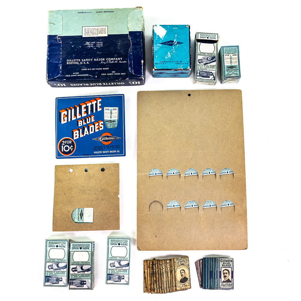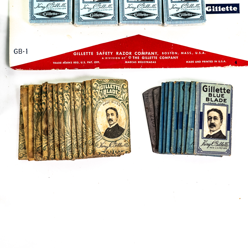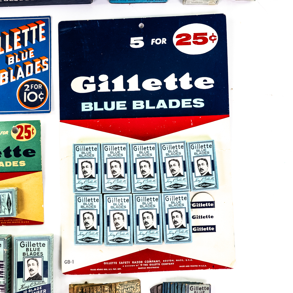 Lot of Gillette Razor Blade Display Items, Boston, MA includes display card with 9 blade boxes, one is missing, good condition, 4 NOS blade dispensers, one box of NOS blades, bag of loose blades, box of 25 blades and one display box of 10 blades boxes, see photos.