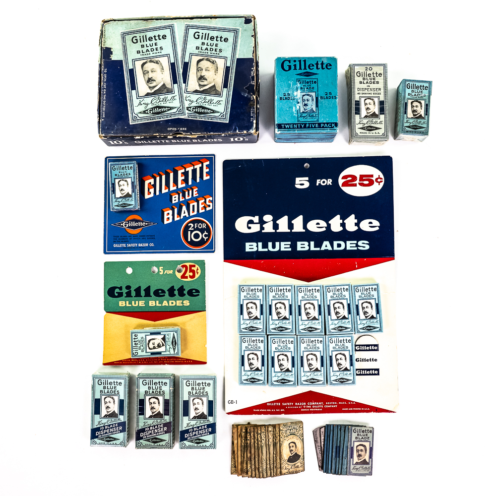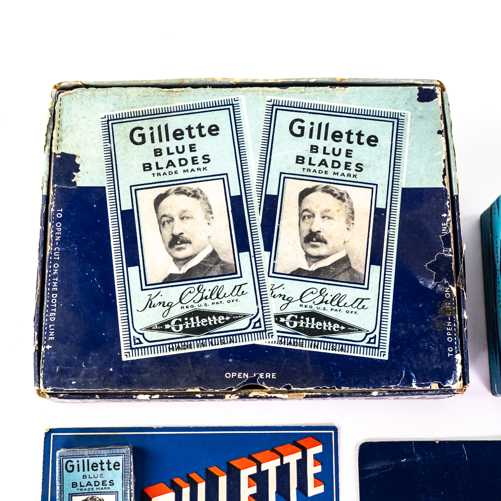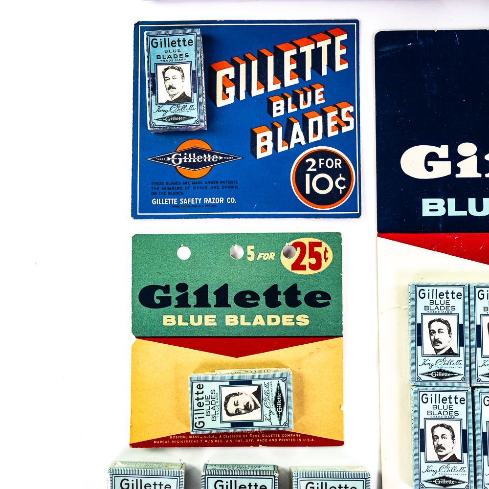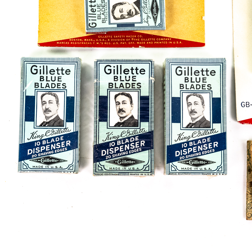 Lot of Gillette Razor Blade Display Items, Boston, MA includes display card with 9 blade boxes, one is missing, good condition, 4 NOS blade dispensers, one box of NOS blades, bag of loose blades, box of 25 blades and one display box of 10 blades boxes, see photos.