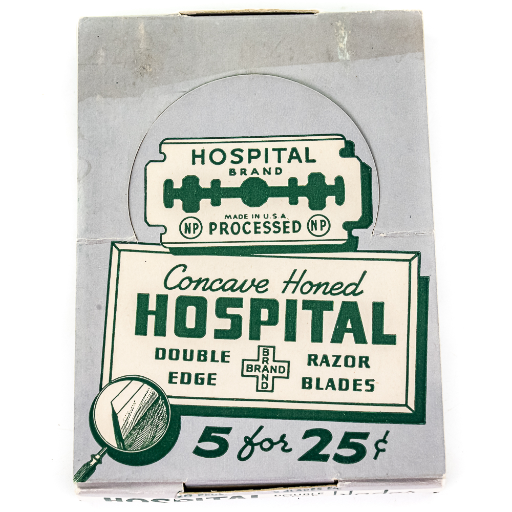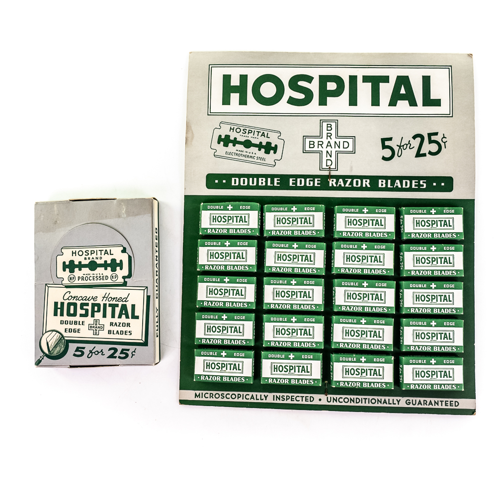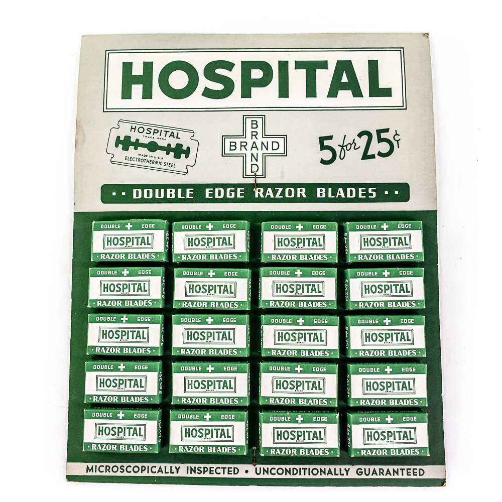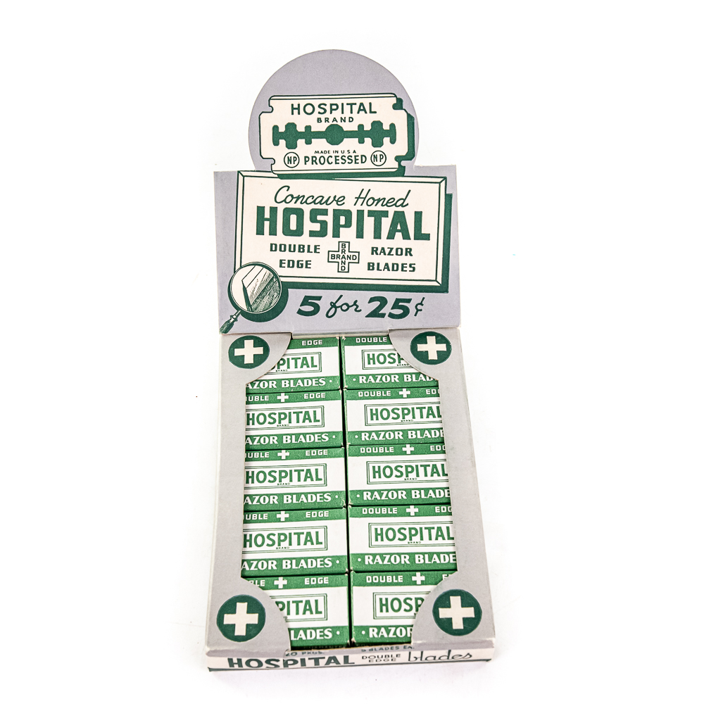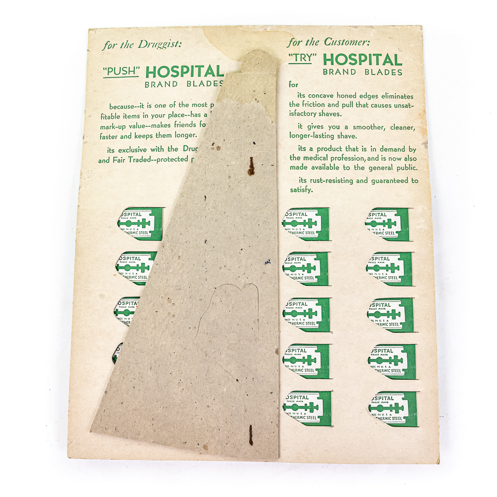 Vintage Hospital Razor Blade Display, USA, comes with 20 blade boxes, good condition, see photos, includes one box of Hospital Double-Edge Blades, 20 boxes inside, includes original box, 10″ x 12 1/2″