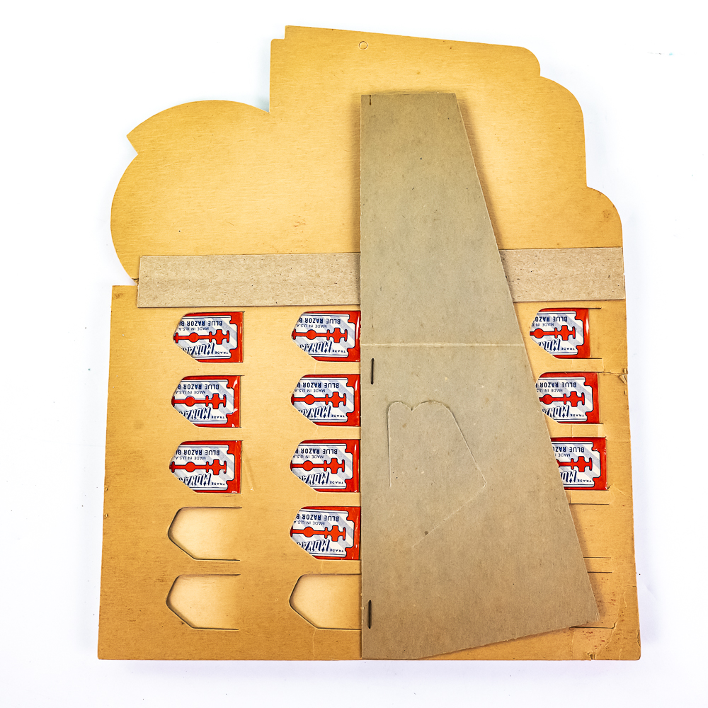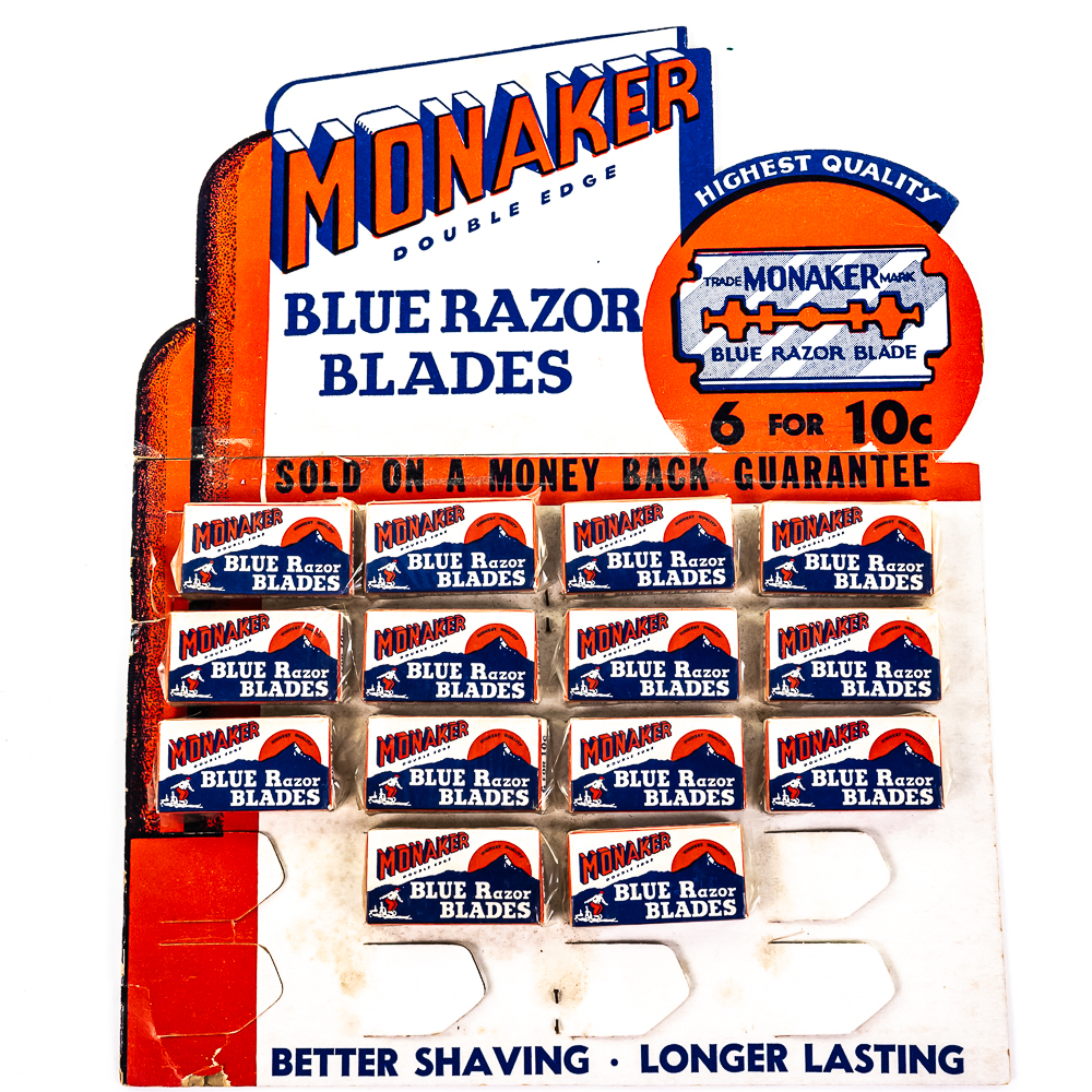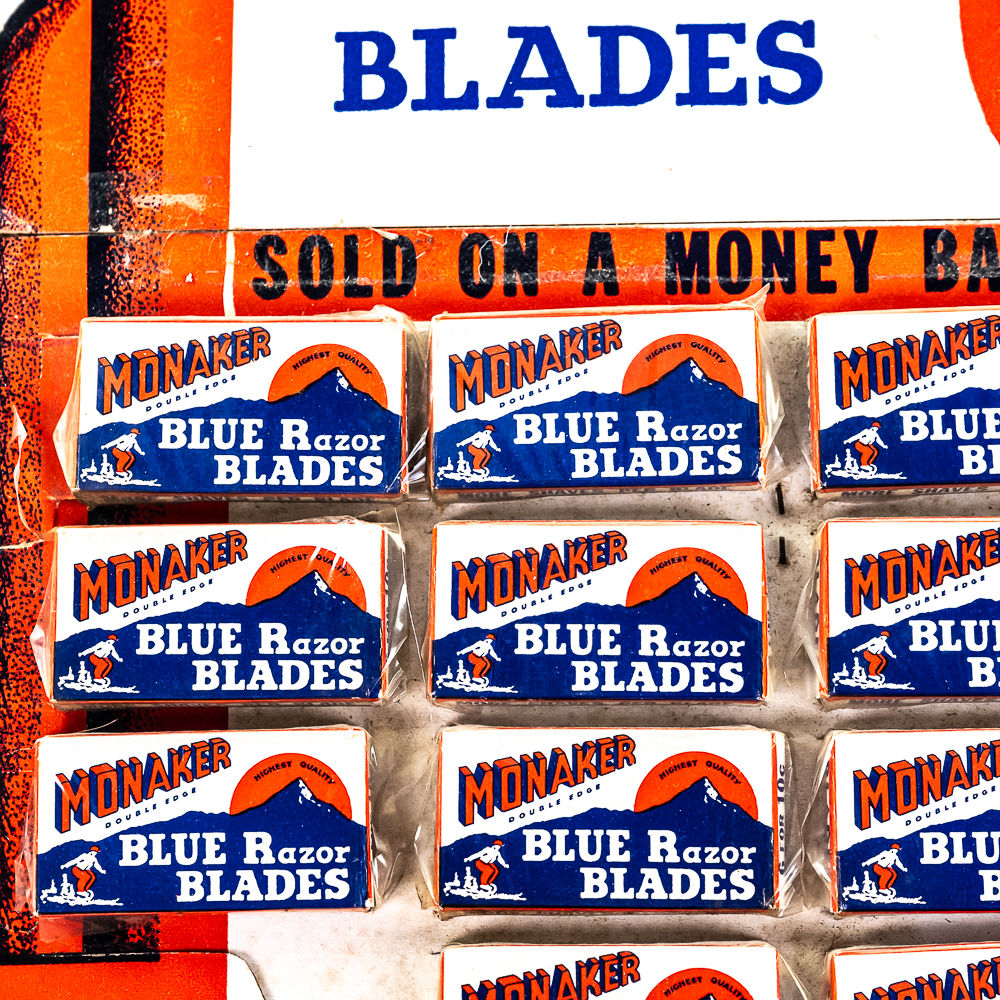 Vintage Monaker Razor Blade Display, comes with 14 blade boxes, missing 6, show some wear, small rip at bottom, see photos, 10″ x 12″
