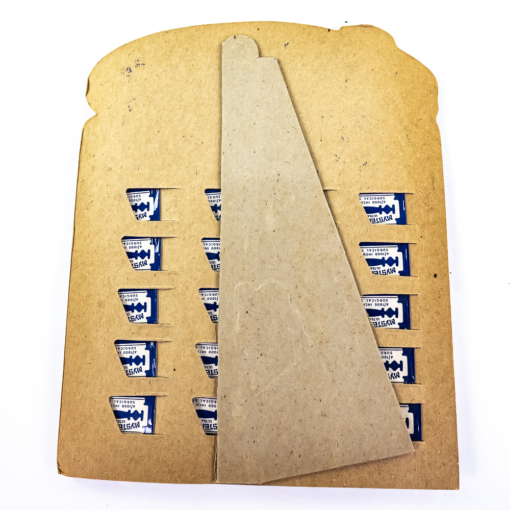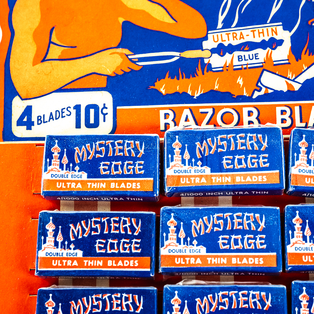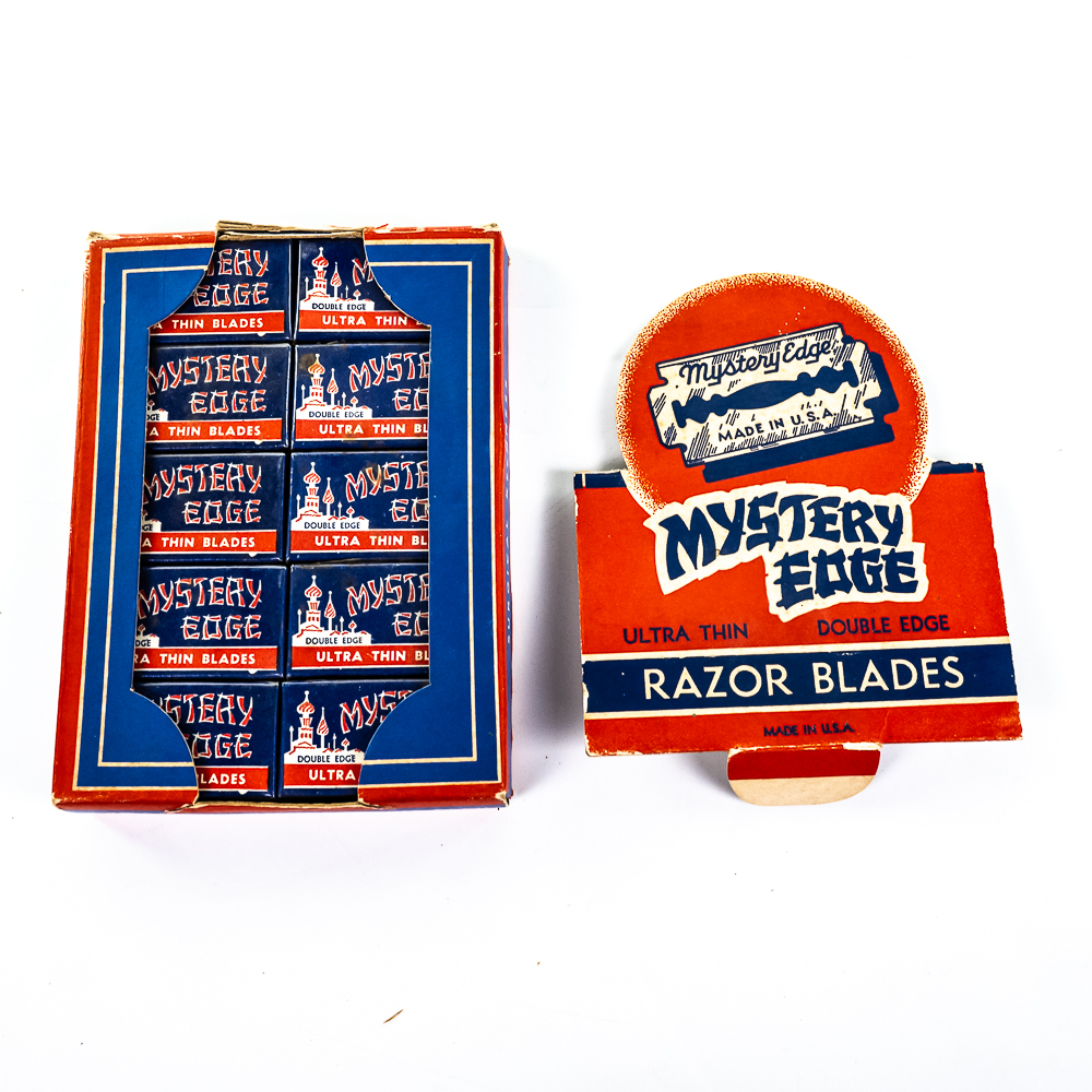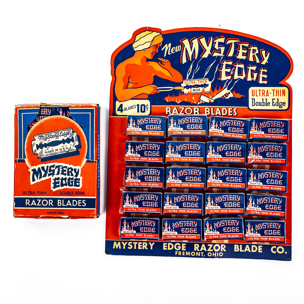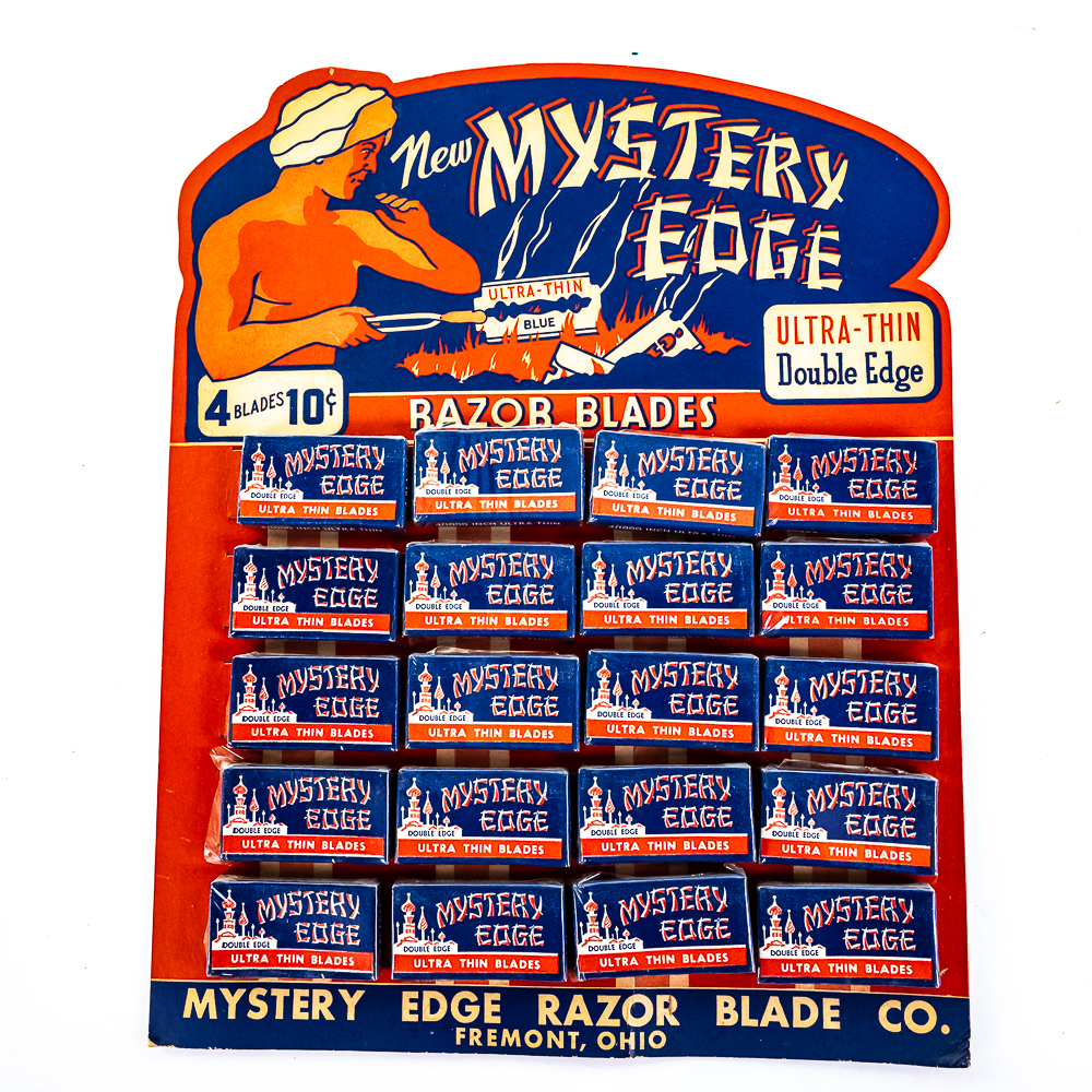 Vintage Mystery Edge Razor Blade Display, Fremont, OH, comes with 25 blade boxes, minor wear around edges, includes a box of Mystery Edge Double Edge Blades, 20 boxes inside, lid is torn, see photos, 10 1/2″ x 13″