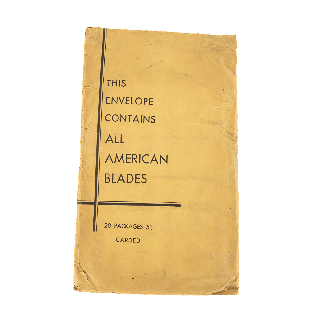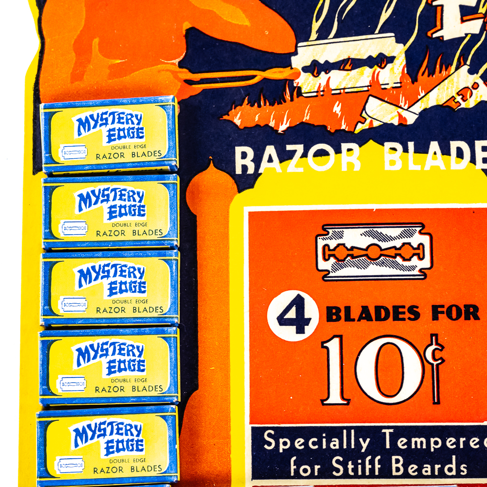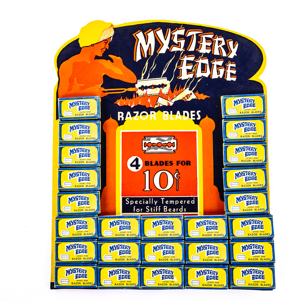 Vintage Mystery Edge Razor Blade Display, Fremont, OH, comes with 25 blade boxes, good condition, includes a box of Mystery Edge Double Edge Blades, 20 boxes inside, top of lid is missing, also includes one additional blade display in poor condition with 6 blade boxes, see photos, 10 1/2″ x 13″