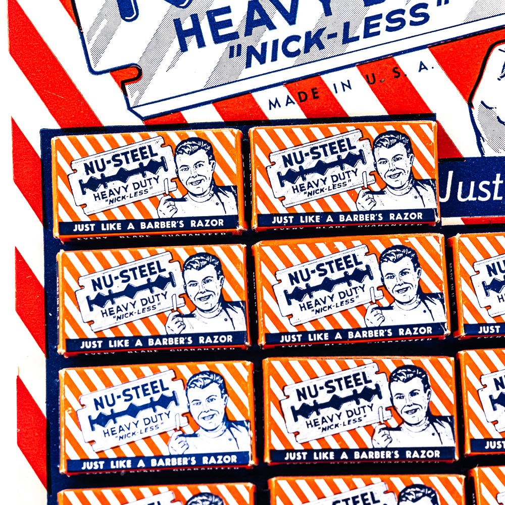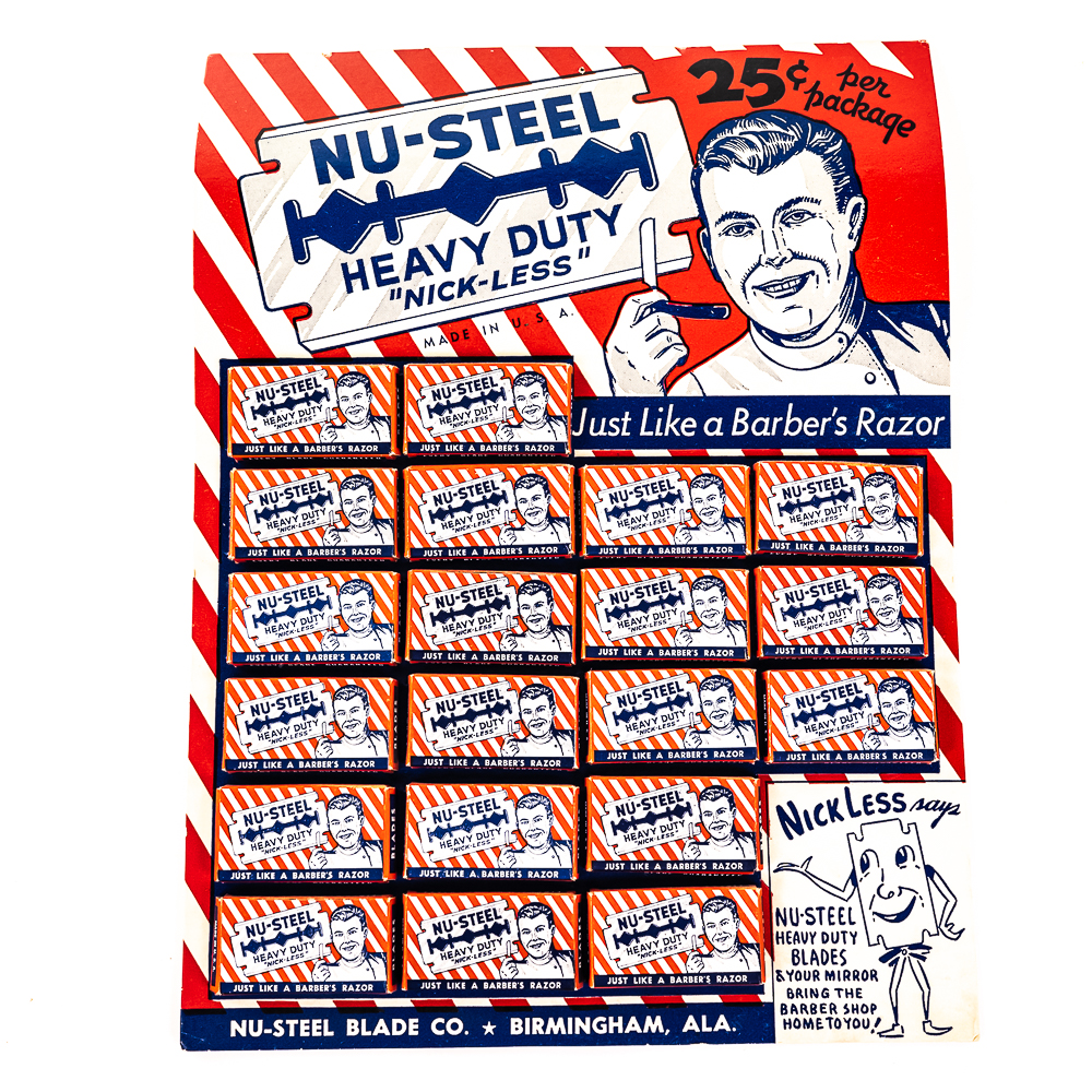 Vintage Nu-Steel Razor Blade Display, Birmingham, AL, comes with 20 blade boxes, good condition, see photos, 9 1/4″ x 12 1/2″