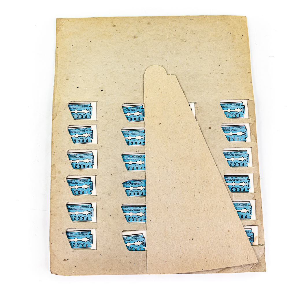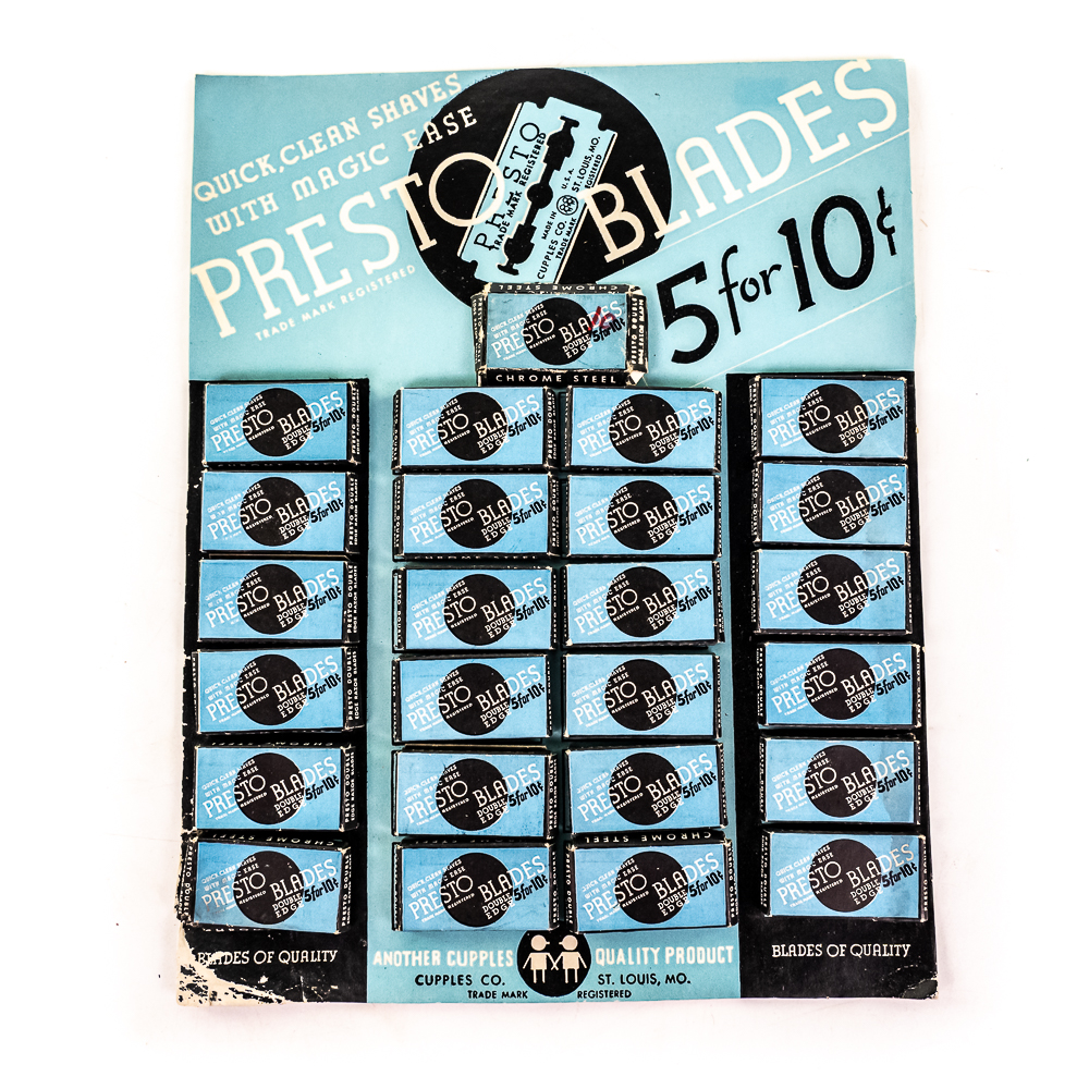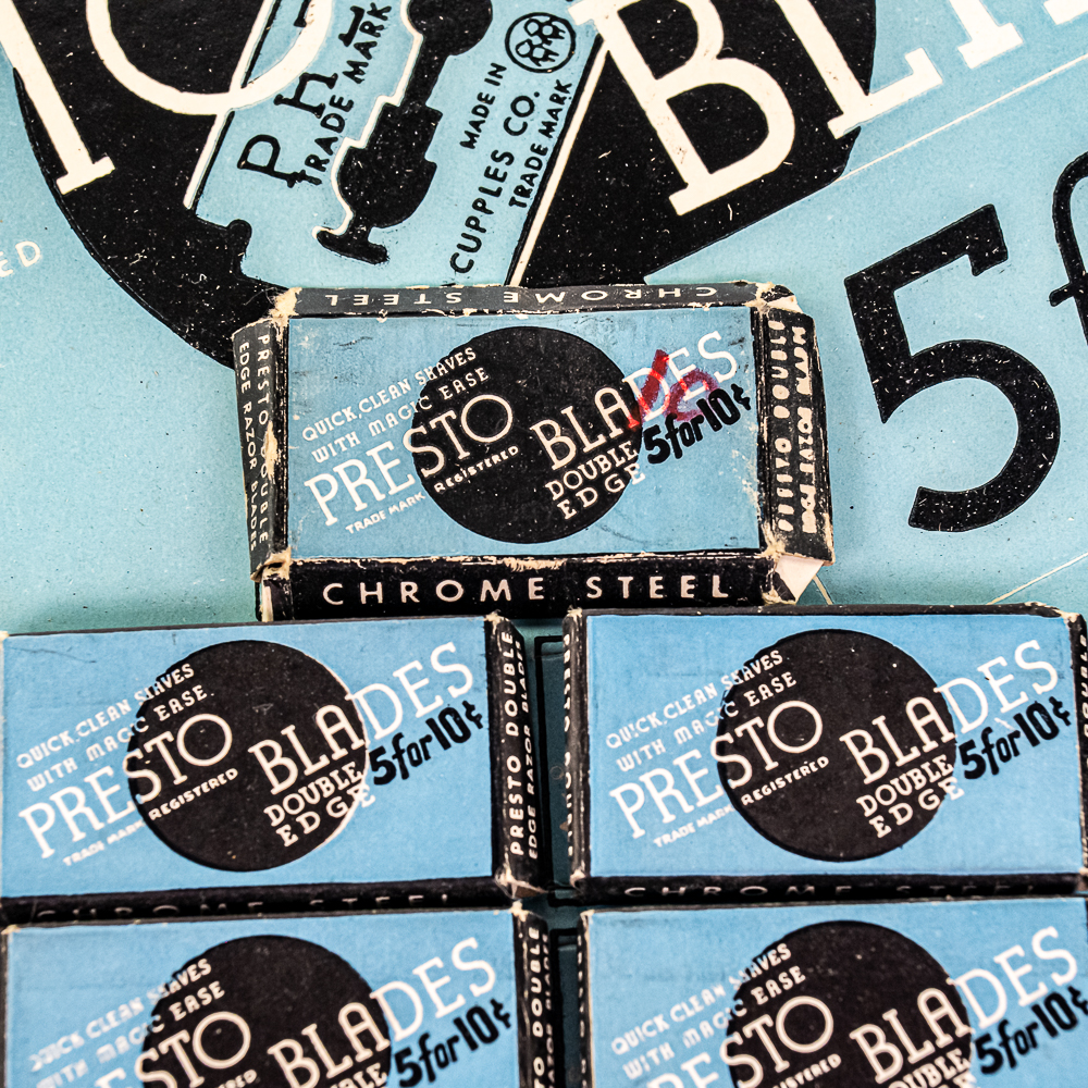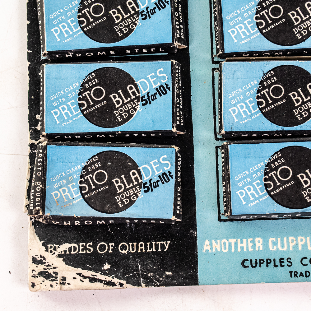 Vintage Presto Razor Blade Display, Cupples, CO, comes with 25 blade boxes, one has a red Sharpie mark on it, shows wear around the edges, small tear on left side, see photos, 10″ x 13″