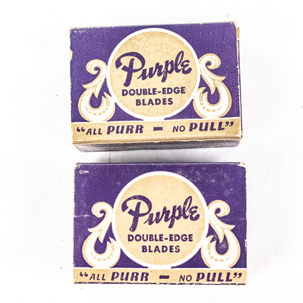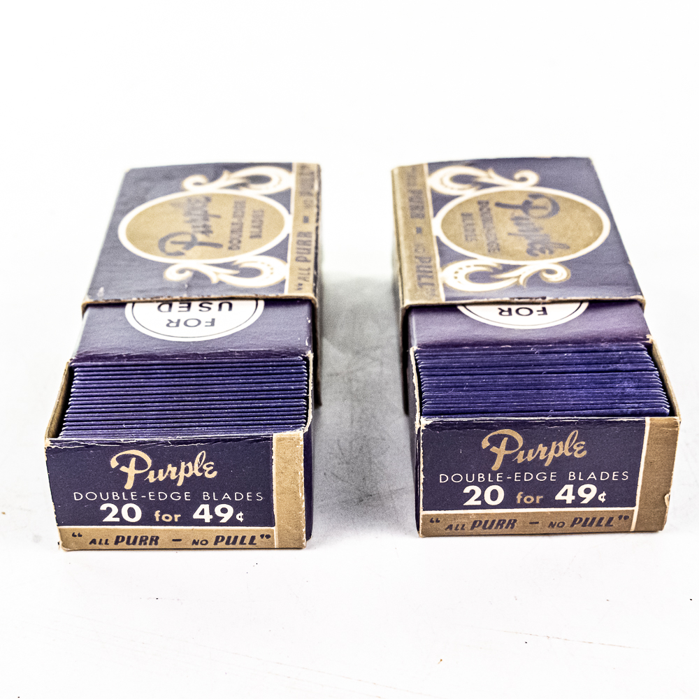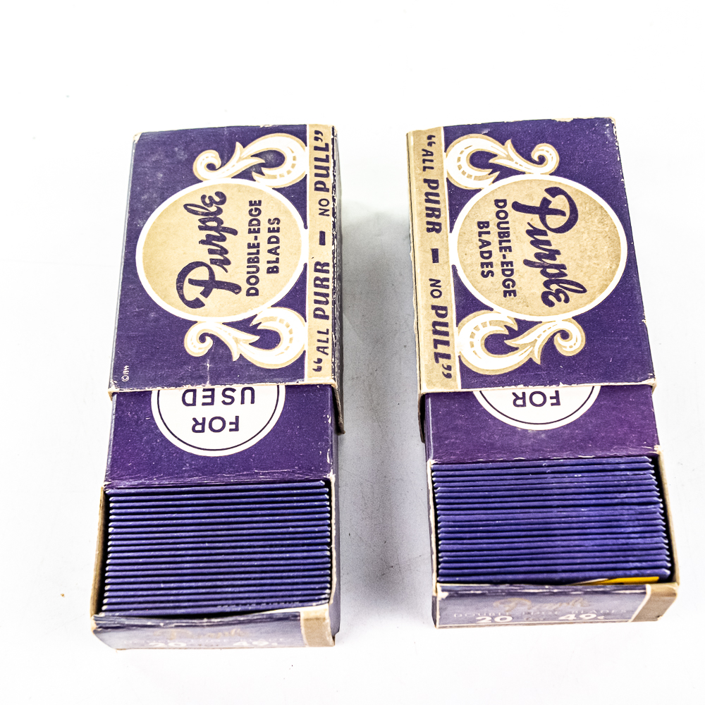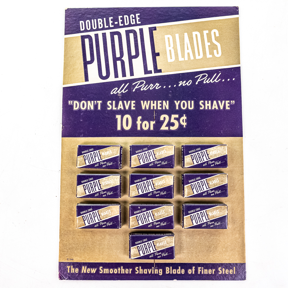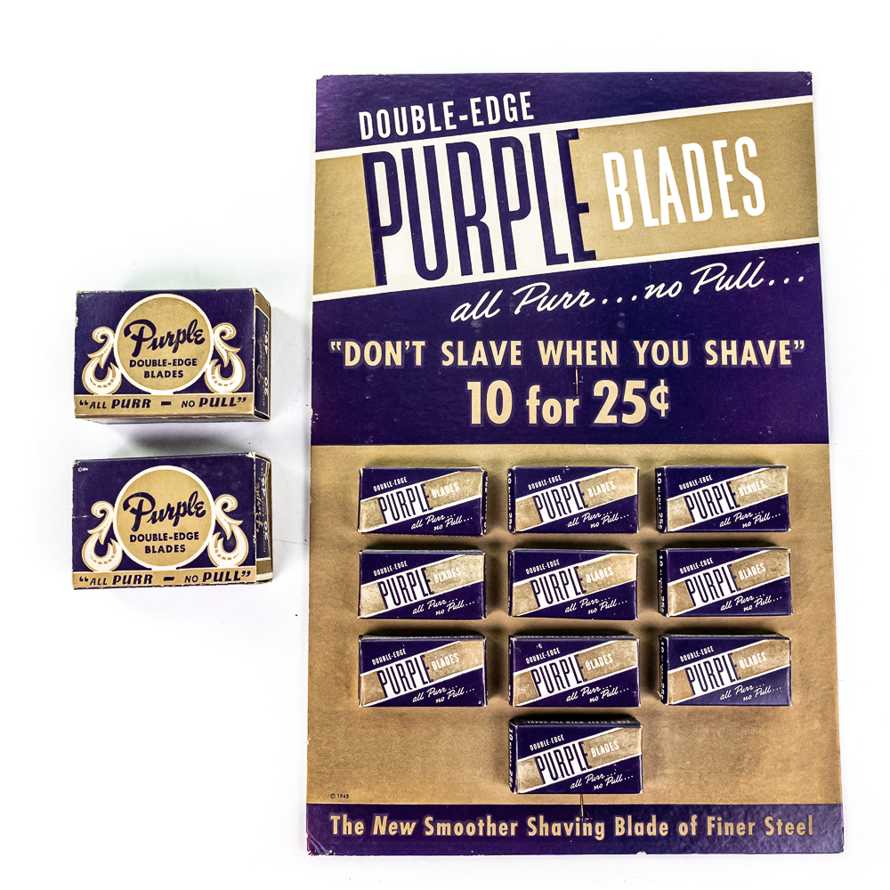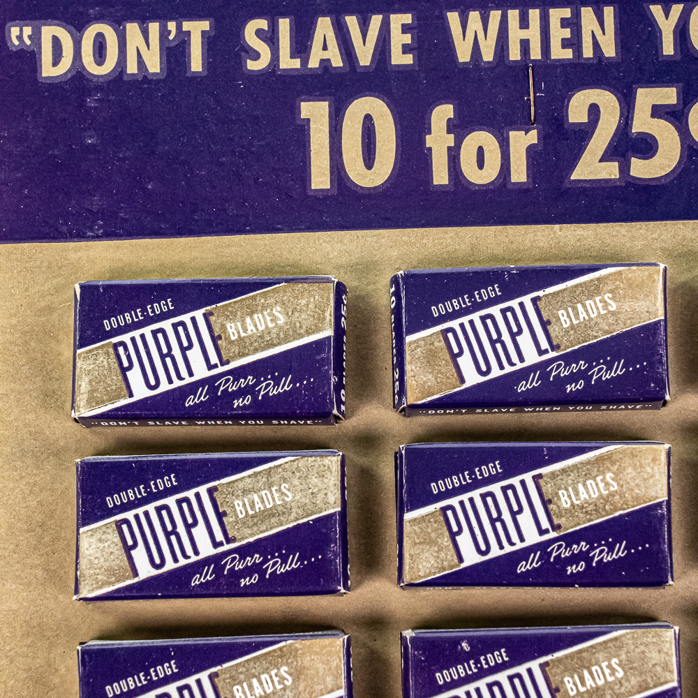 Vintage Purple Razor Blade Display, comes with 10 blade boxes, good condition, includes two boxes of Purple Double Edge Blade boxes, both have 20 blades in each, see photos, 8 3/4″ x 13″