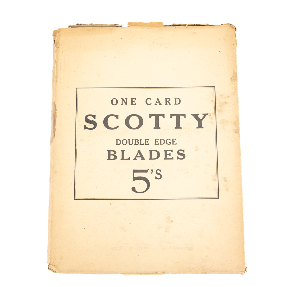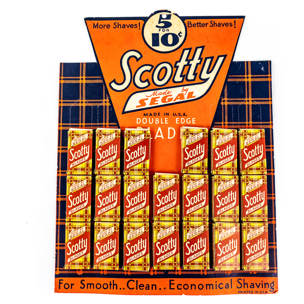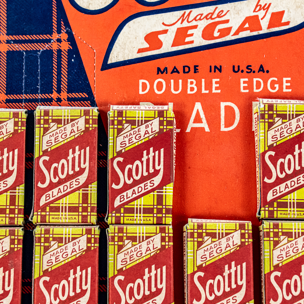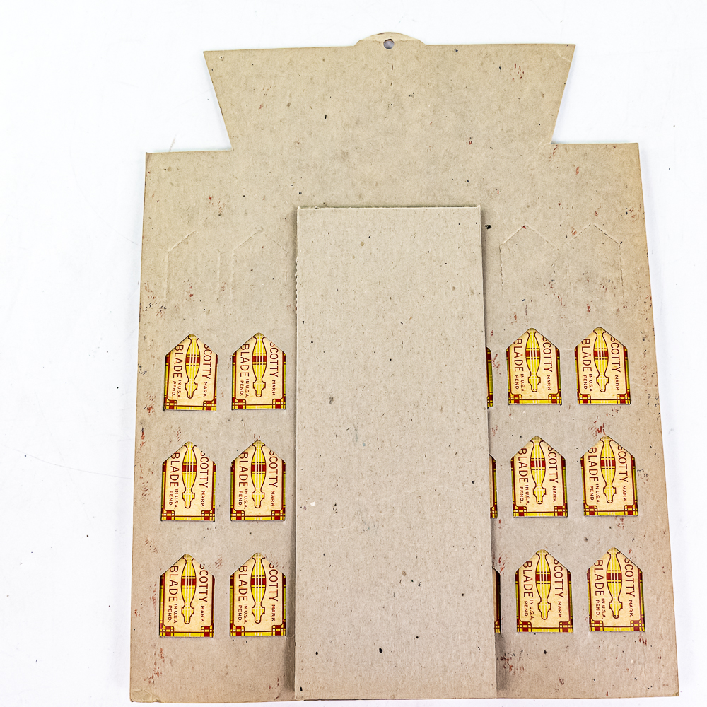 Vintage Scotty Razor Blade Display, comes with 20 blade boxes, minor wear around edges, includes original box, see photos, 10″ x 13″